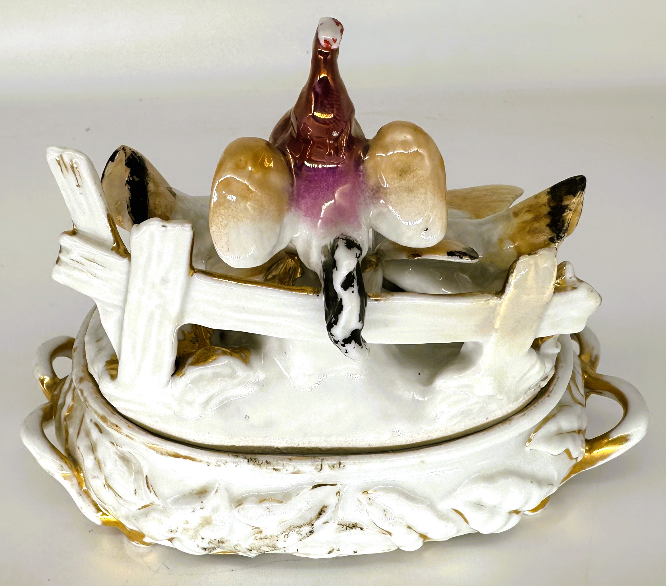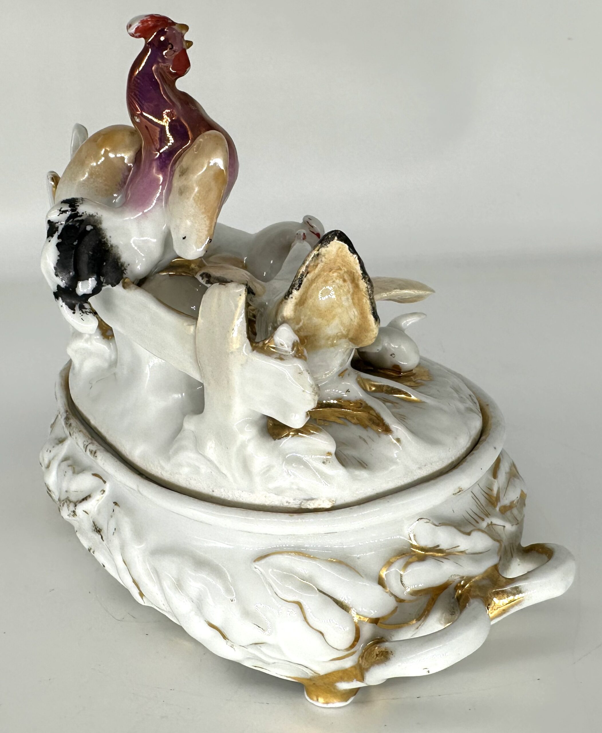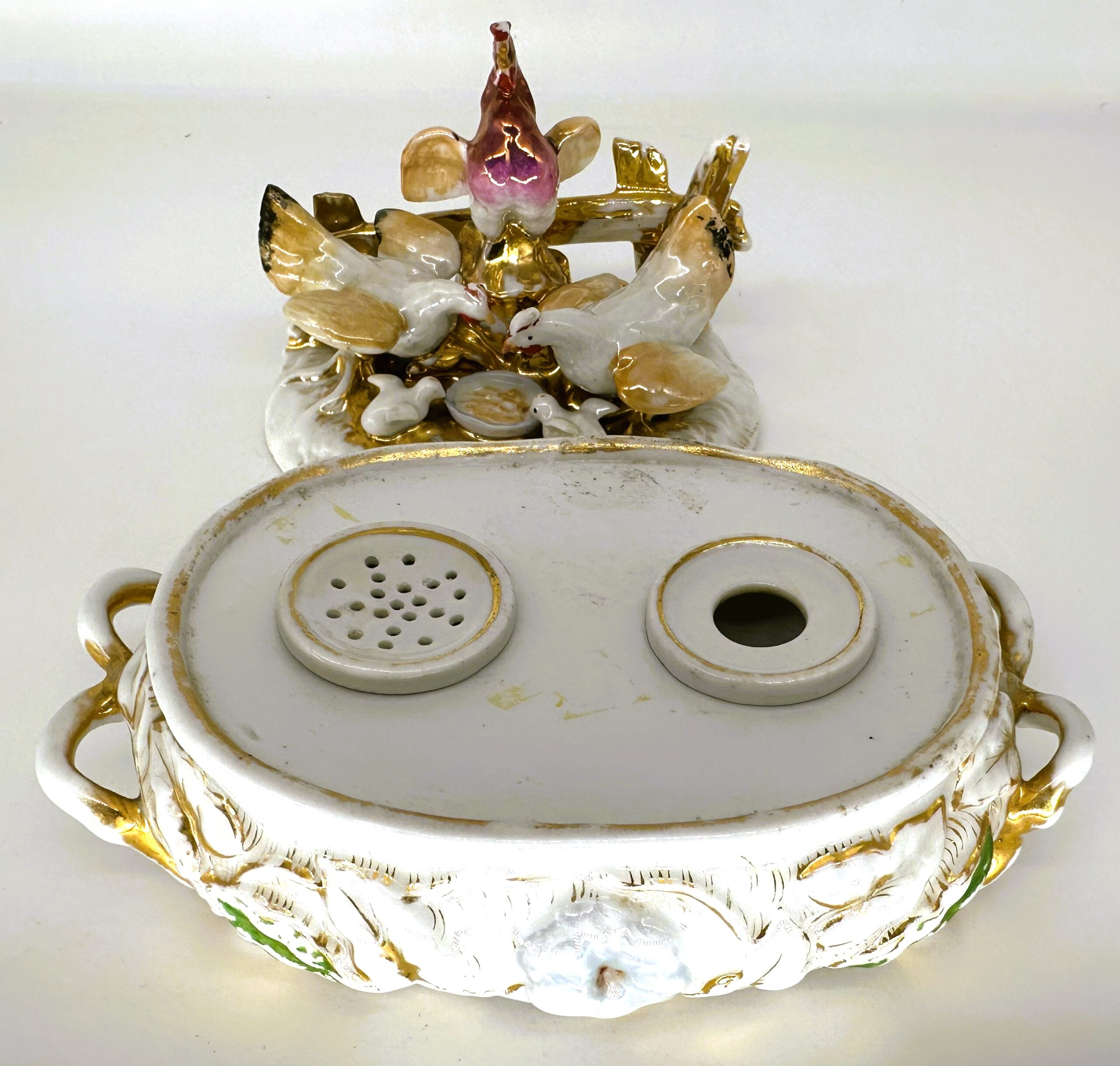 Overview This porcelain inkstand is a nice example of German figural porcelain, attributed to the renowned makers Conta & Boehme of Pößneck, Thuringia. Modeled as a lively barnyard scene, this piece combines decorative whimsy with functional desk utility. The form is documented in Conta & Boehme Porcelain by Janice and Richard Vogel, confirming its attribution despite lacking the full factory mark.