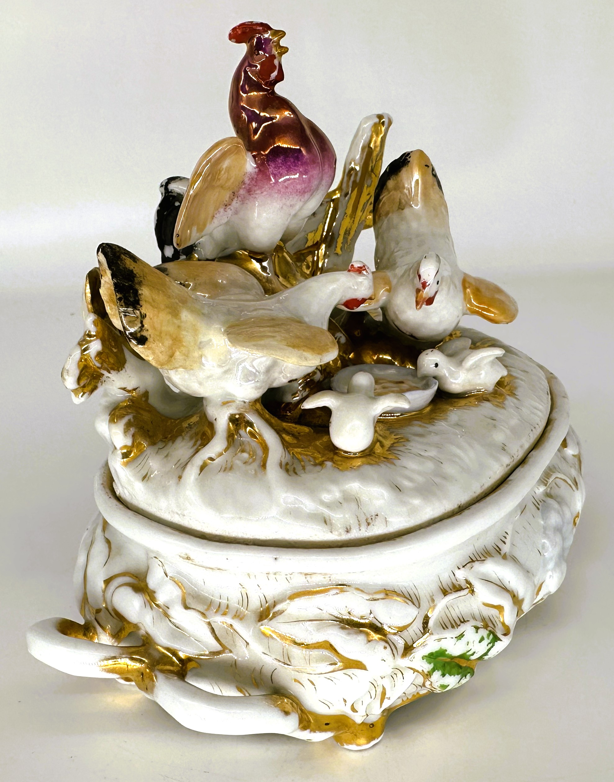 The Figural Scene (The Lid) The upper portion of the inkstand serves as a removable lid, fully sculpted in the round. It features a narrative barnyard scene centered around a family of chickens: