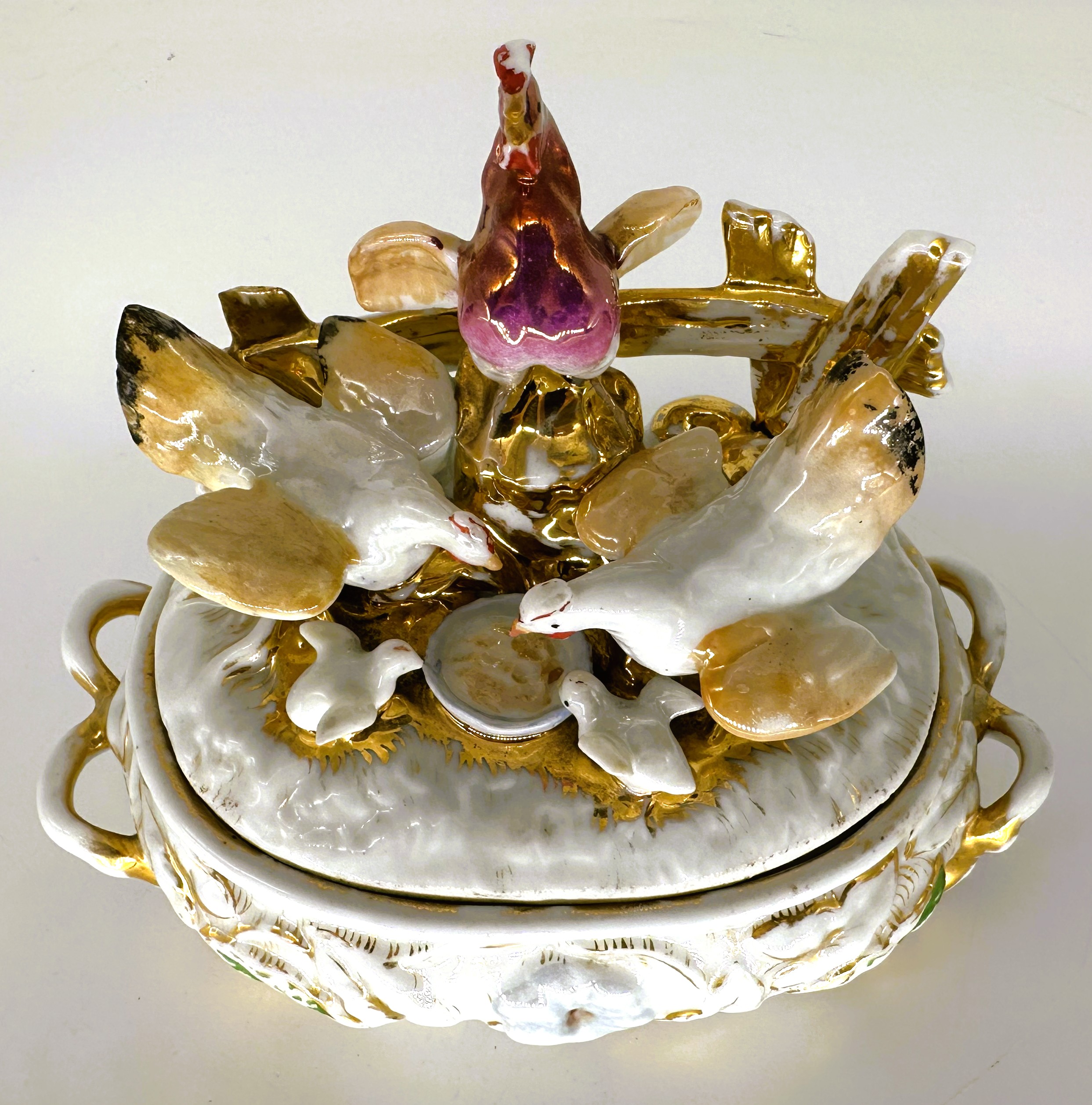 - Setting: The birds rest on a textured mound modeled to resemble a grassy farmyard floor, accented with gilt highlights.