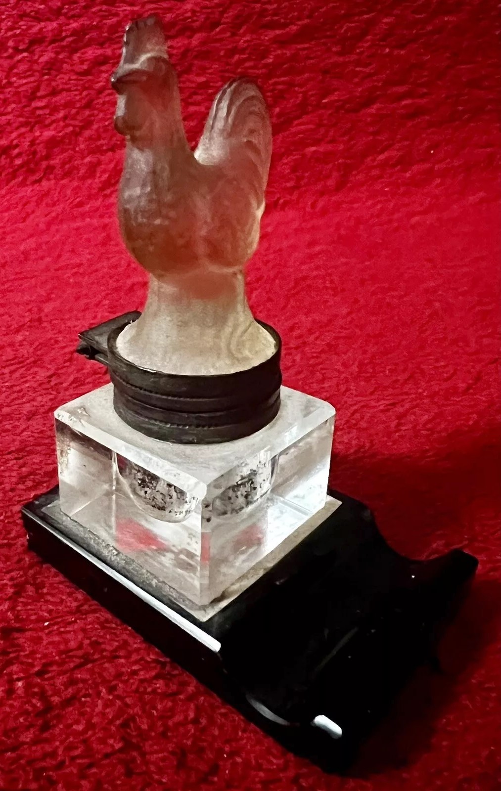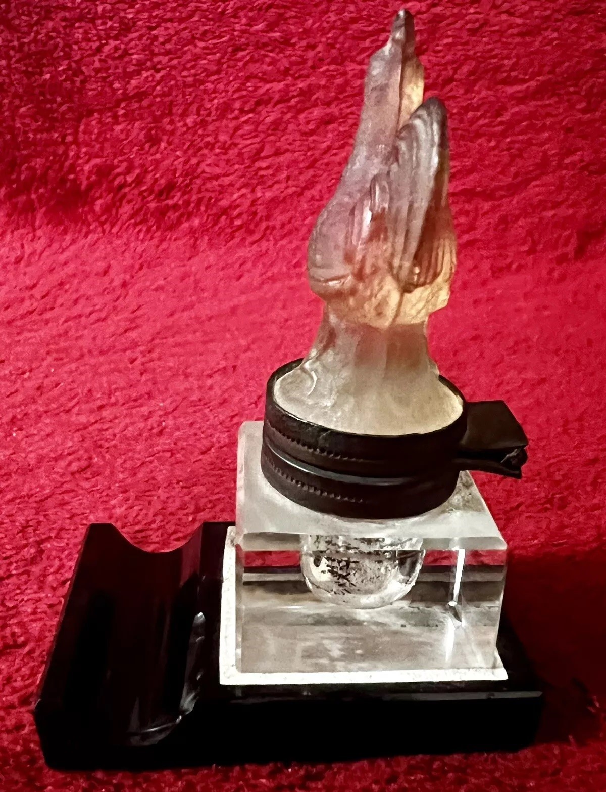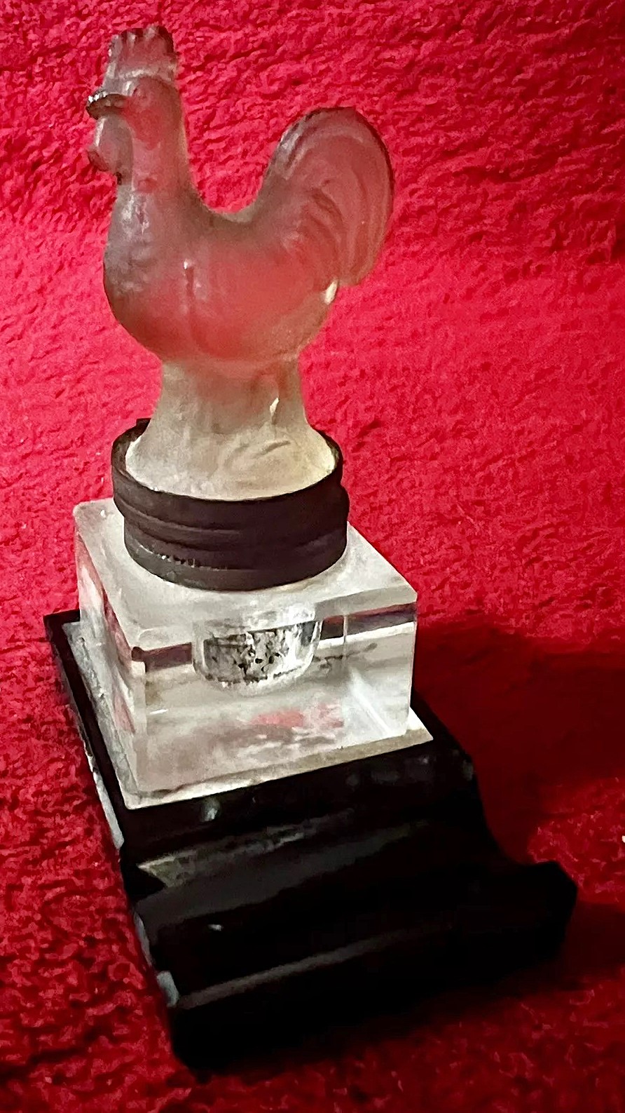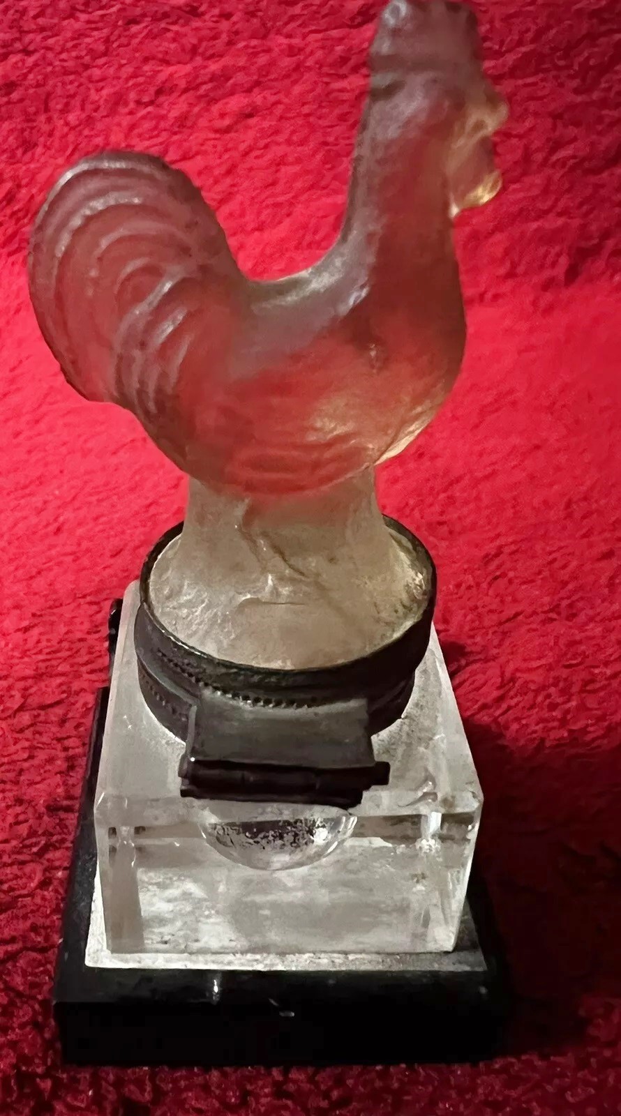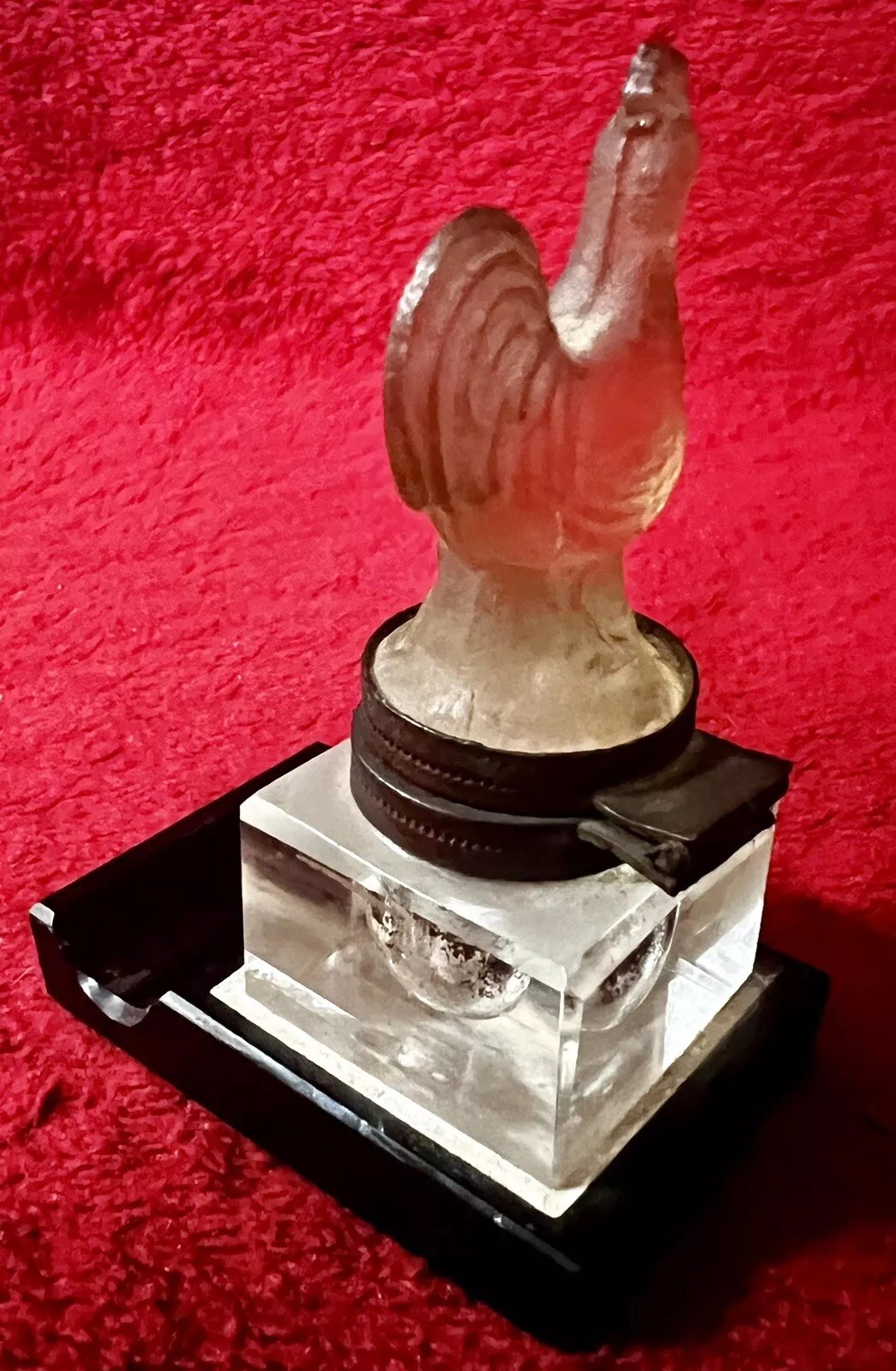 The focal point of this inkwell is the frosted glass rooster perched on the lid, depicted in a crowing stance with intricate detailing on its feathers and wings. The inkwell itself is clear glass, and it sits on a sleek black glass base. The base extends outward to form a pen channel.