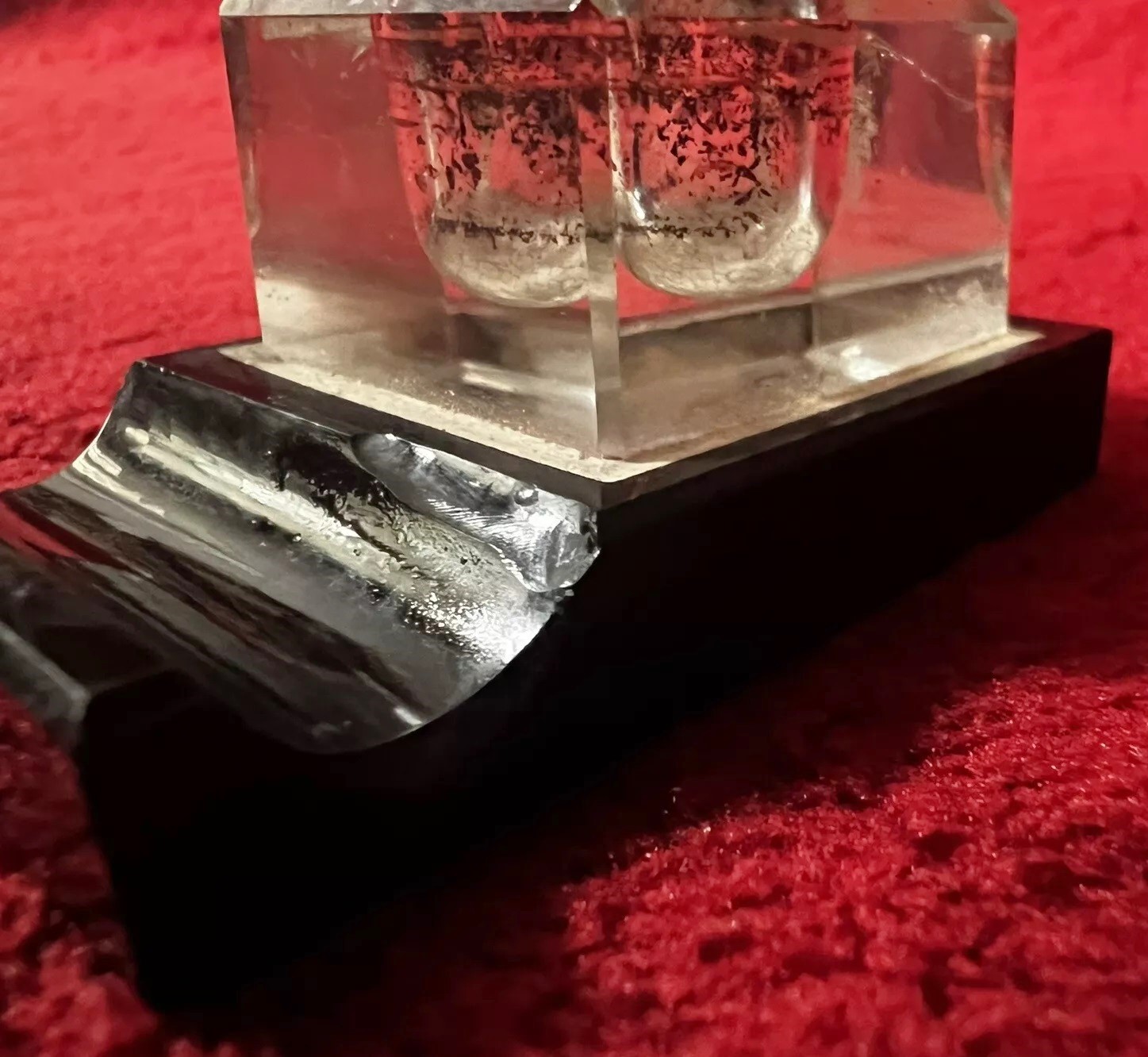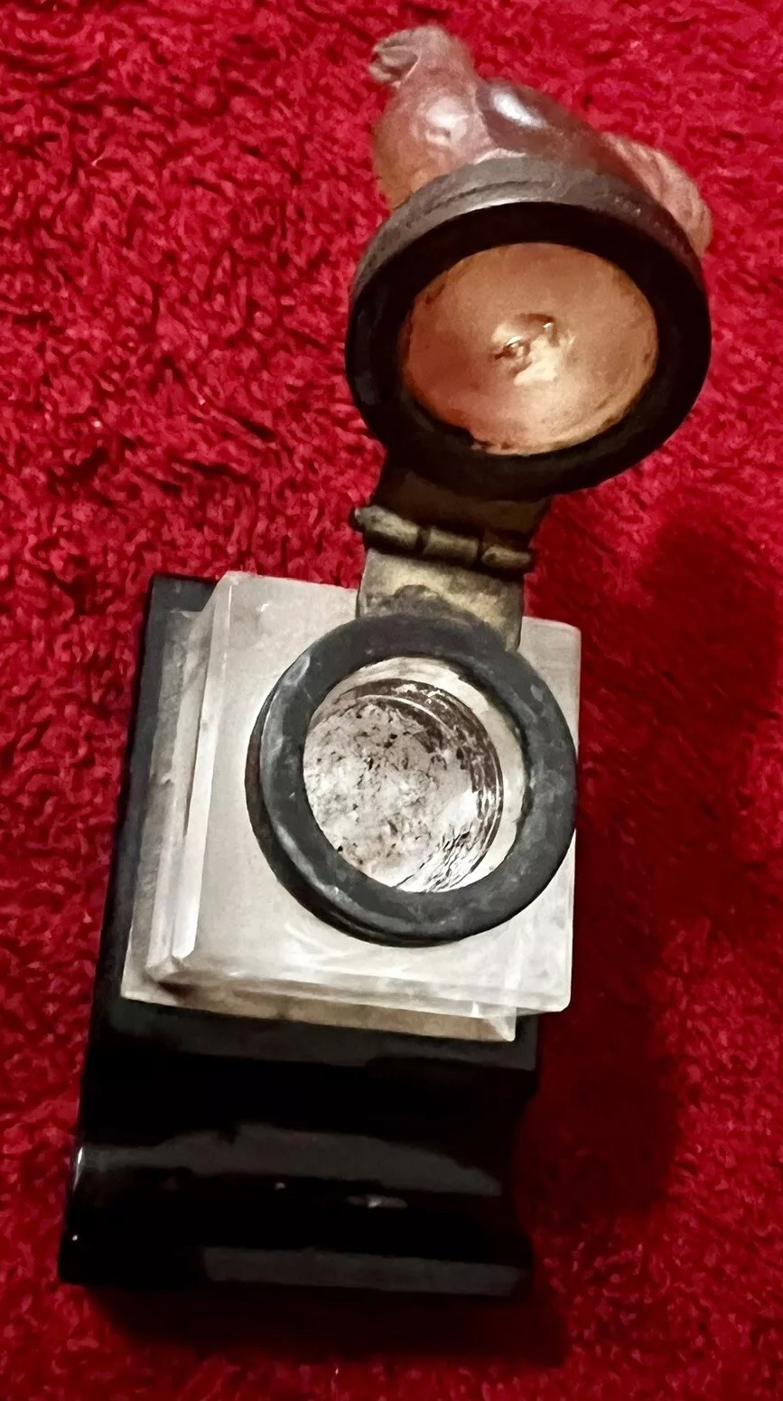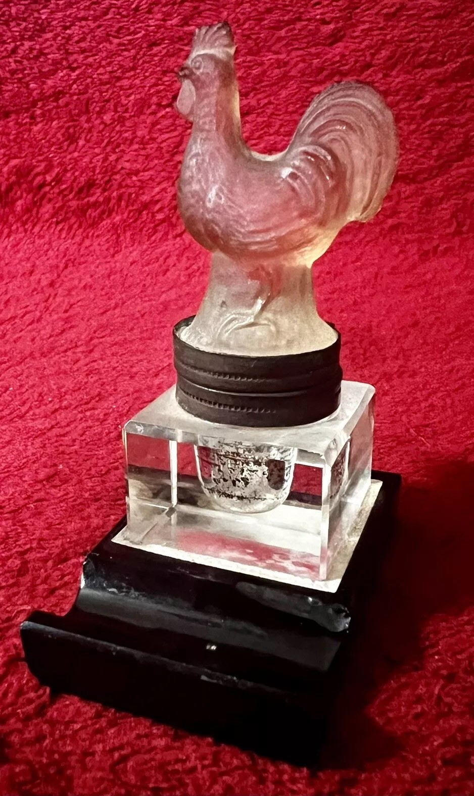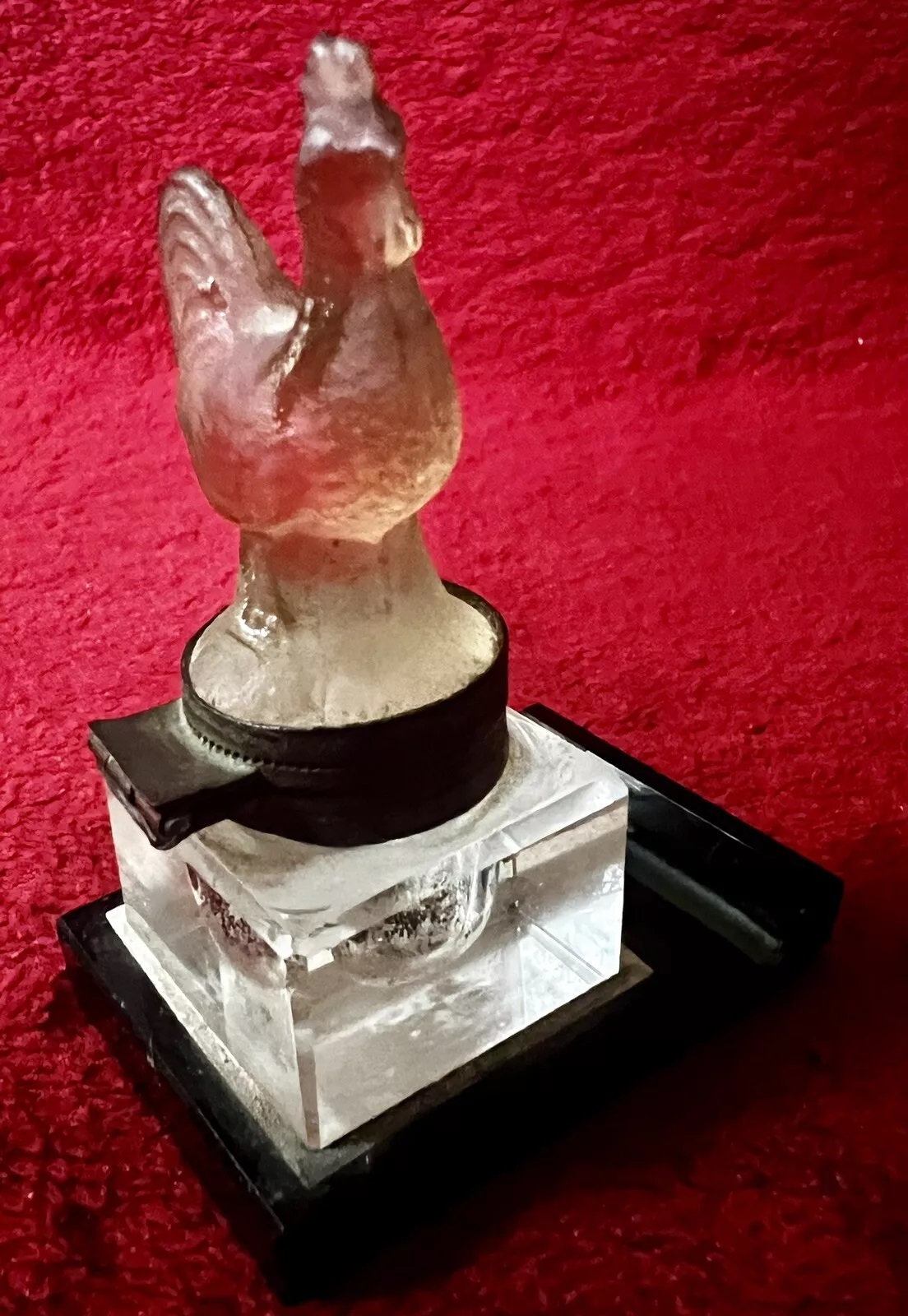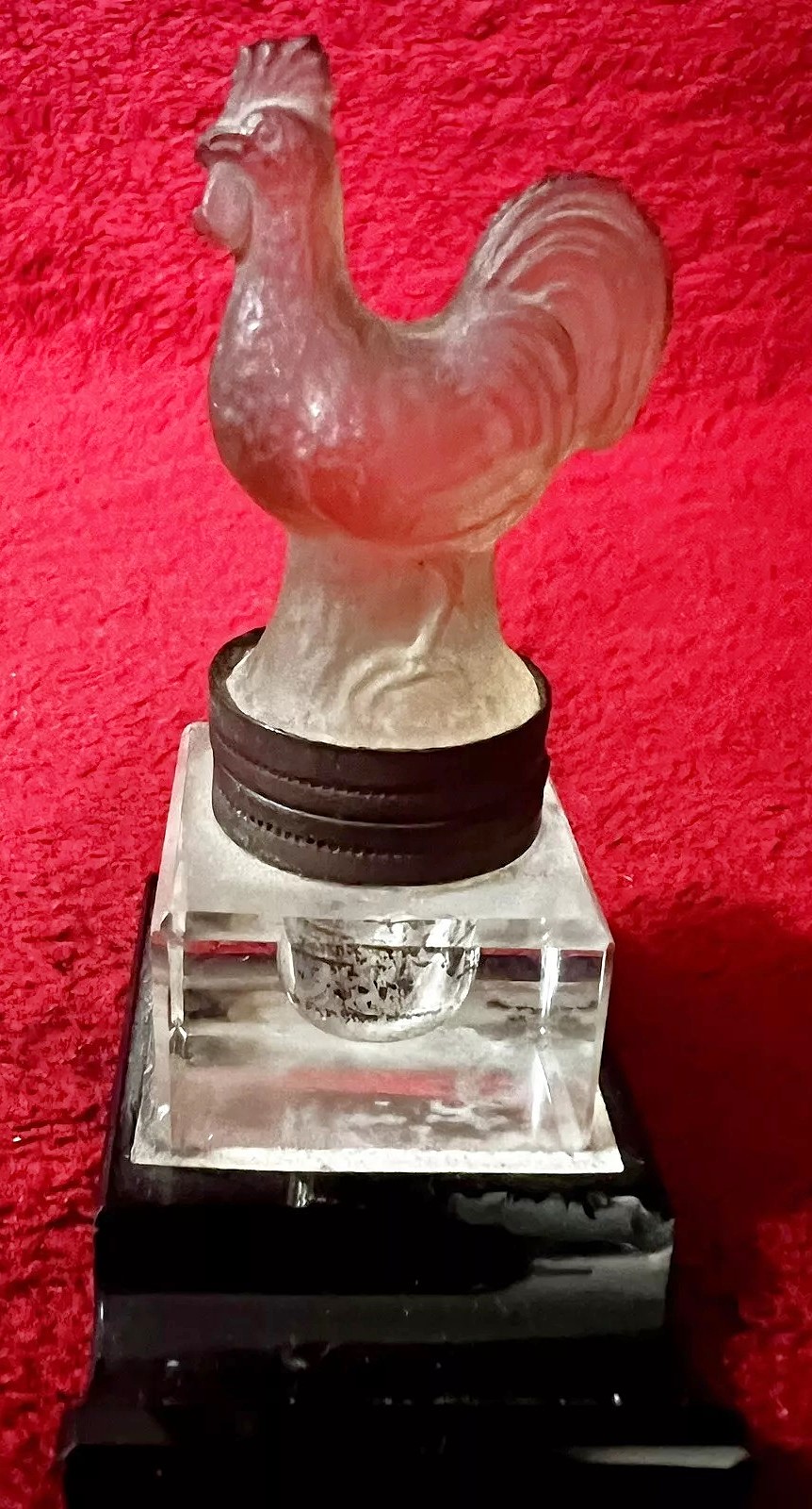 The focal point of this inkwell is the frosted glass rooster perched on the lid, depicted in a crowing stance with intricate detailing on its feathers and wings. The inkwell itself is clear glass, and it sits on a sleek black glass base. The base extends outward to form a pen channel.