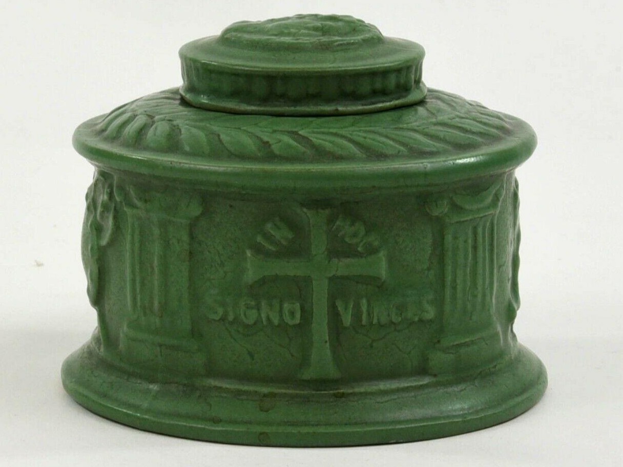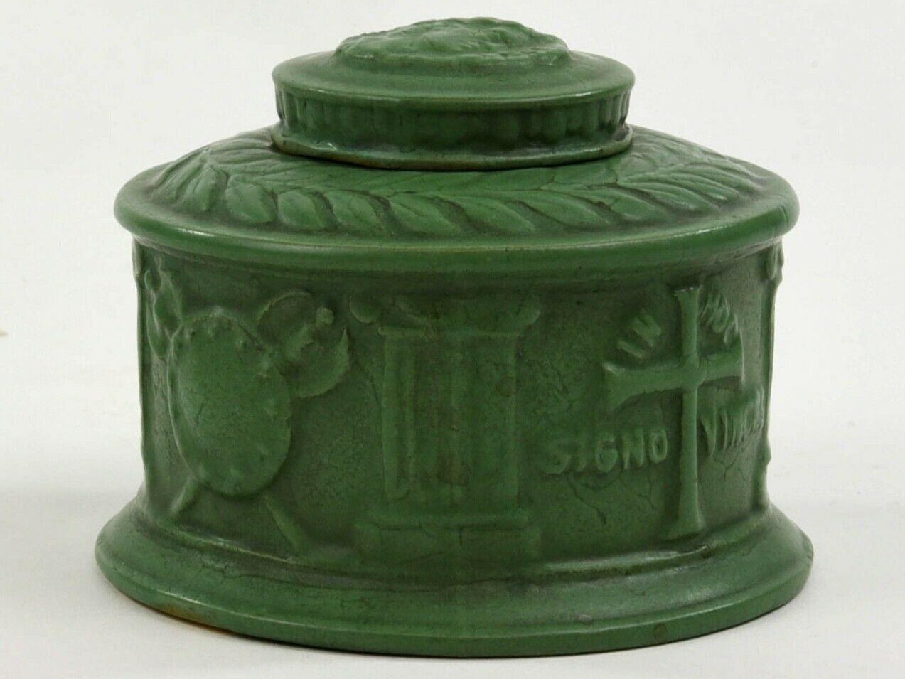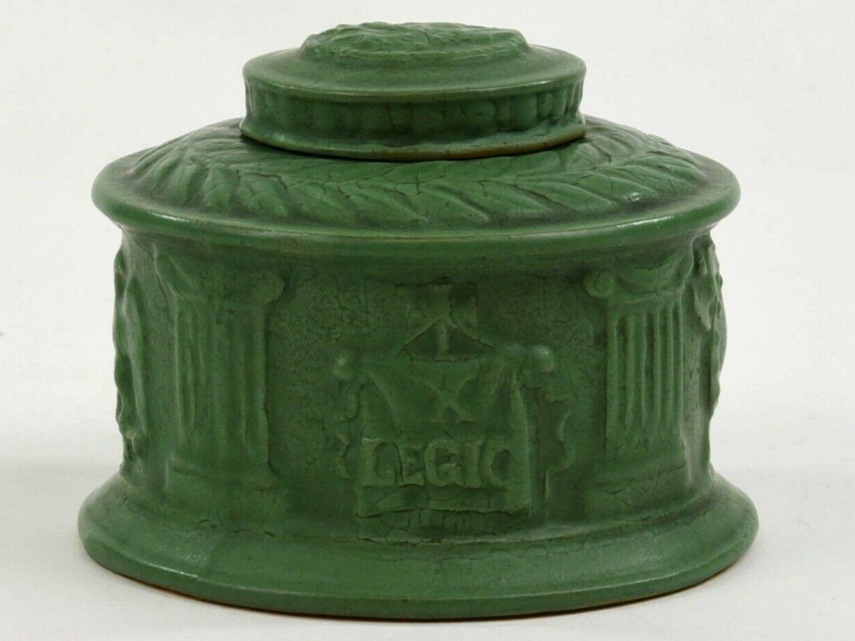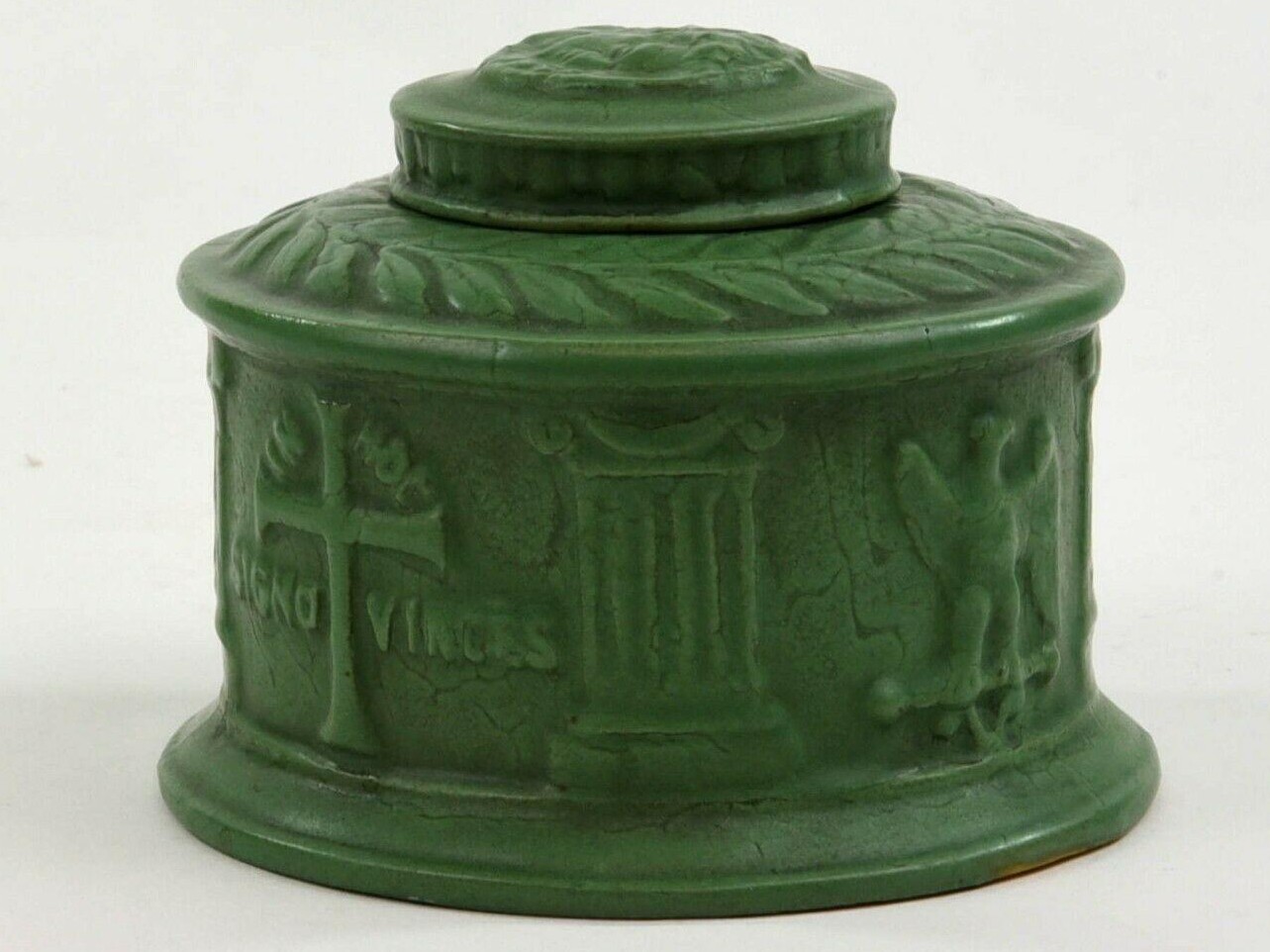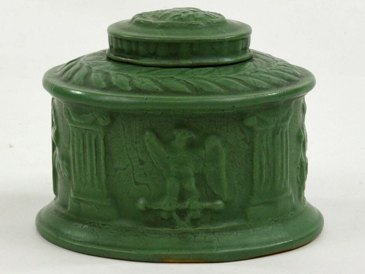 This inkwell is a fine example of American Arts and Crafts art pottery from the early 20th century. The piece is finished in a smooth, matte green glaze that was popular during this period. The inkwell is cylindrical in shape with a flat, circular base.