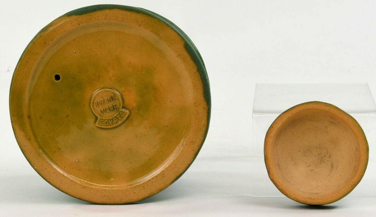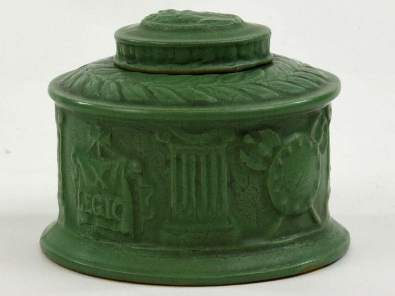 The base of the inkwell is marked with the raised seal “Rozane Ware, Egypto”. “Rozane” was an early trademark used by Roseville, and “Egypto” was a specific line of pottery produced around 1905. While the name “Egypto” might suggest an Egyptian theme, this inkwell’s decorative motifs are clearly Roman in inspiration, demonstrating the eclectic borrowing of classical and historical styles common to the Arts and Crafts movement.