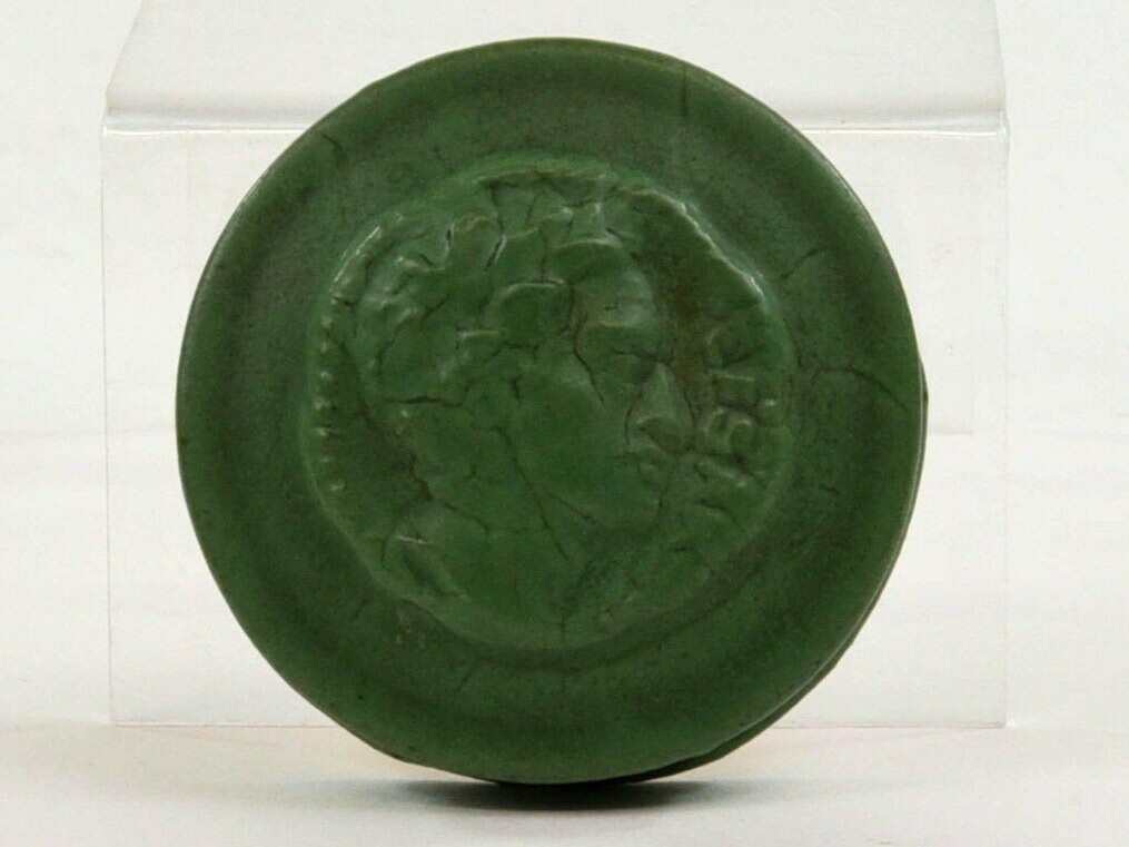 The lid of the inkwell is embossed with a clear profile of Caesar, facing right. This Roman motif, along with the columns and eagles, gives the piece a strong classical influence.