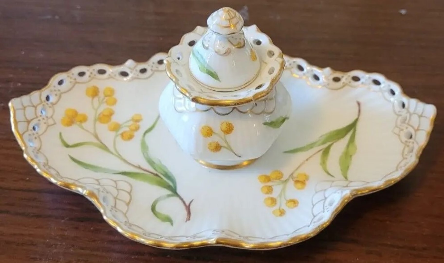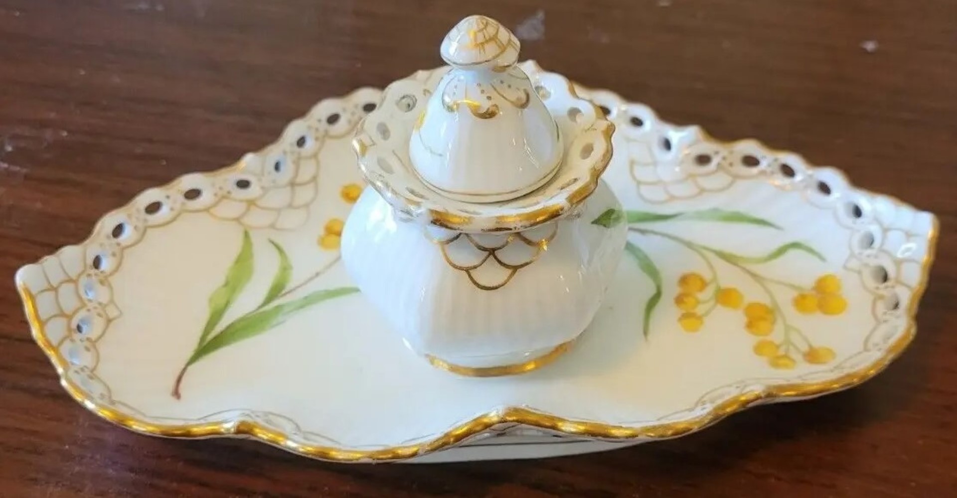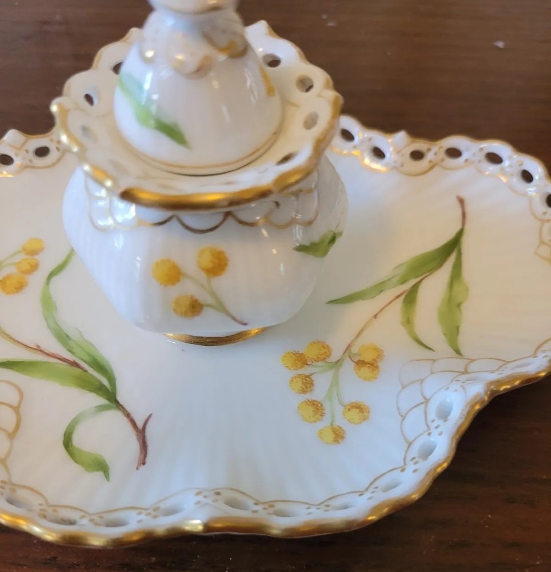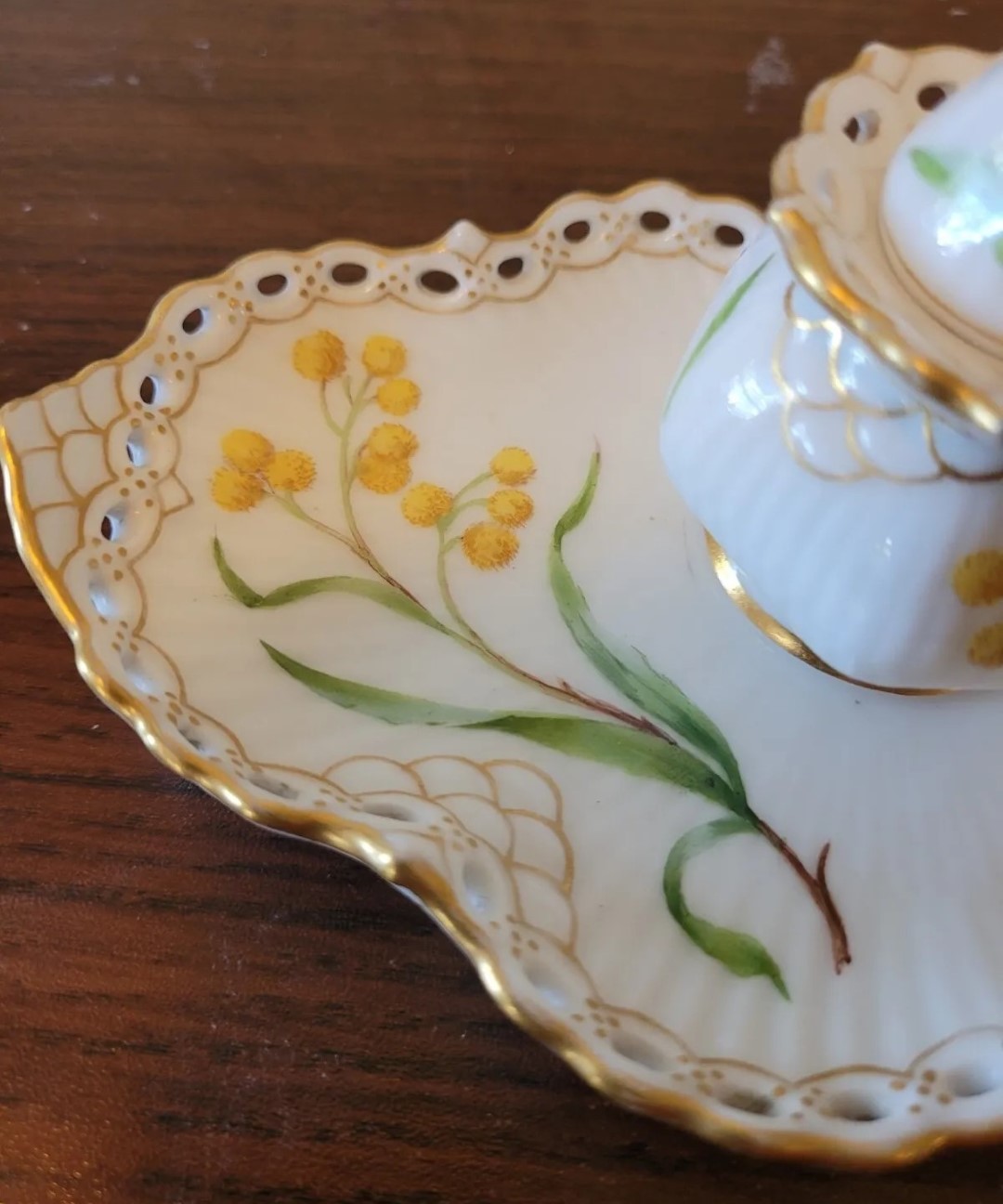 This Royal Copenhagen inkstand features a white porcelain body with a lace scalloped edge design. Hand-painted embellishments adorn the piece, including yellow flowers with green leaves and stems. Gold accents trace along the edges and the pointed finial of the dome-shaped lid.
