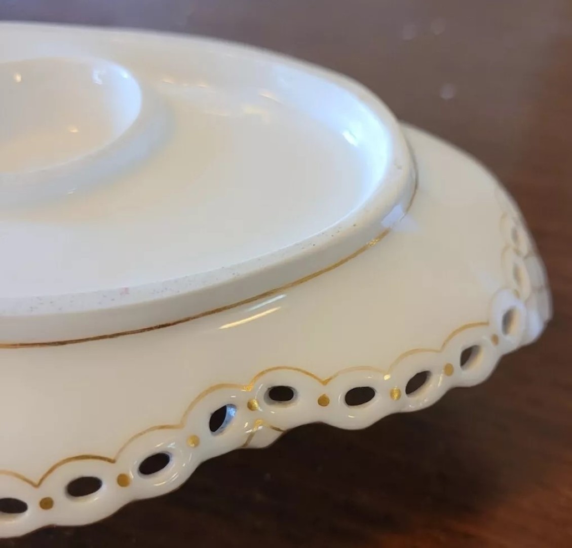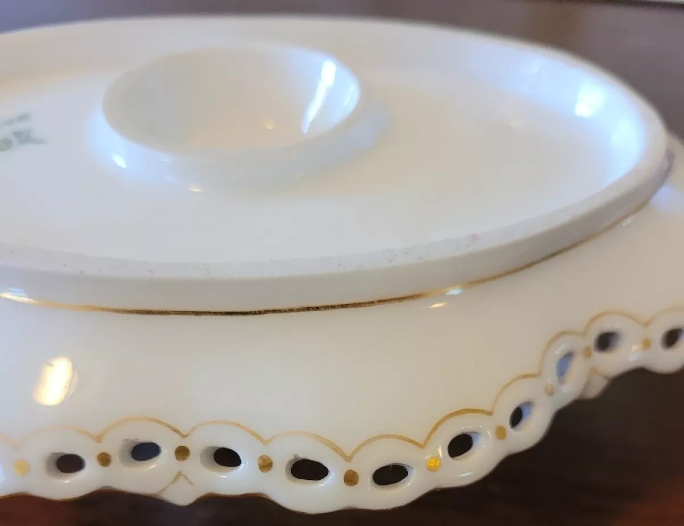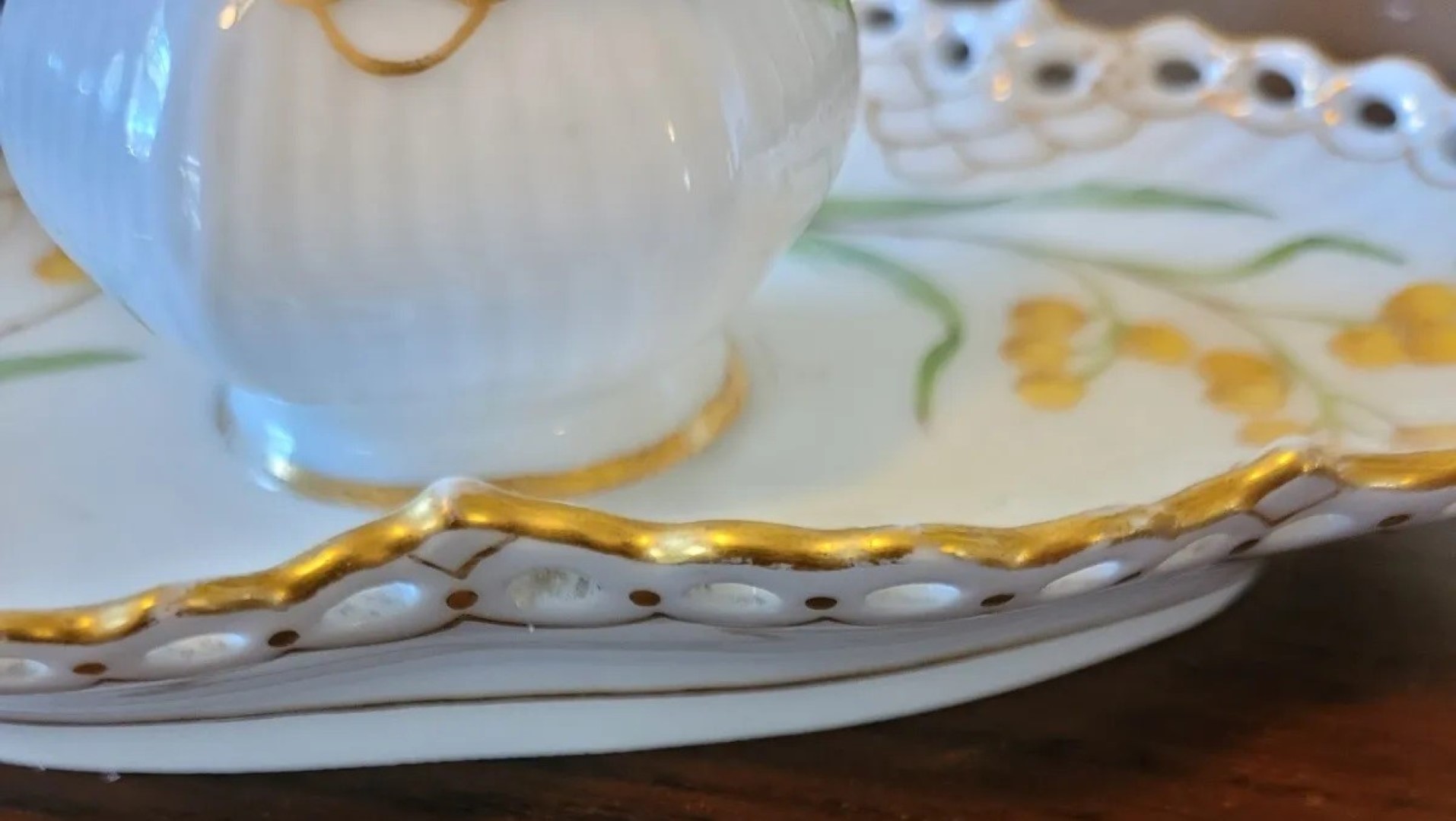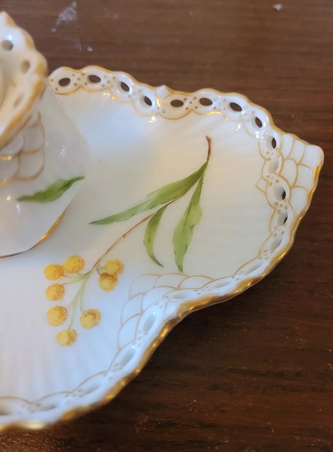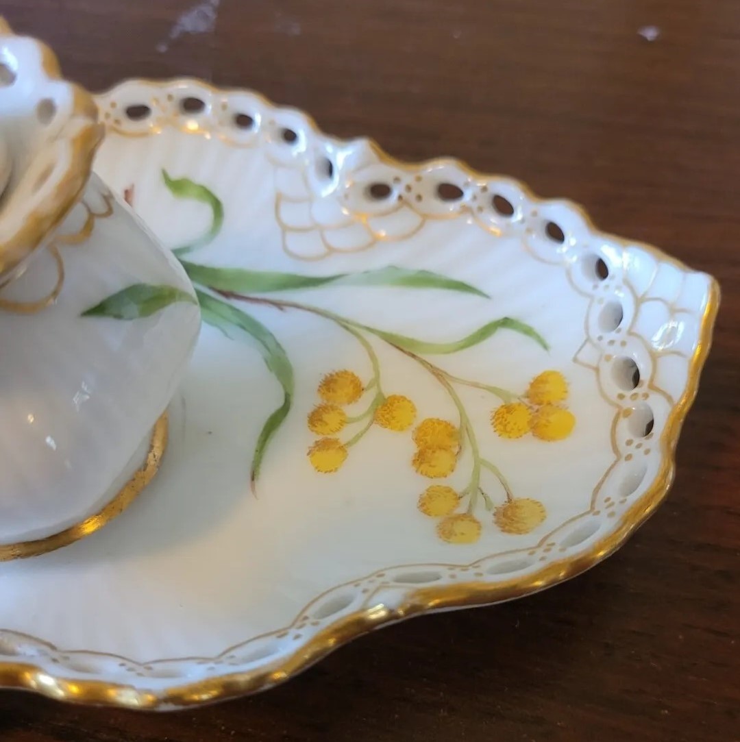 This Royal Copenhagen inkstand features a white porcelain body with a lace scalloped edge design. Hand-painted embellishments adorn the piece, including yellow flowers with green leaves and stems. Gold accents trace along the edges and the pointed finial of the dome-shaped lid.