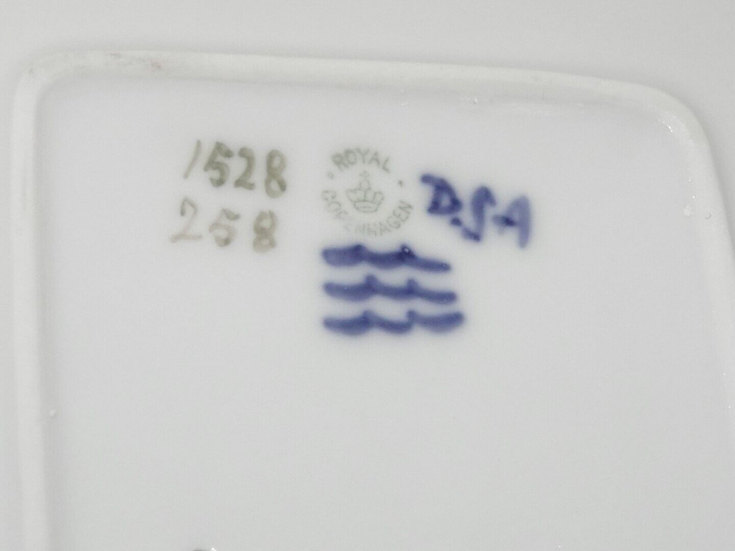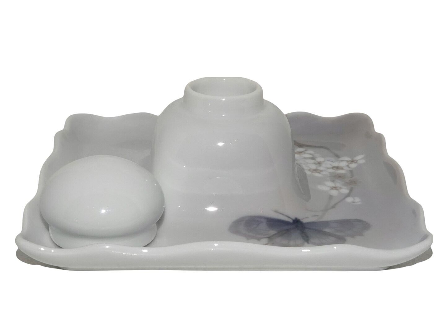 This inkwell, made by the Royal Copenhagen Co in Denmark, is a light gray background for delicate decorations of a butterfly, blossoms and branches. The factory mark indicates this was produced between 1898 and 1923. Decoration number 1528/258.