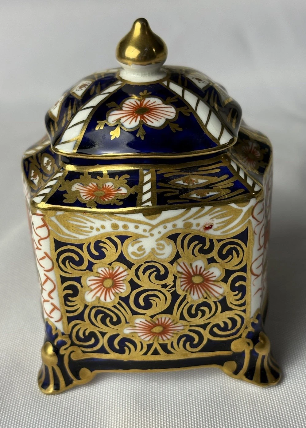 - Composition and Construction: The piece is made of bone china (a type of high-quality porcelain predominantly used by Royal Crown Derby). It is a three-piece set, consisting of the main base/stand, a removable inkwell insert, and a separate lid.
