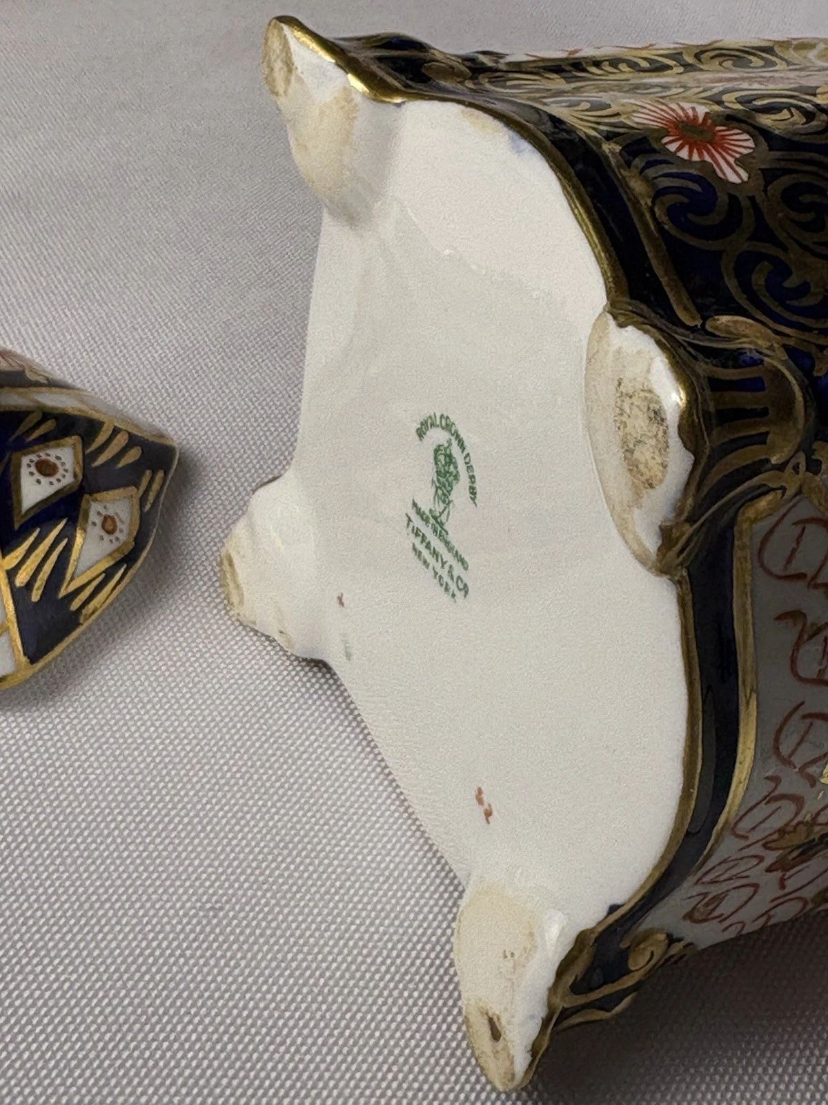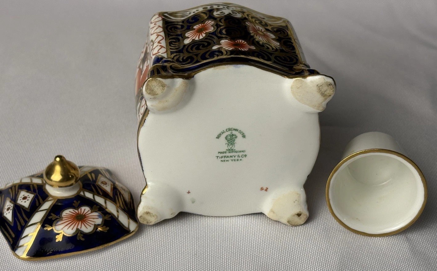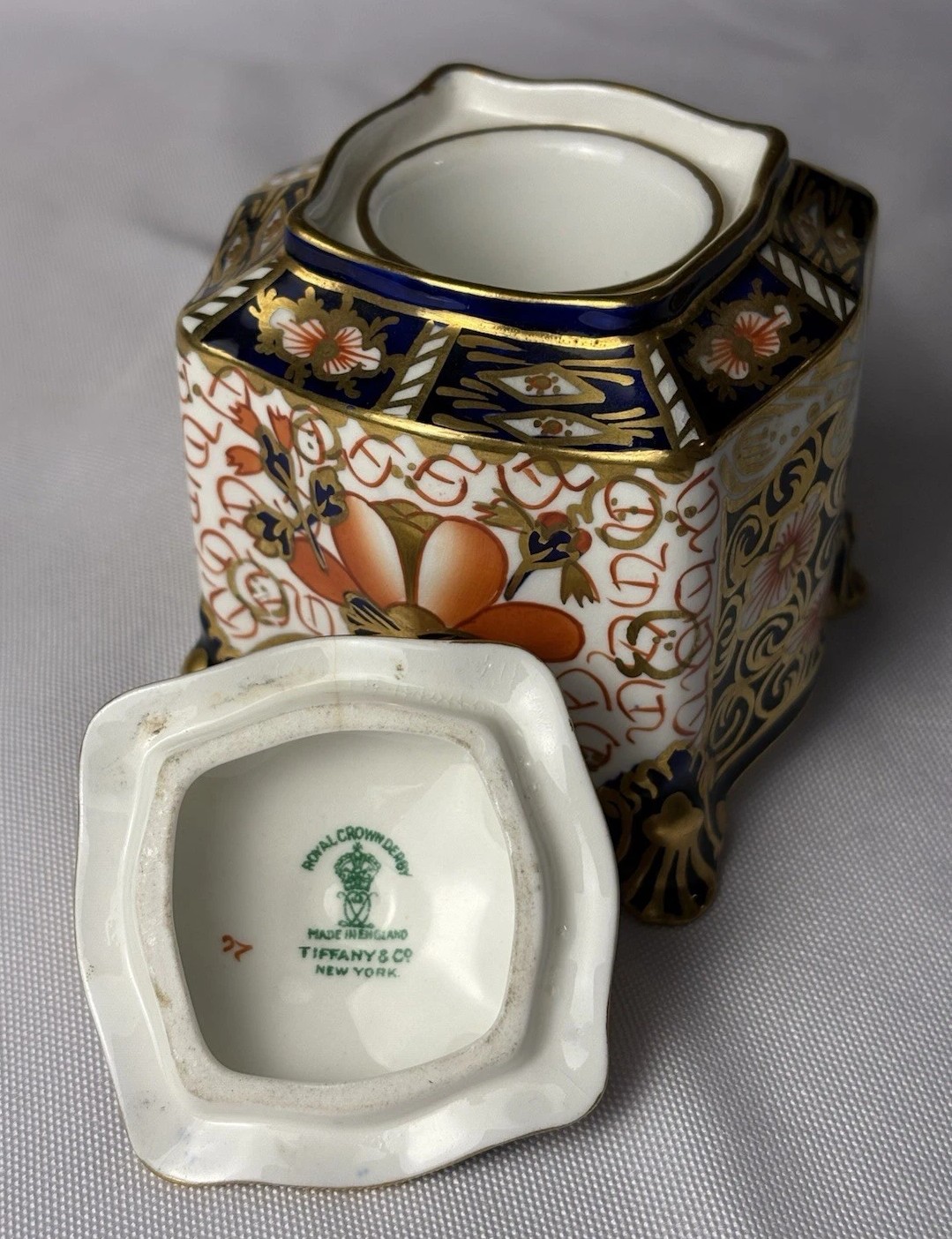 Royal Crown Derby manufactured the inkwell in England, and Tiffany & Co New York was the retailer. It was common practice for high-end retailers like Tiffany’s to commission or stock pieces from prestigious European manufacturers and have their own mark printed on the base alongside the maker’s mark.