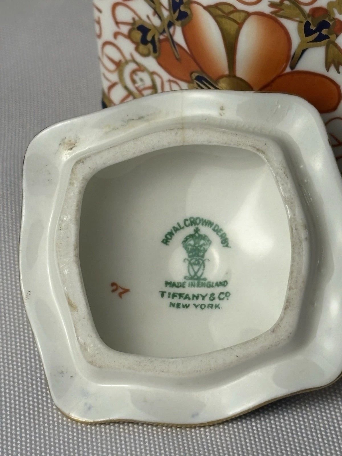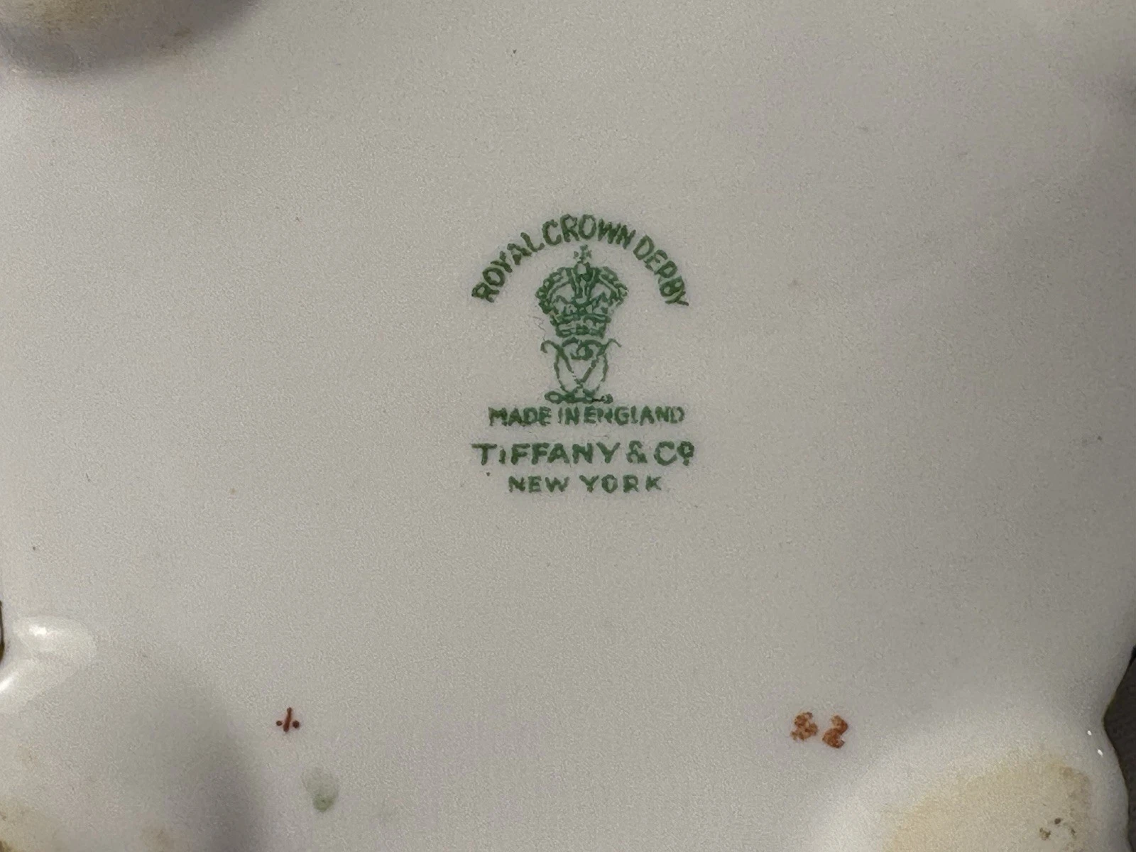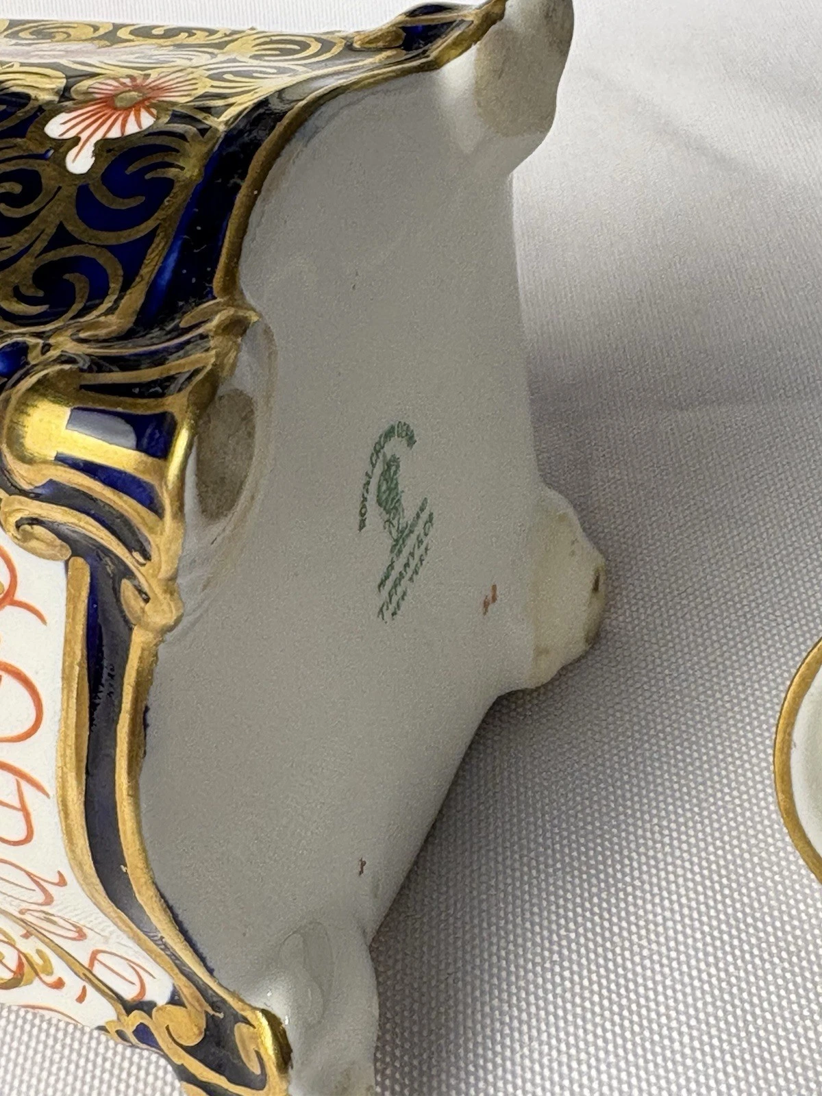 Royal Crown Derby manufactured the inkwell in England, and Tiffany & Co New York was the retailer. It was common practice for high-end retailers like Tiffany’s to commission or stock pieces from prestigious European manufacturers and have their own mark printed on the base alongside the maker’s mark.