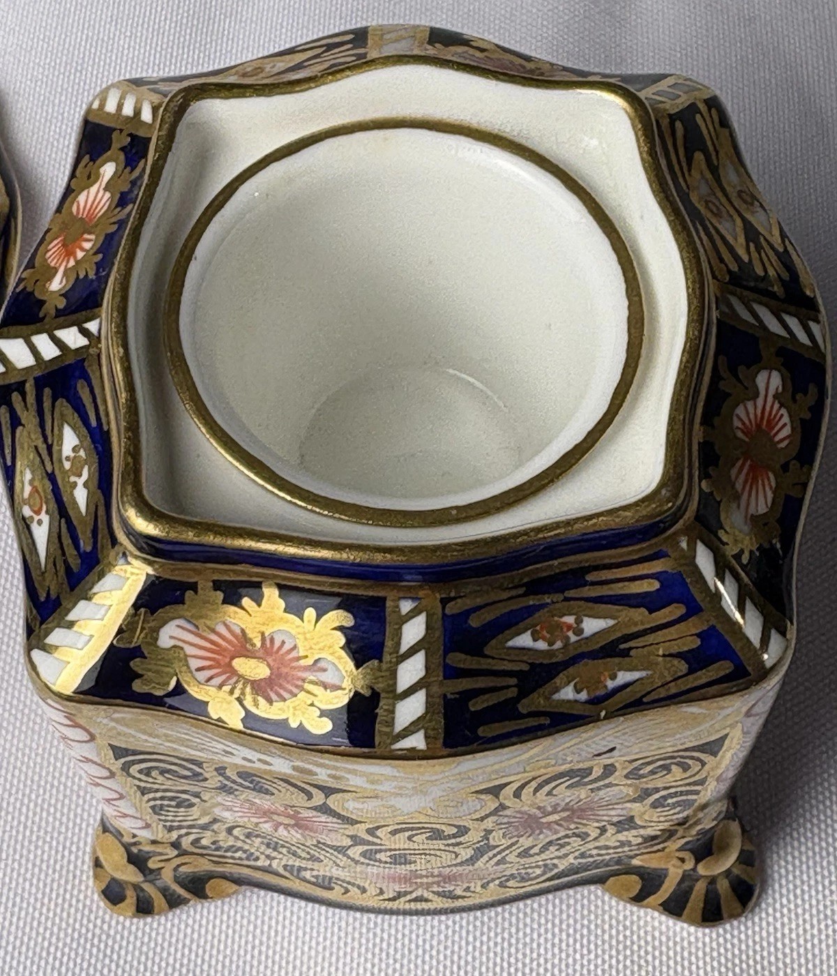 This is a Royal Crown Derby porcelain inkwell, made in England and retailed by Tiffany & Co. New York. It is an example of Royal Crown Derby’s Traditional Imari pattern (Pattern 2451).