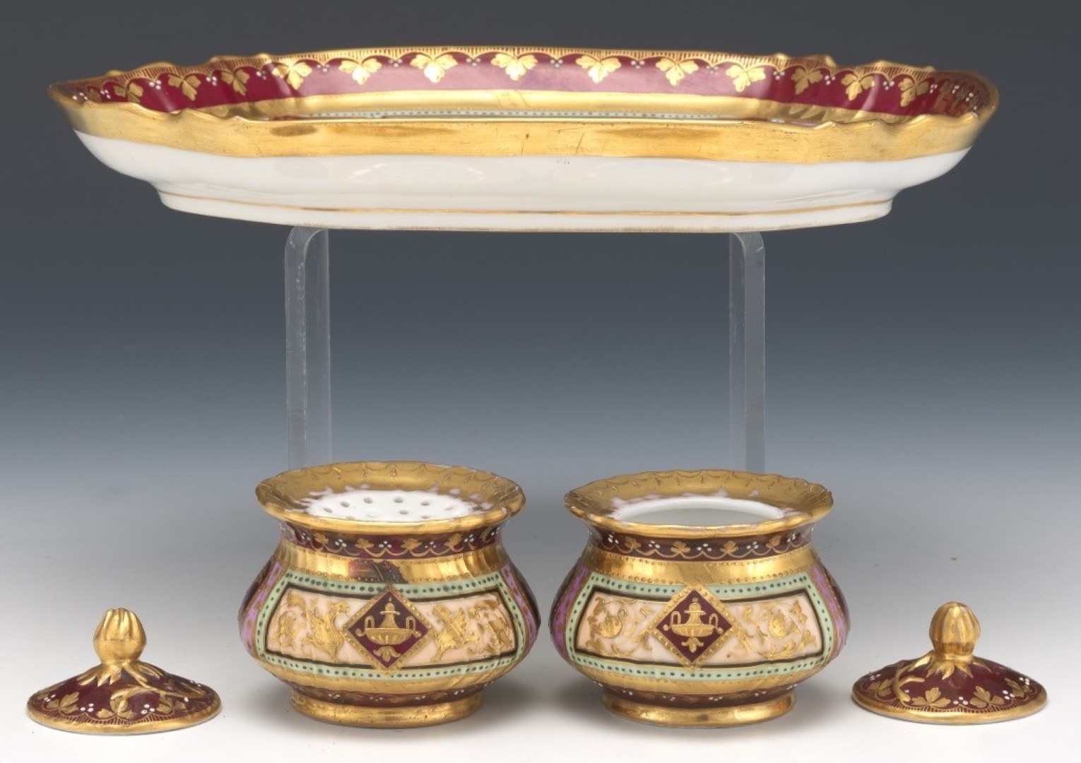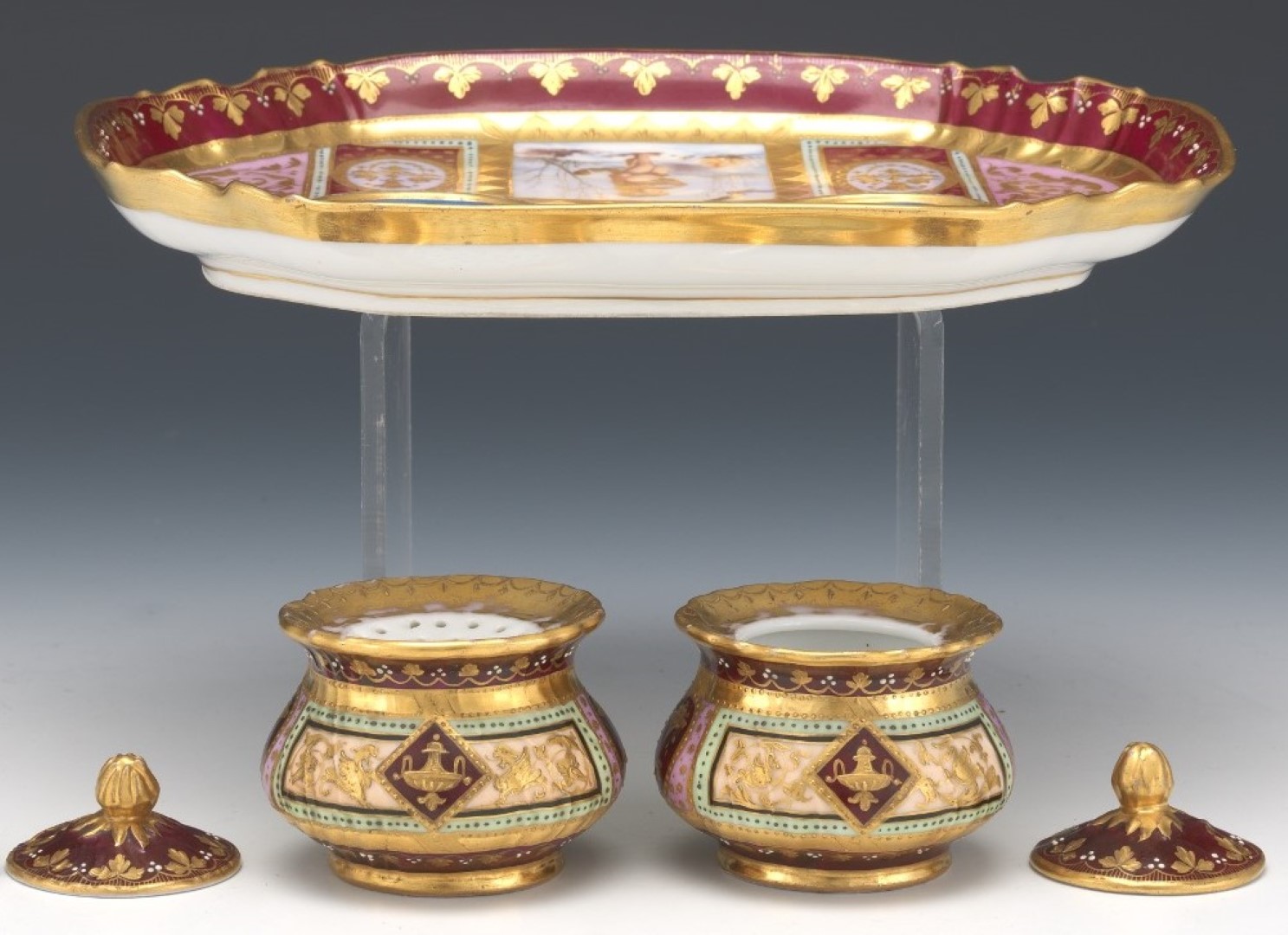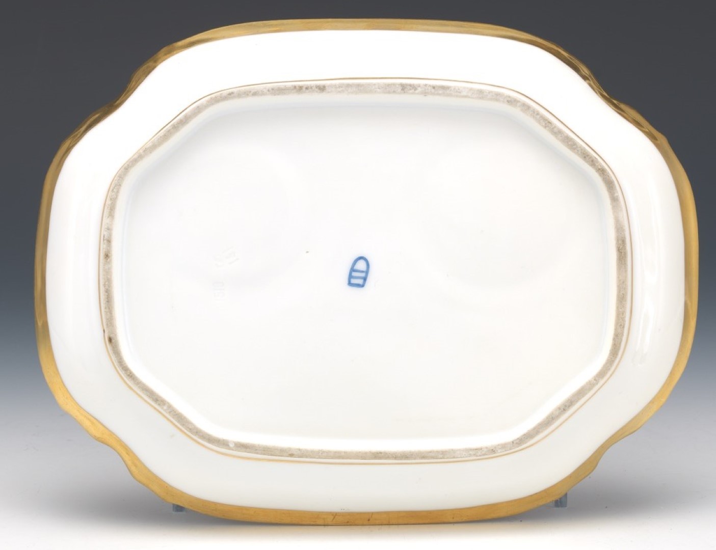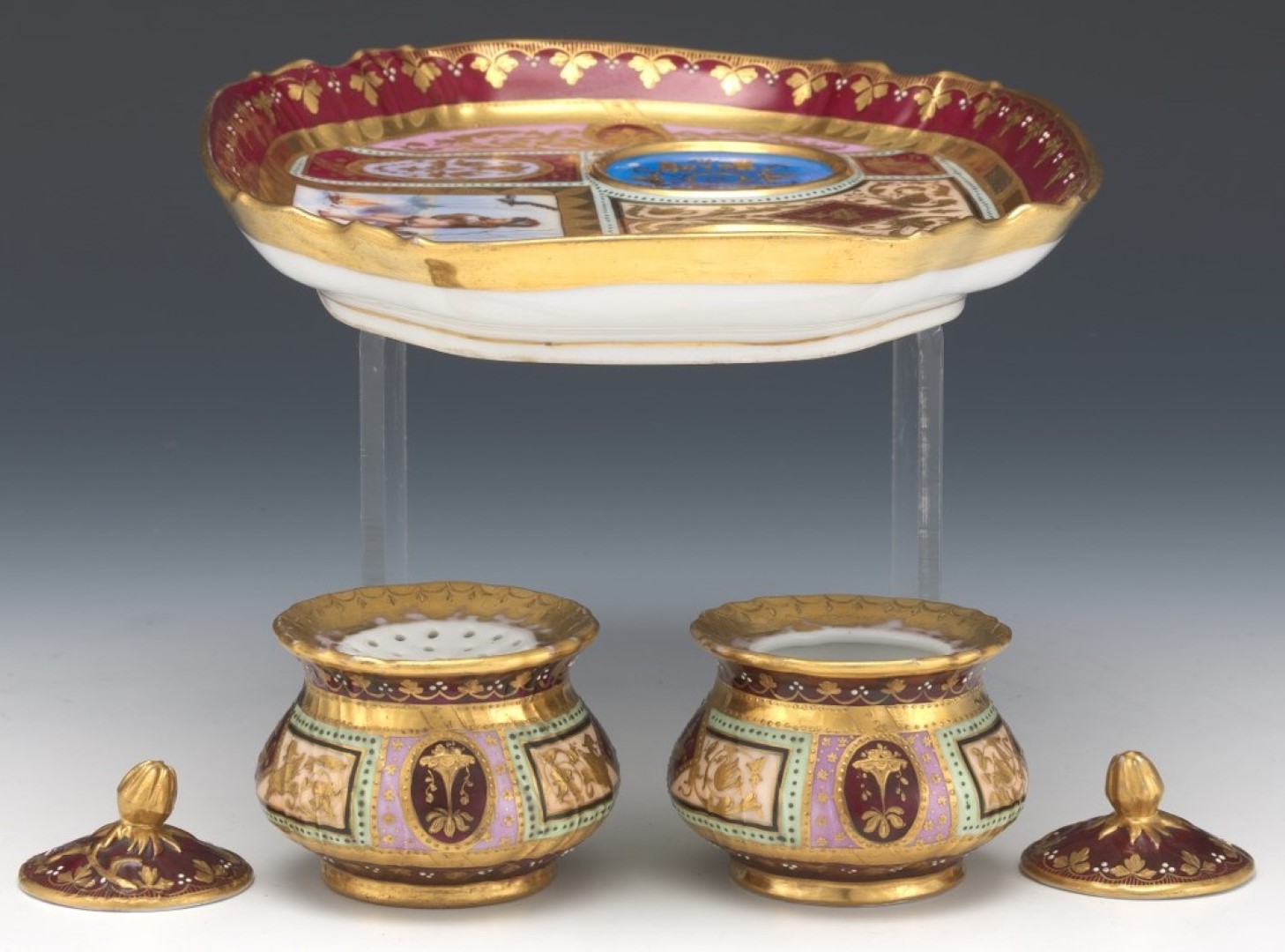Comprised of a quatrefoil-shaped tray, richly hand-enameled in polychrome with raised gilt designs, this inkstand holds an inkwell and a sander, both with lids. All pieces are marked with an overglazed blue beehive mark on the bottom.