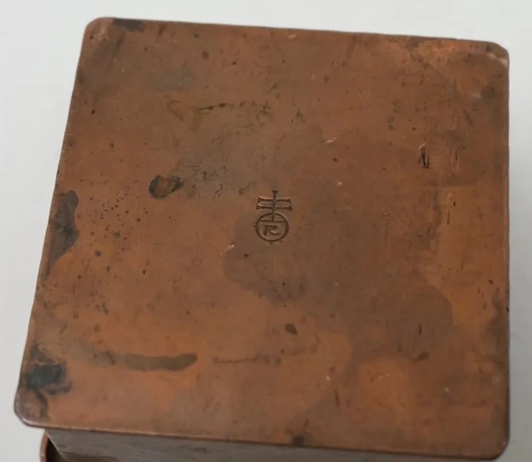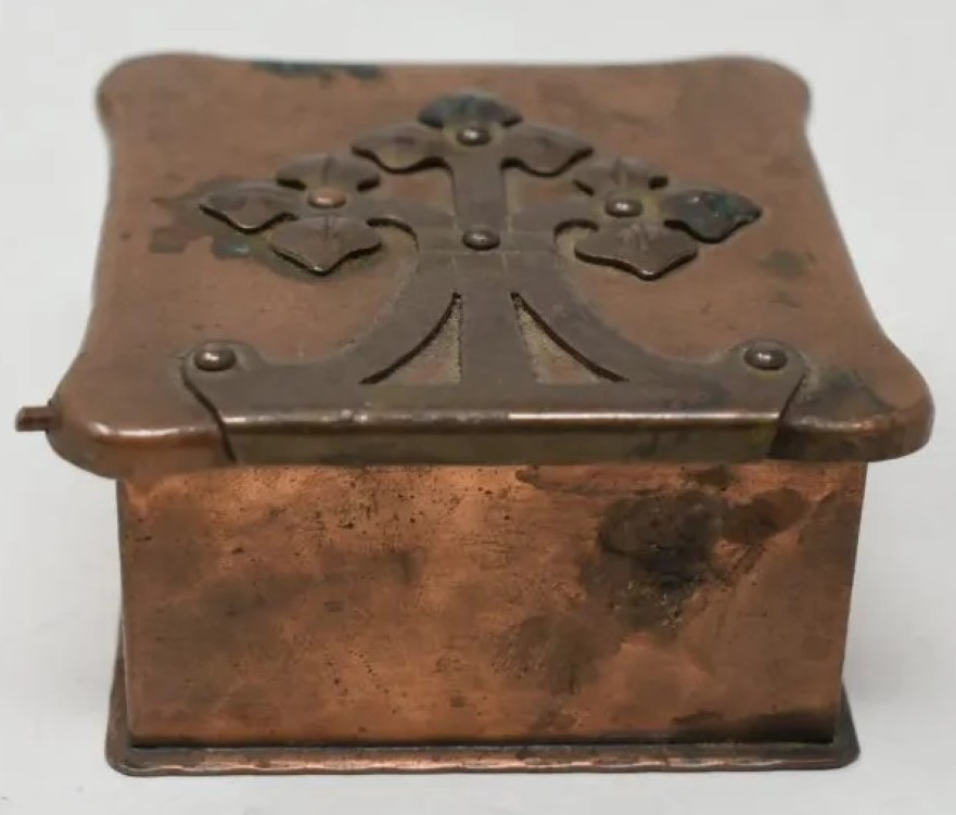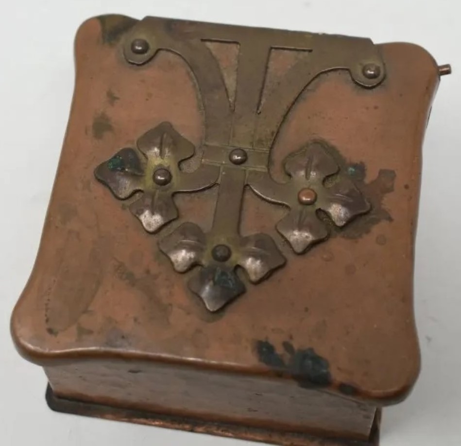 The lid of this Roycroft inkwell features a design with a central stem that branches out into limbs ending with a flower-like shape. Missing a glass insert.