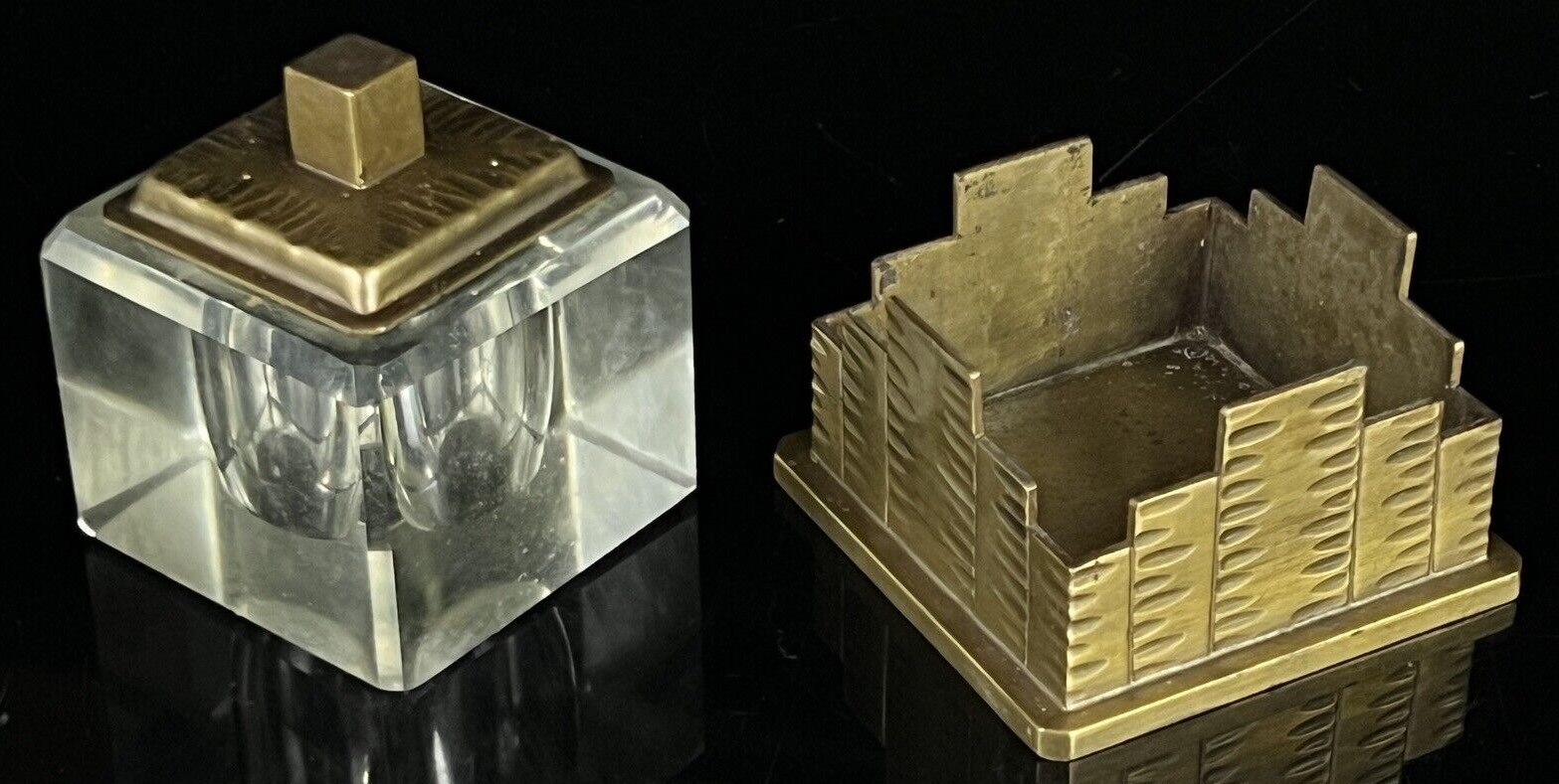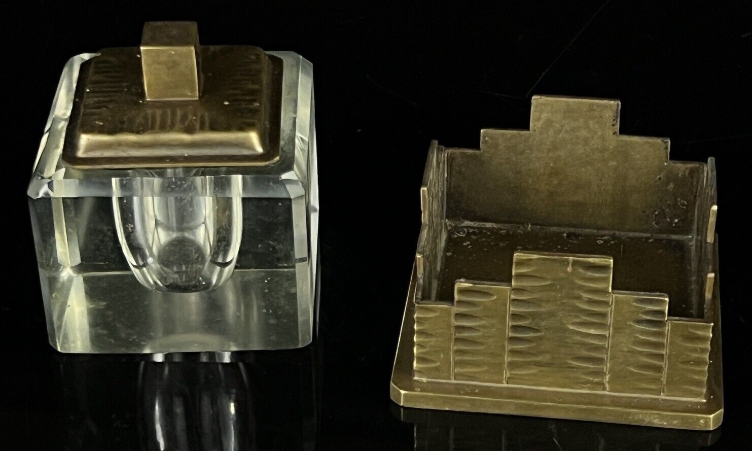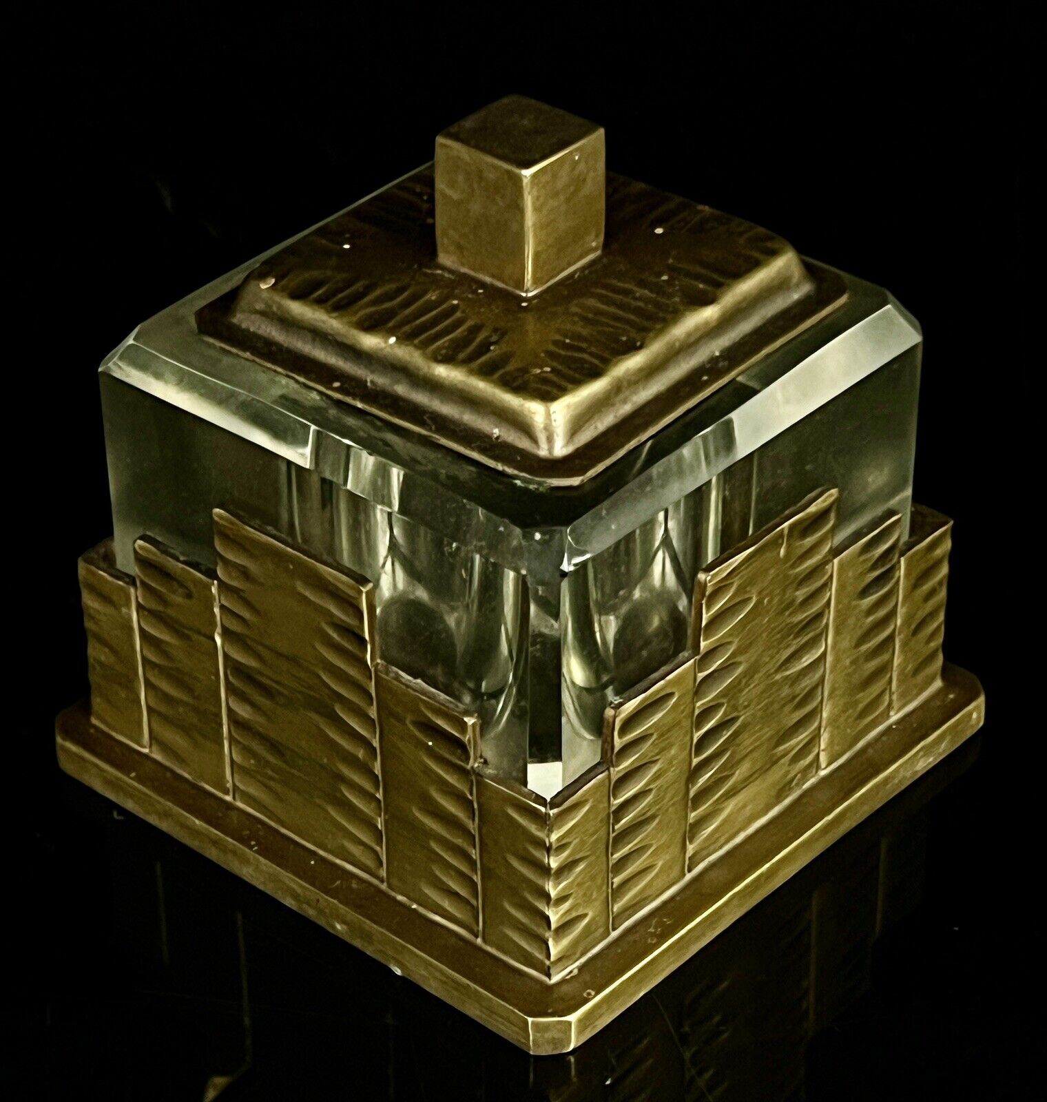 A square glass inkwell is housed in a hand-hammered brass over copper base with an indented vertical slab design. The lid is not attached and completes the Art Deco look. The Roycroft mark is impressed on the underside.