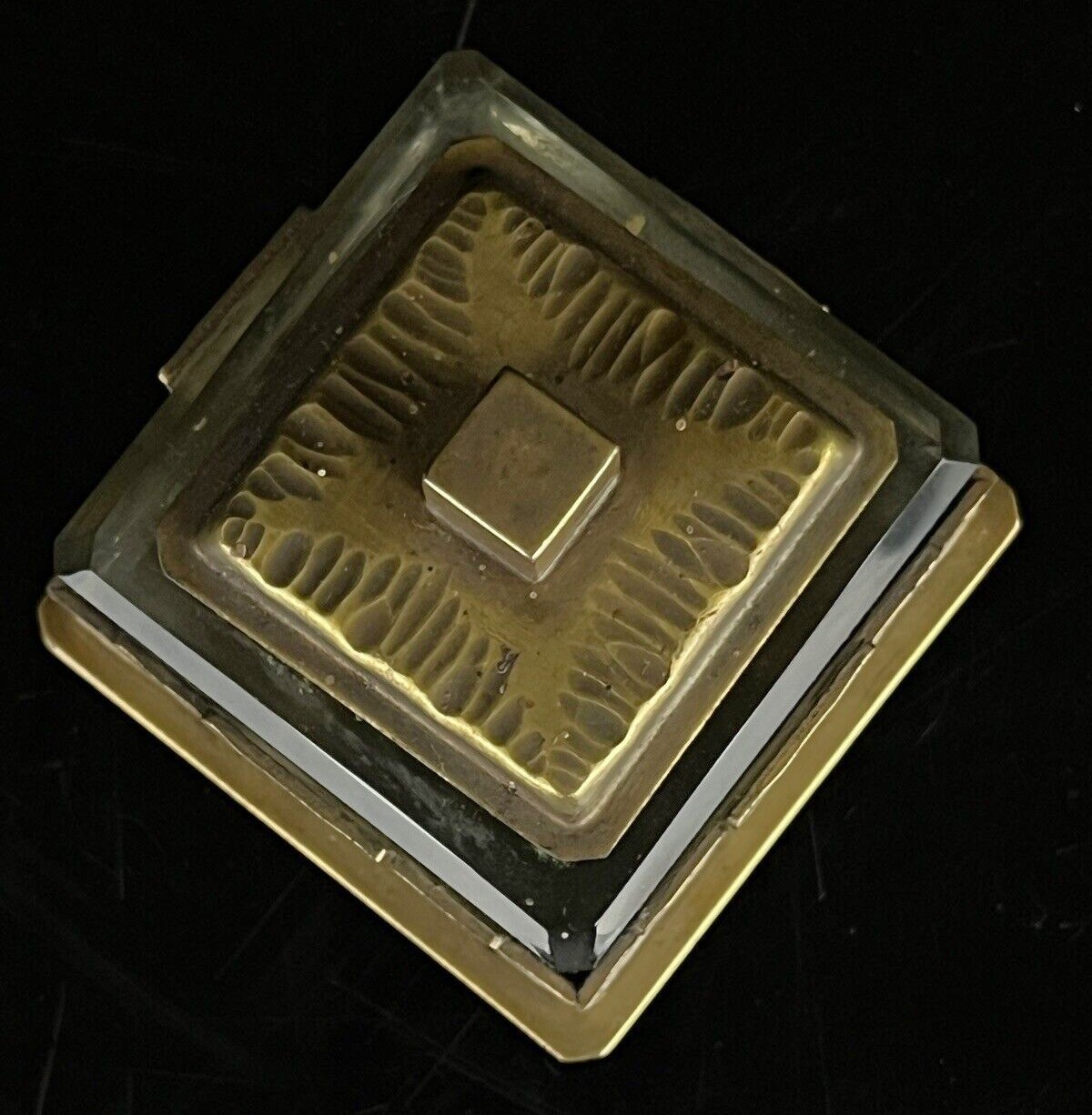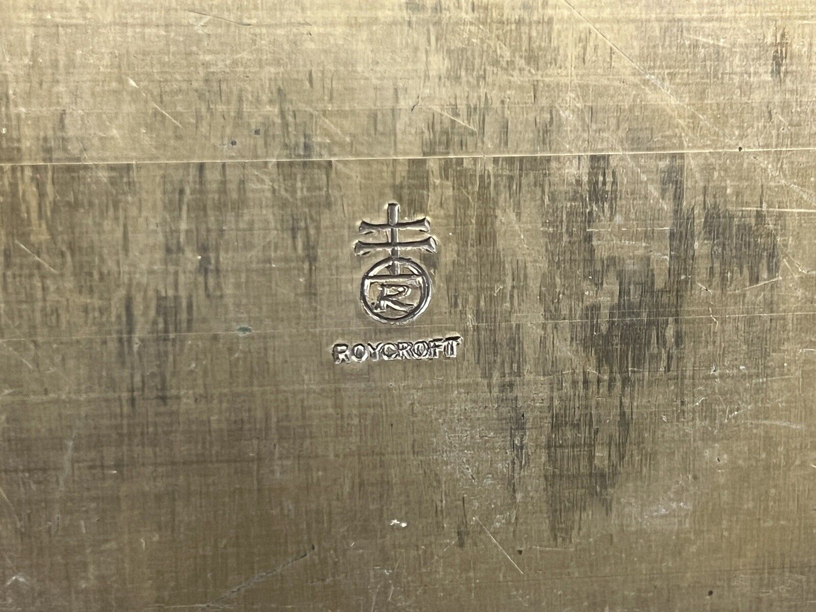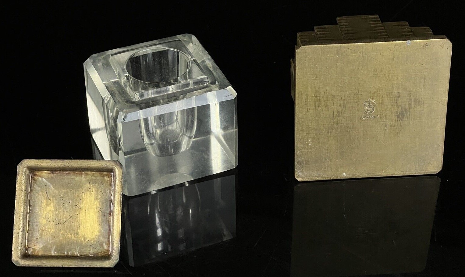 A square glass inkwell is housed in a hand-hammered brass over copper base with an indented vertical slab design. The lid is not attached and completes the Art Deco look. The Roycroft mark is impressed on the underside.