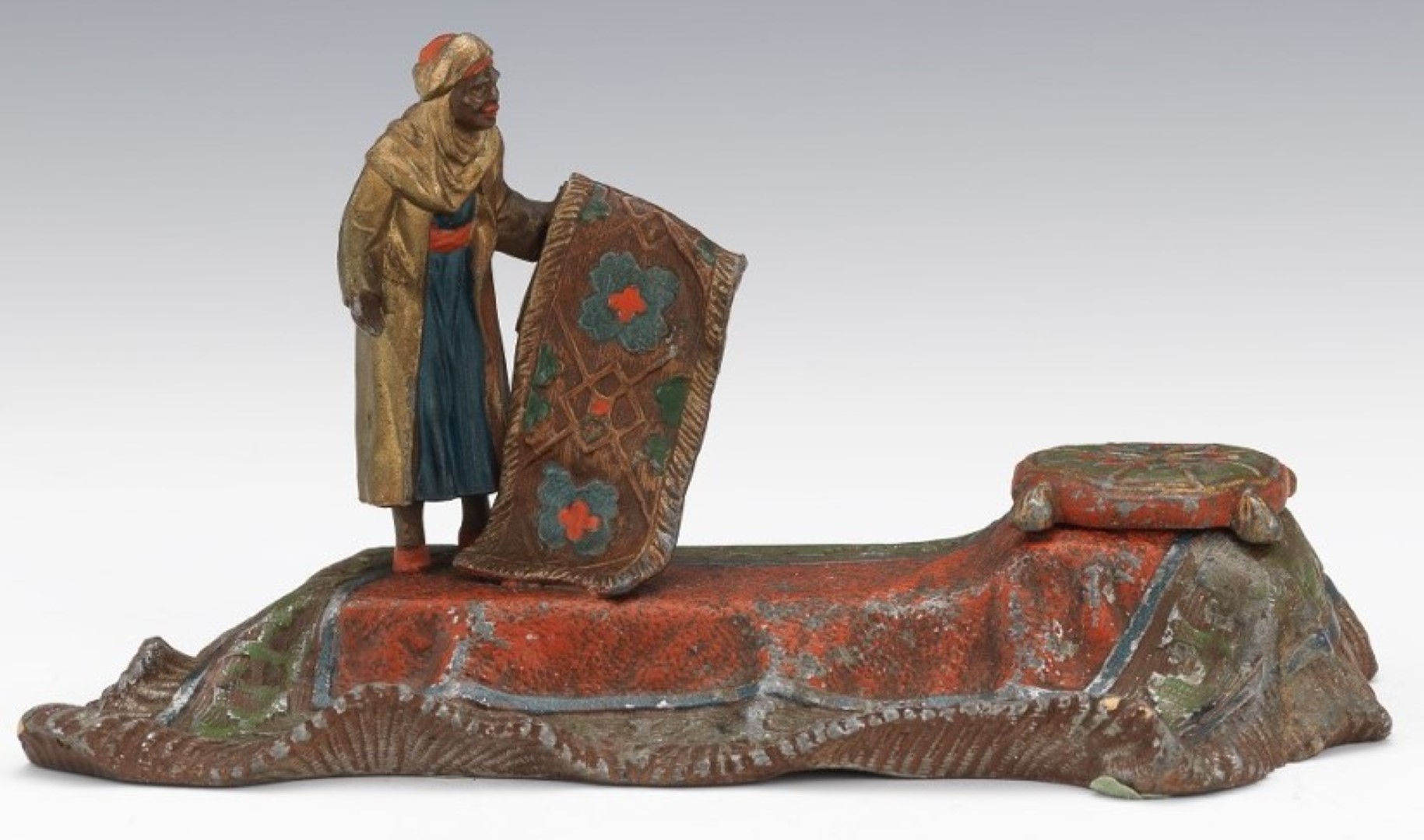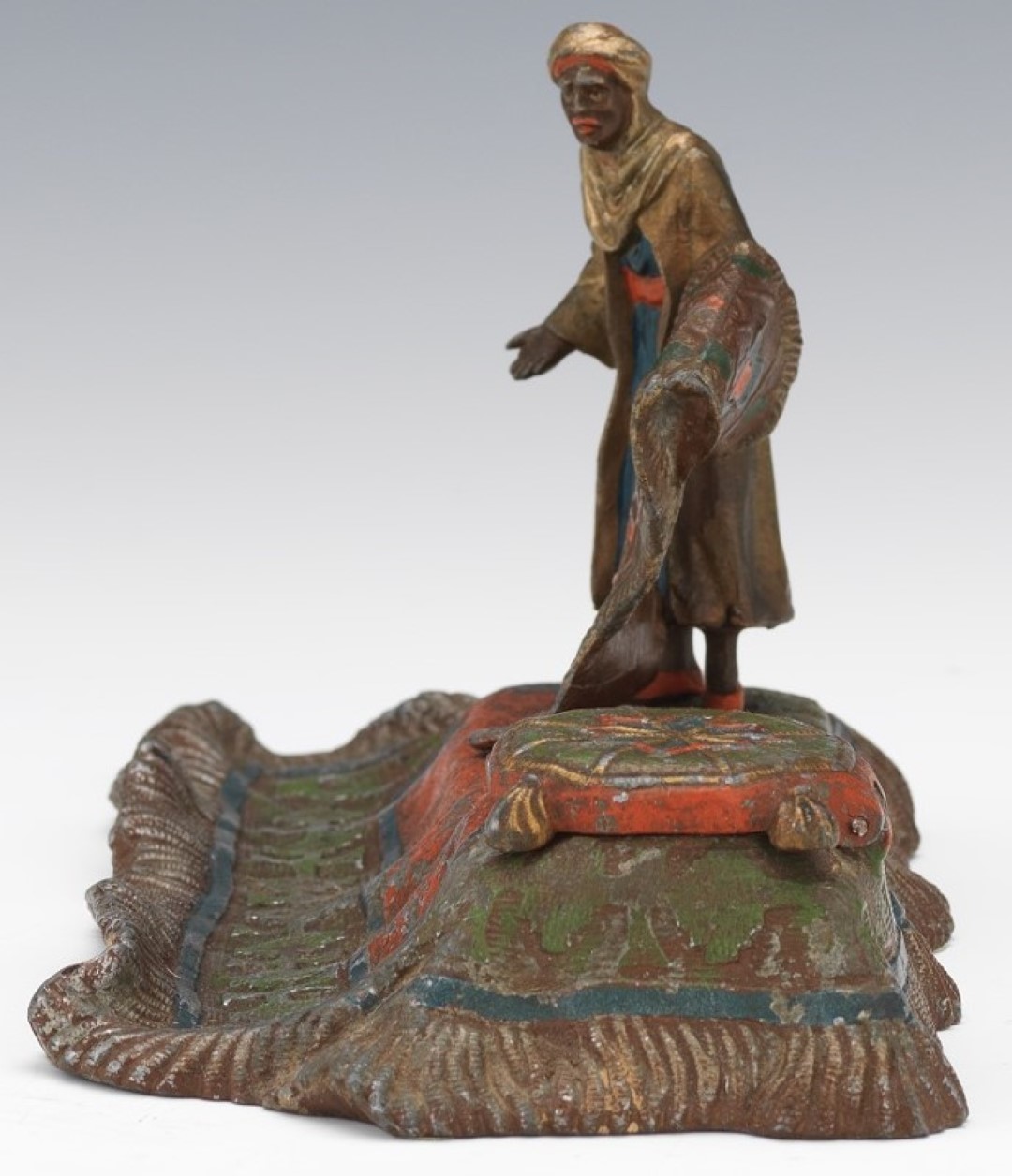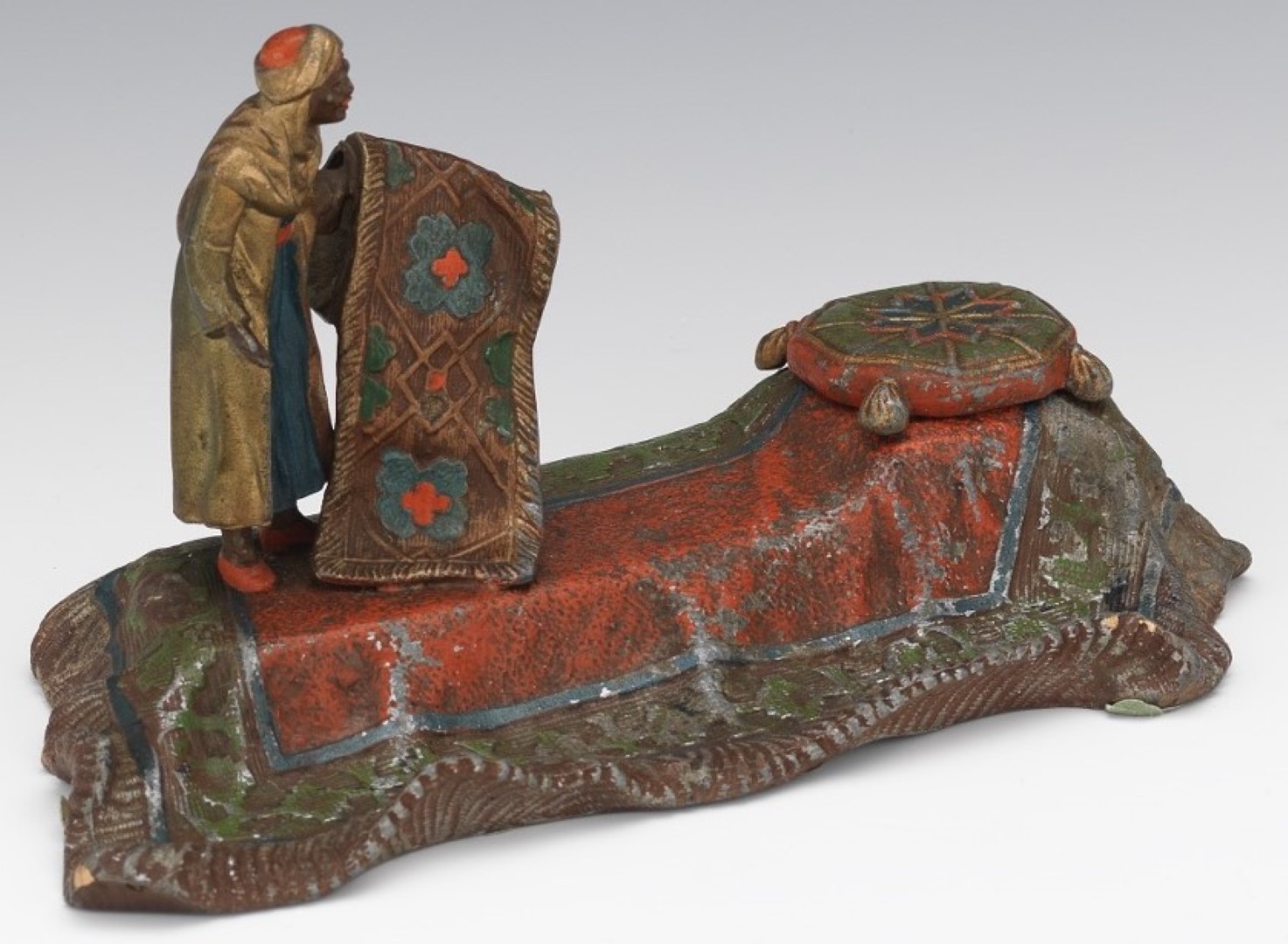 An Arab man standing on a large, fringed Oriental carpet holds an Oriental rug runner. Next to him is a tasseled pillow with a hinged cover that opens to expose the inkwell. Made of cold-painted white metal, the piece is stamped on the underside: “Trade Mark Coronet Registered Austria.”