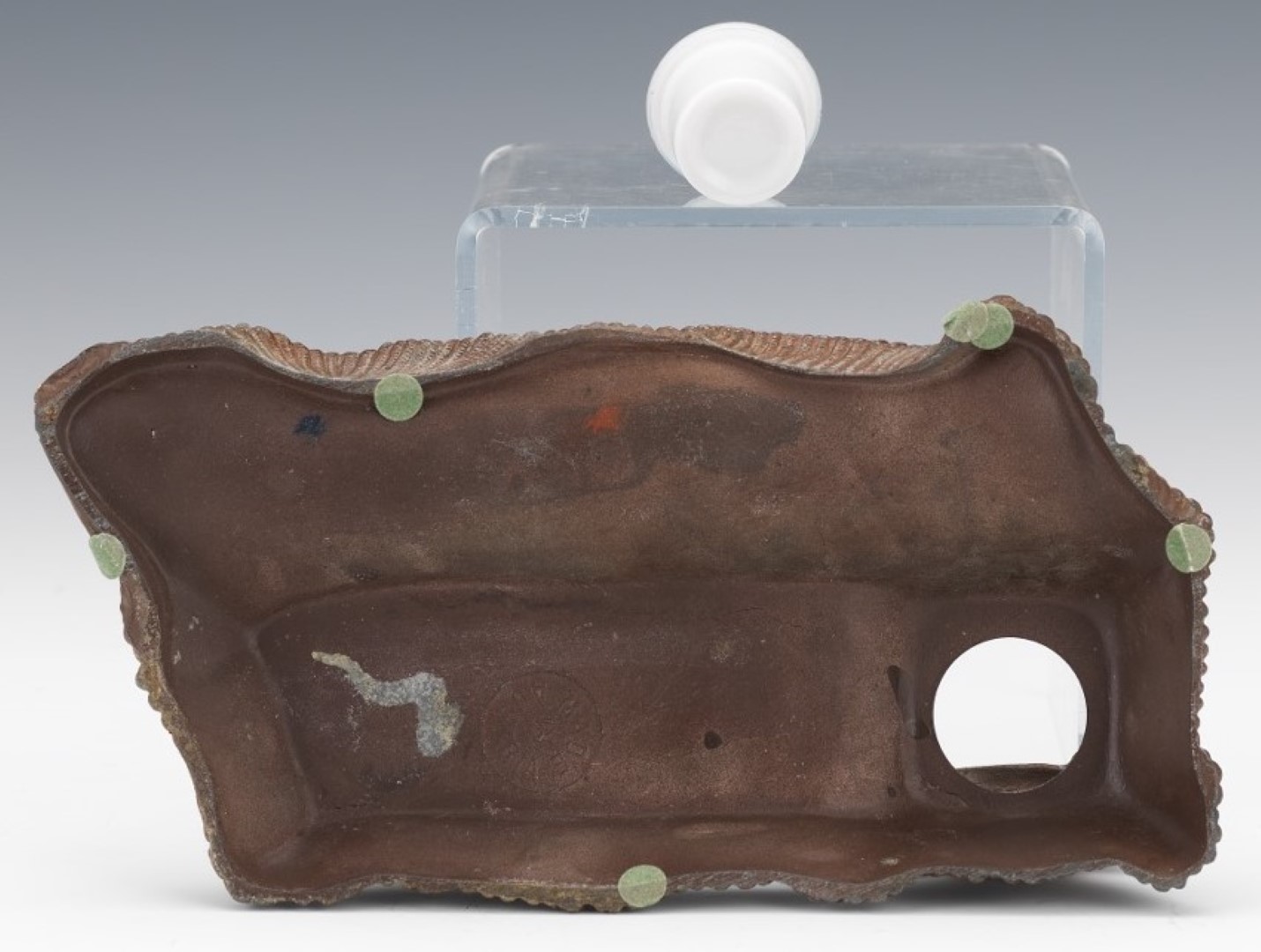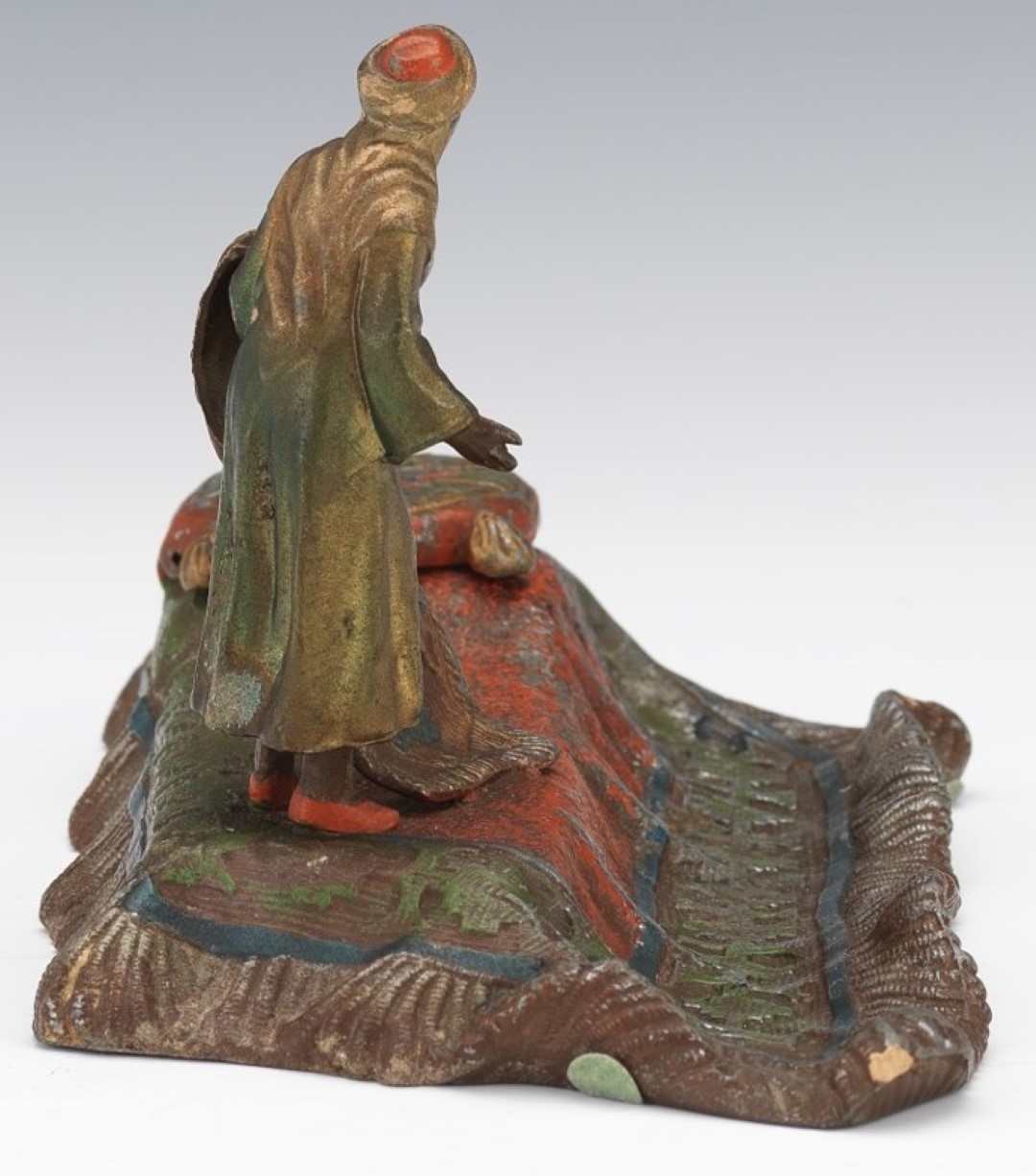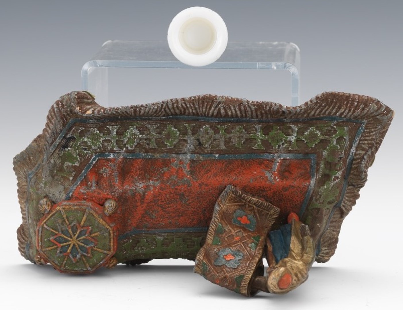 An Arab man standing on a large, fringed Oriental carpet holds an Oriental rug runner. Next to him is a tasseled pillow with a hinged cover that opens to expose the inkwell. Made of cold-painted white metal, the piece is stamped on the underside: “Trade Mark Coronet Registered Austria.”