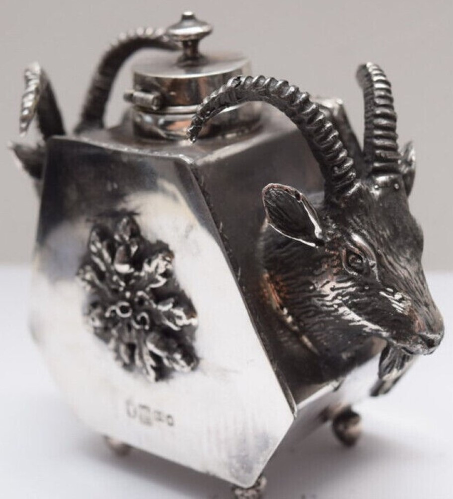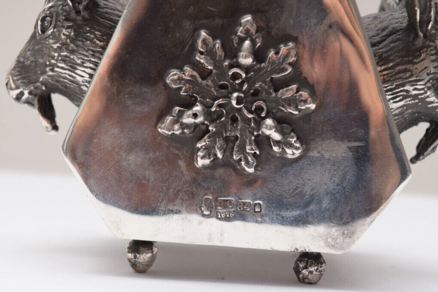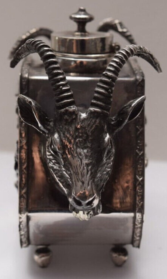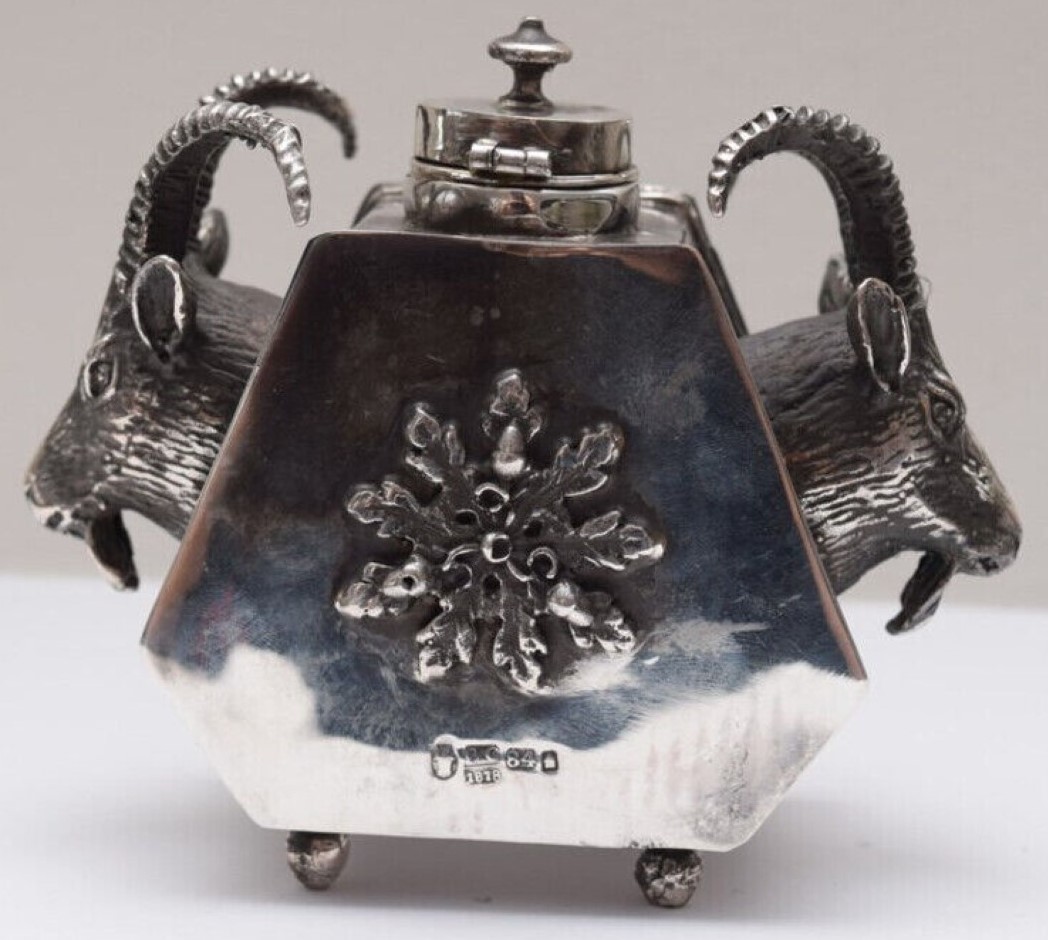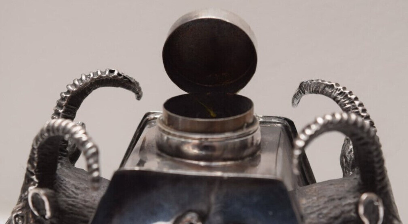 This hunting-themed inkwell features the head of a long-horned animal (Ibex, Mountain Goat, Chamois?) on both ends of this Russian silver inkwell supported on ball feet. The piece is hallmarked “84” (meaning .875 silver). I’m assuming 1878 is the date the piece was made.