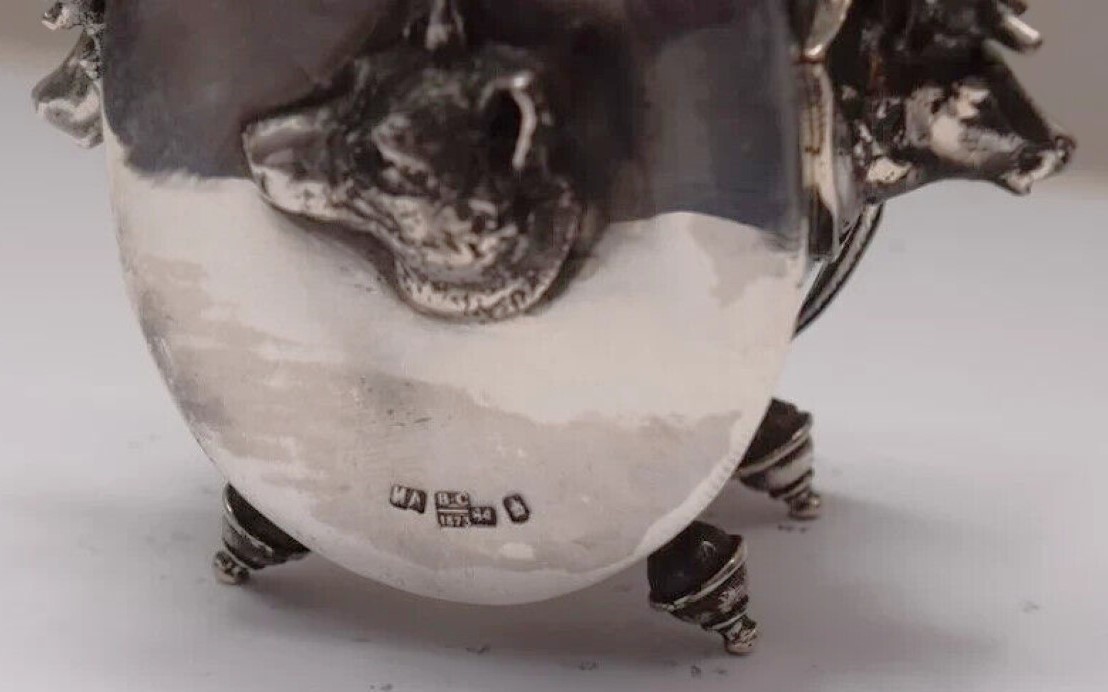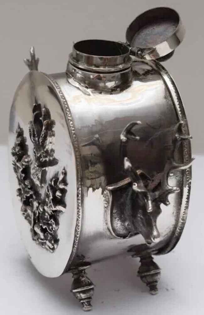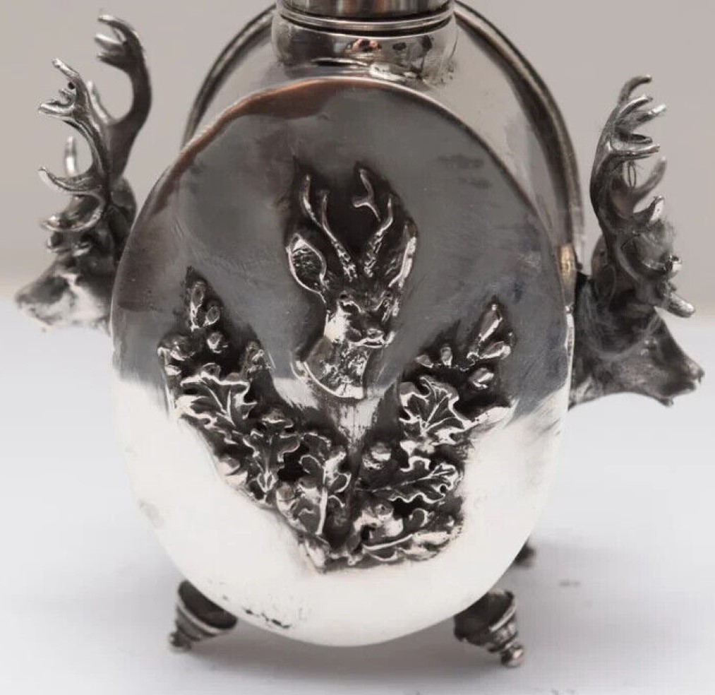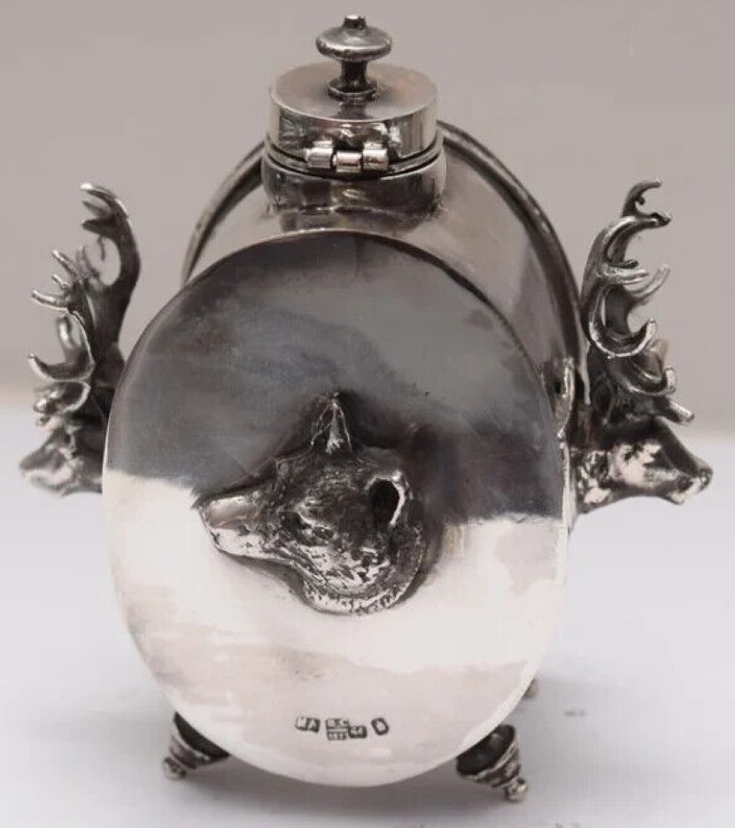 This hunting-themed inkwell features stags’ heads on both ends of this Russian silver inkwell supported on spindle feet. On one side is a stag’s head and wreath, and on the other, the head of a fox. The piece is hallmarked.