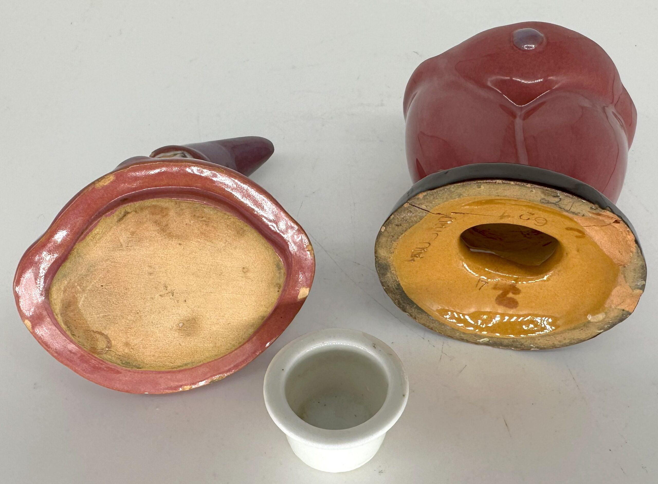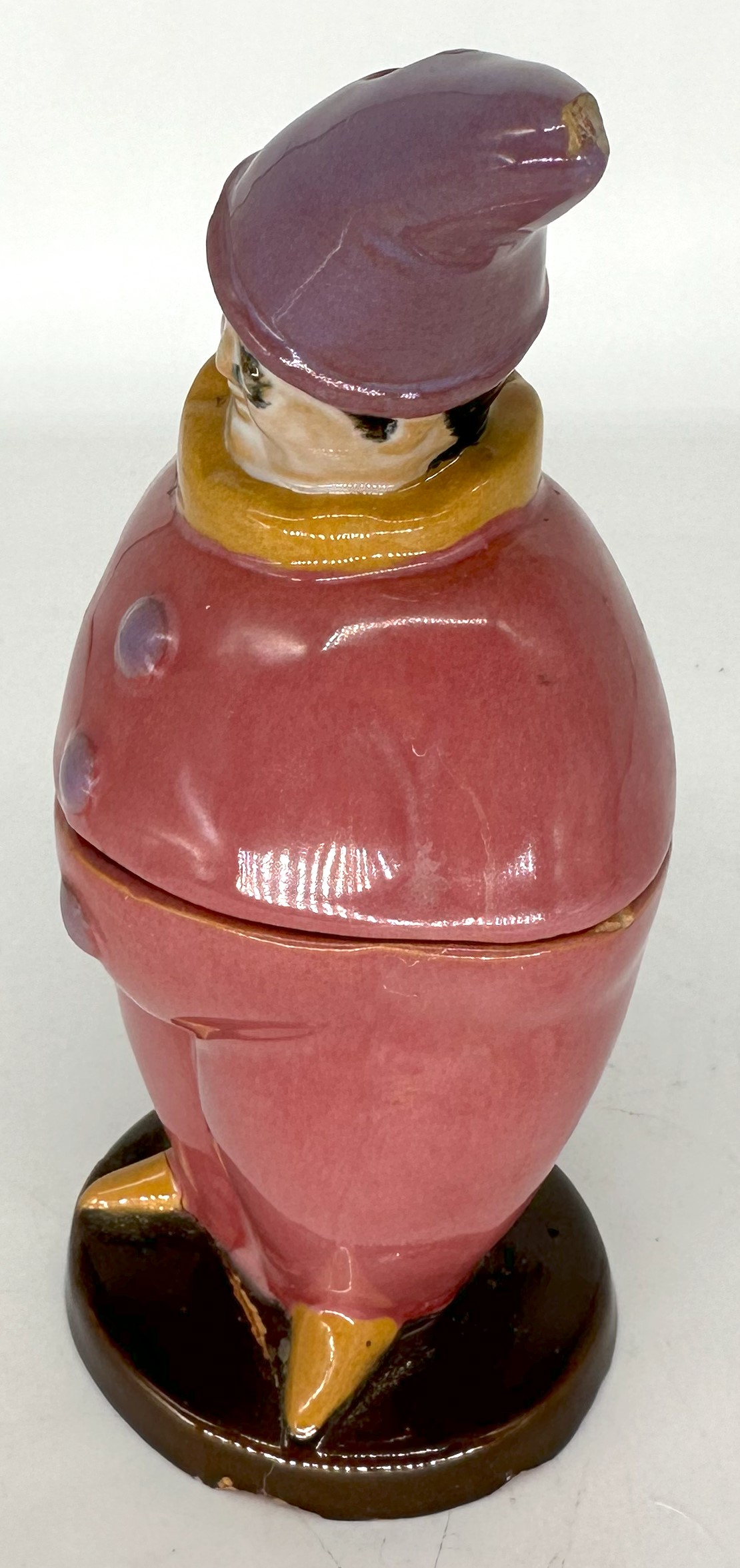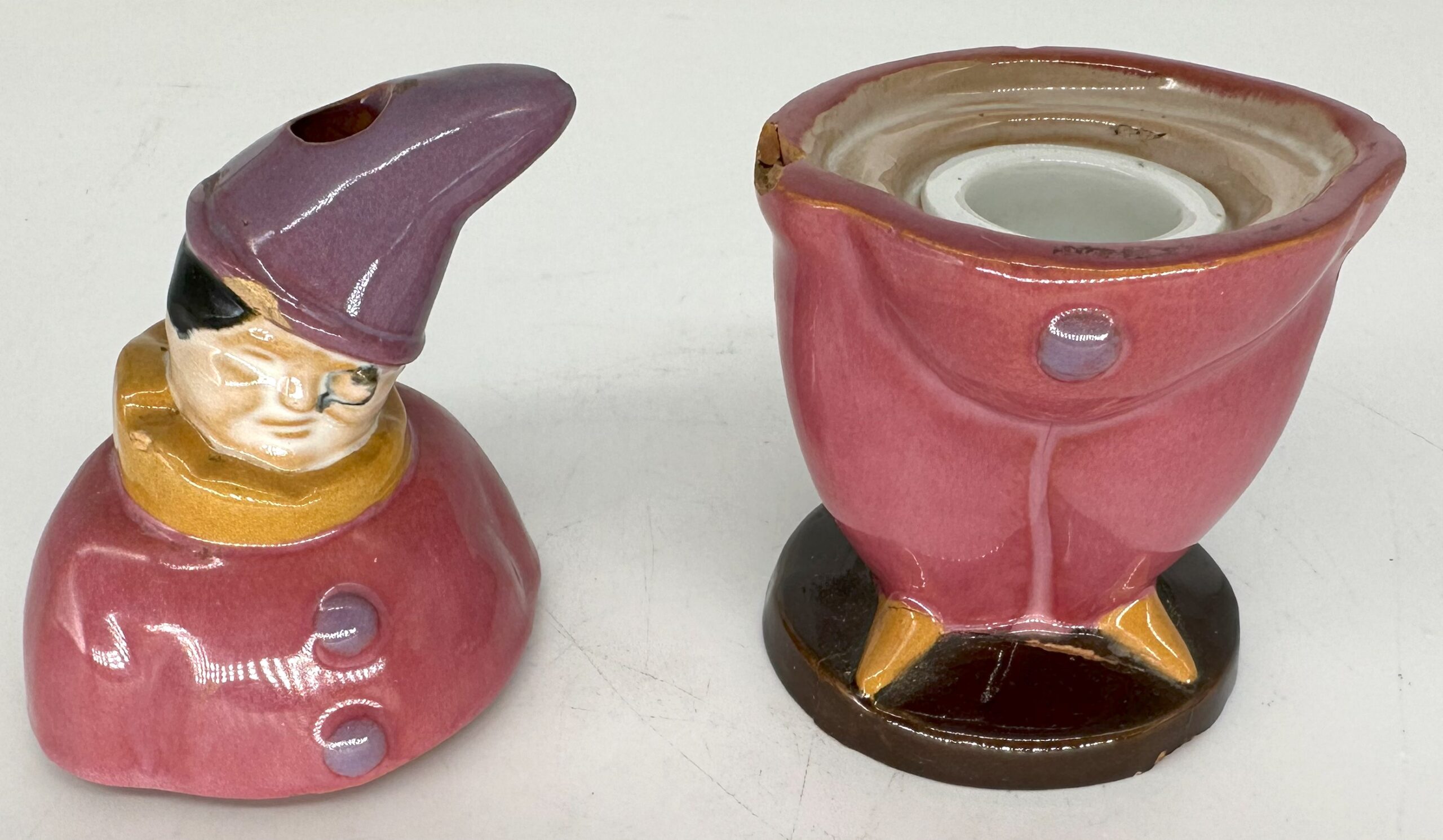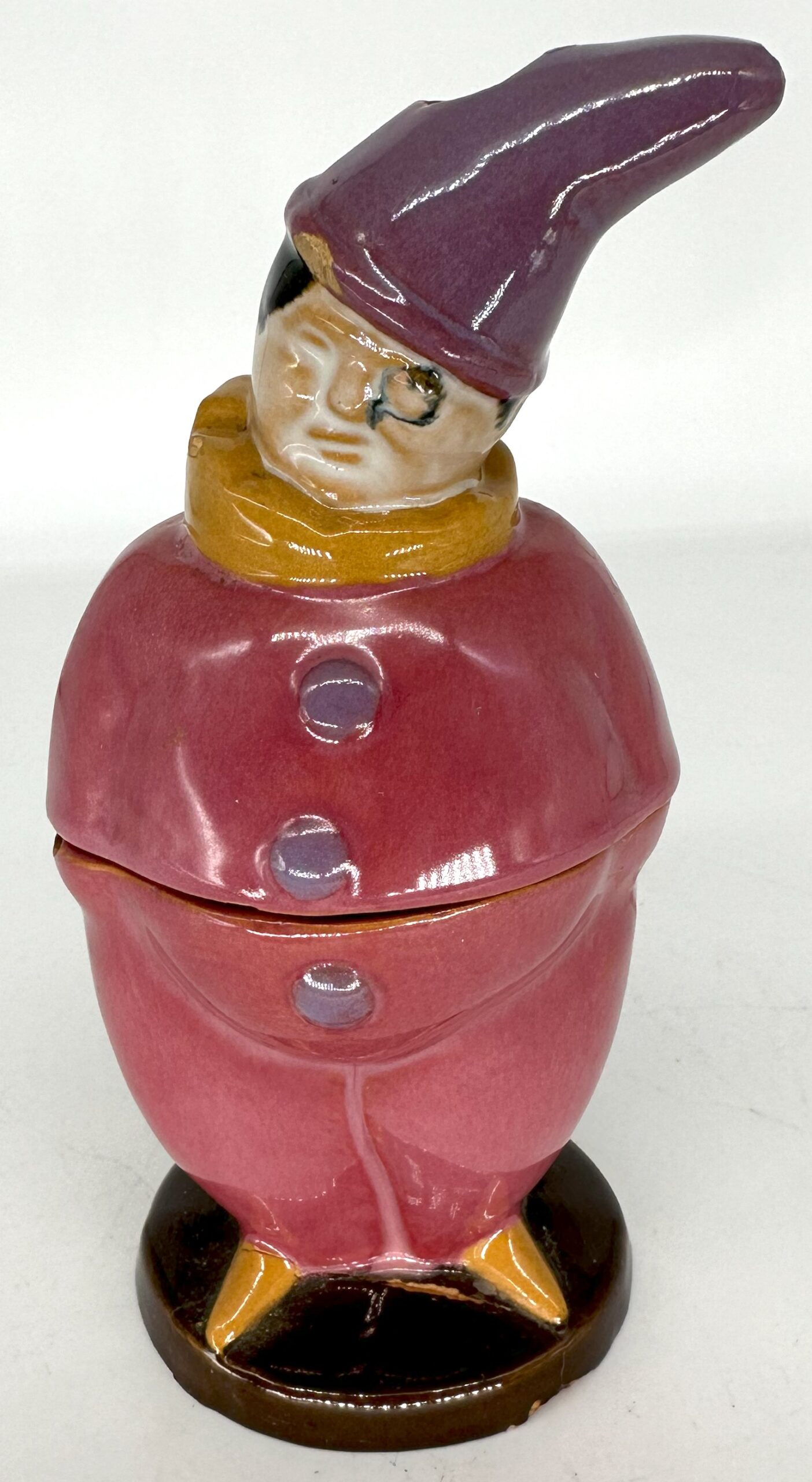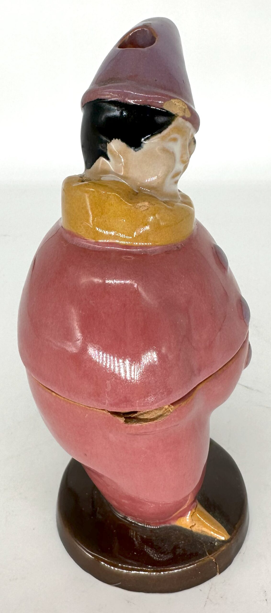 A sad-eyed clown stands with his head tilted. Lusterware pottery marked “Austria” and #62 and #17.