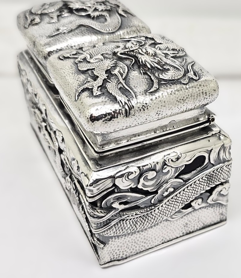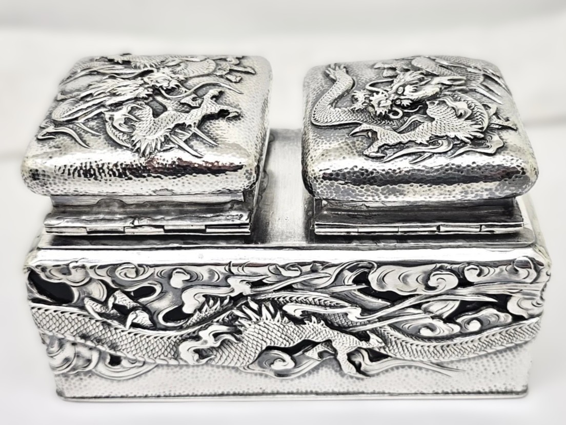 - The Inkwells: The two central wells feature hinged silver lids decorated with matching dragon motifs. Inside the glass housings are two removable sterling silver inserts, which would have held the ink.