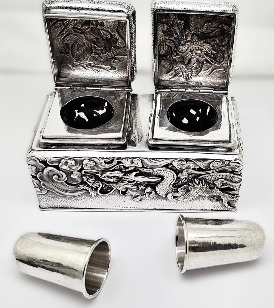 This Samurai Shokai double inkwell is an exceptional piece of Japanese Meiji-era export silver, representing the height of craftsmanship produced in Yokohama for the international luxury market.