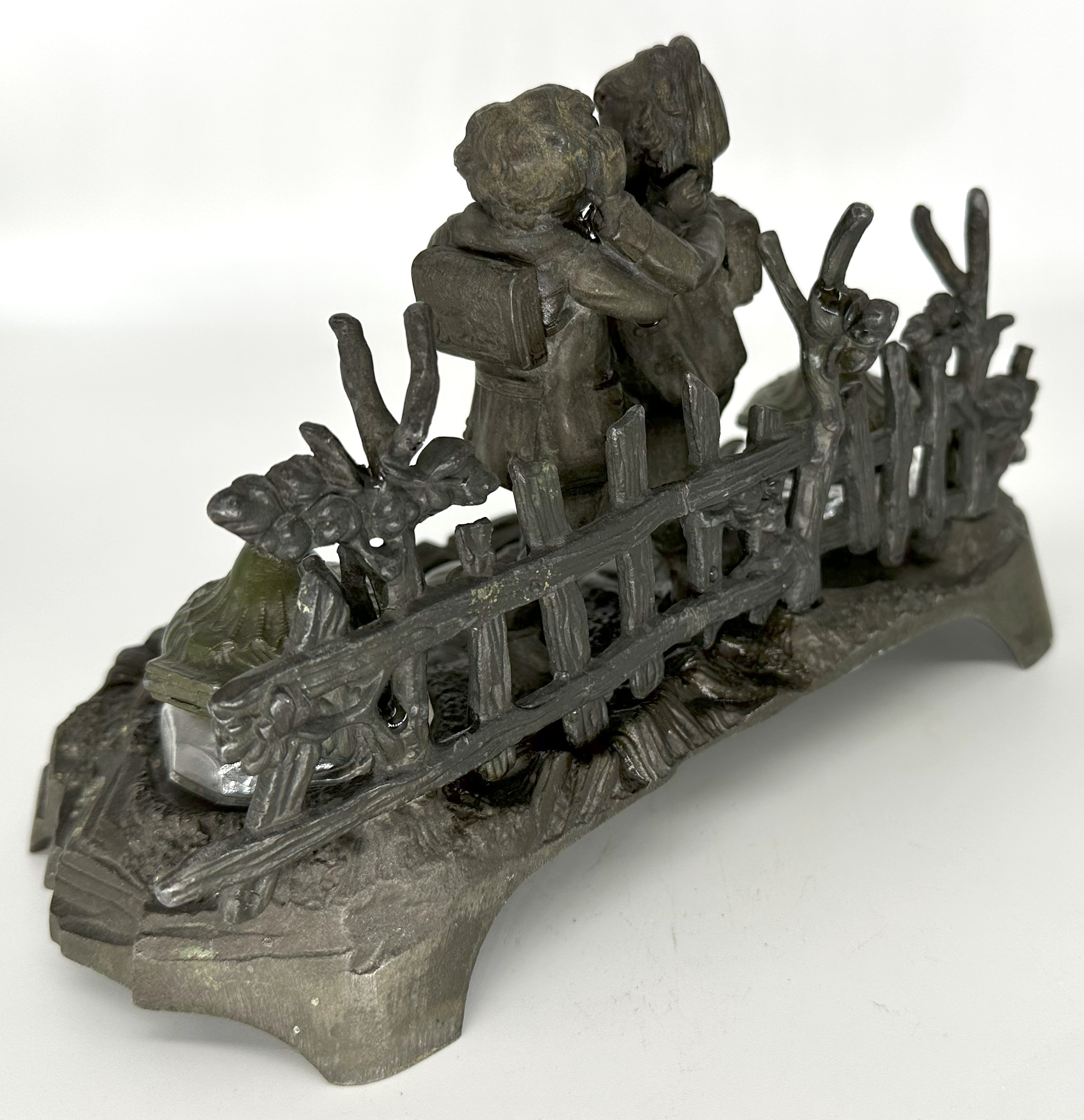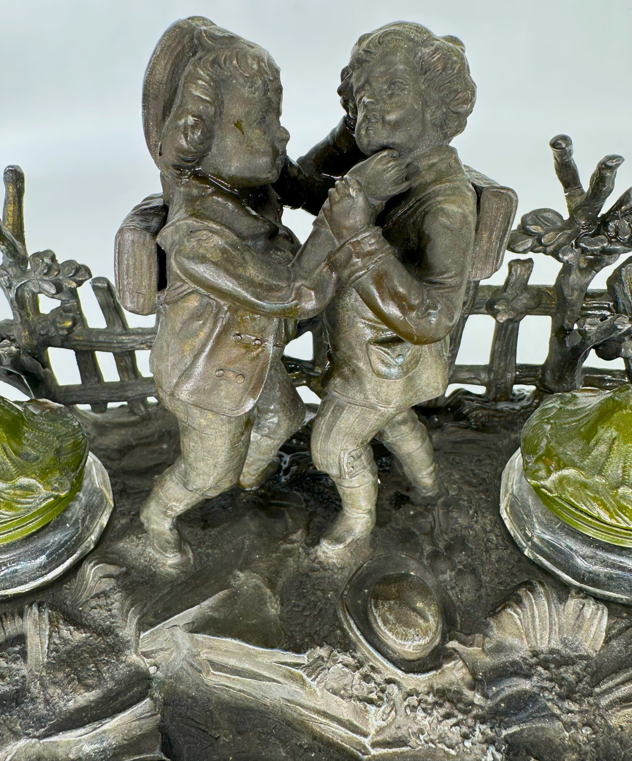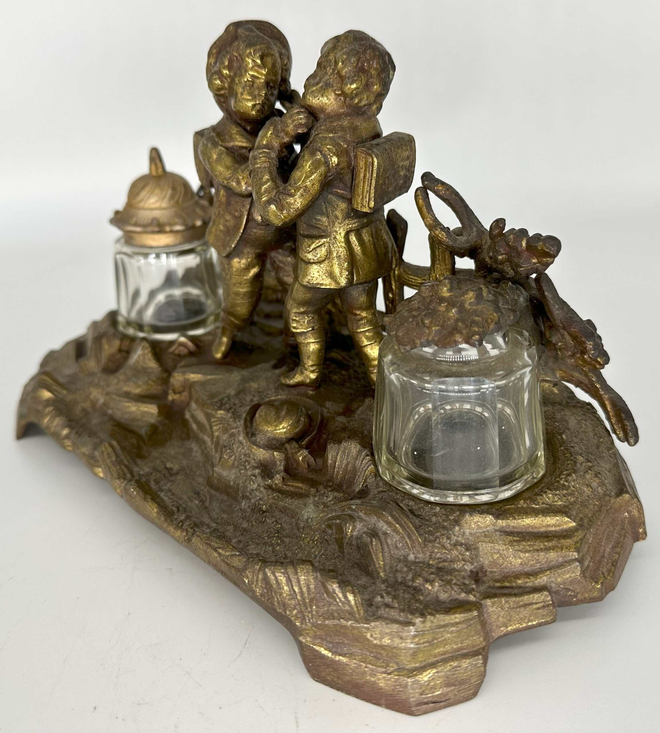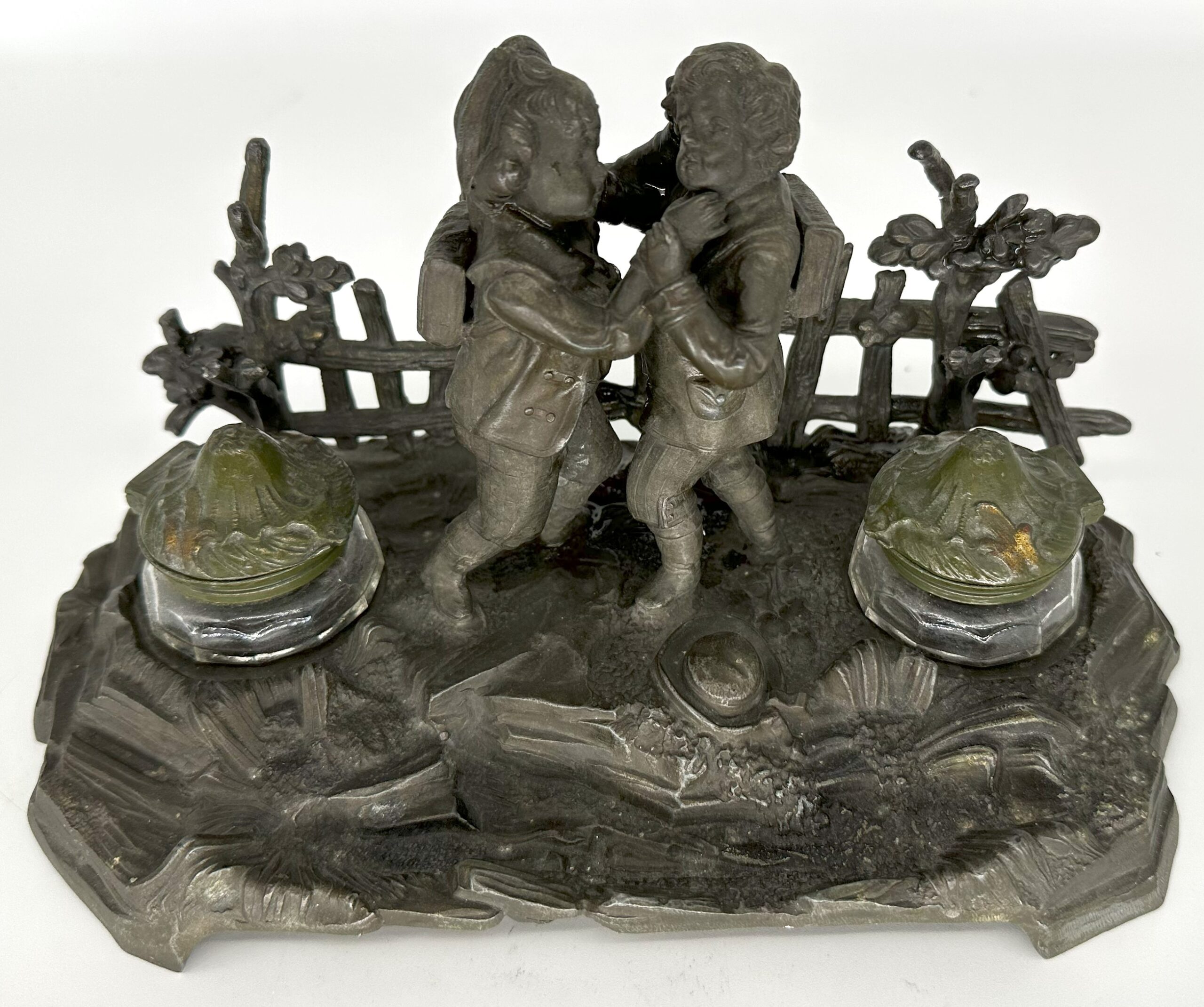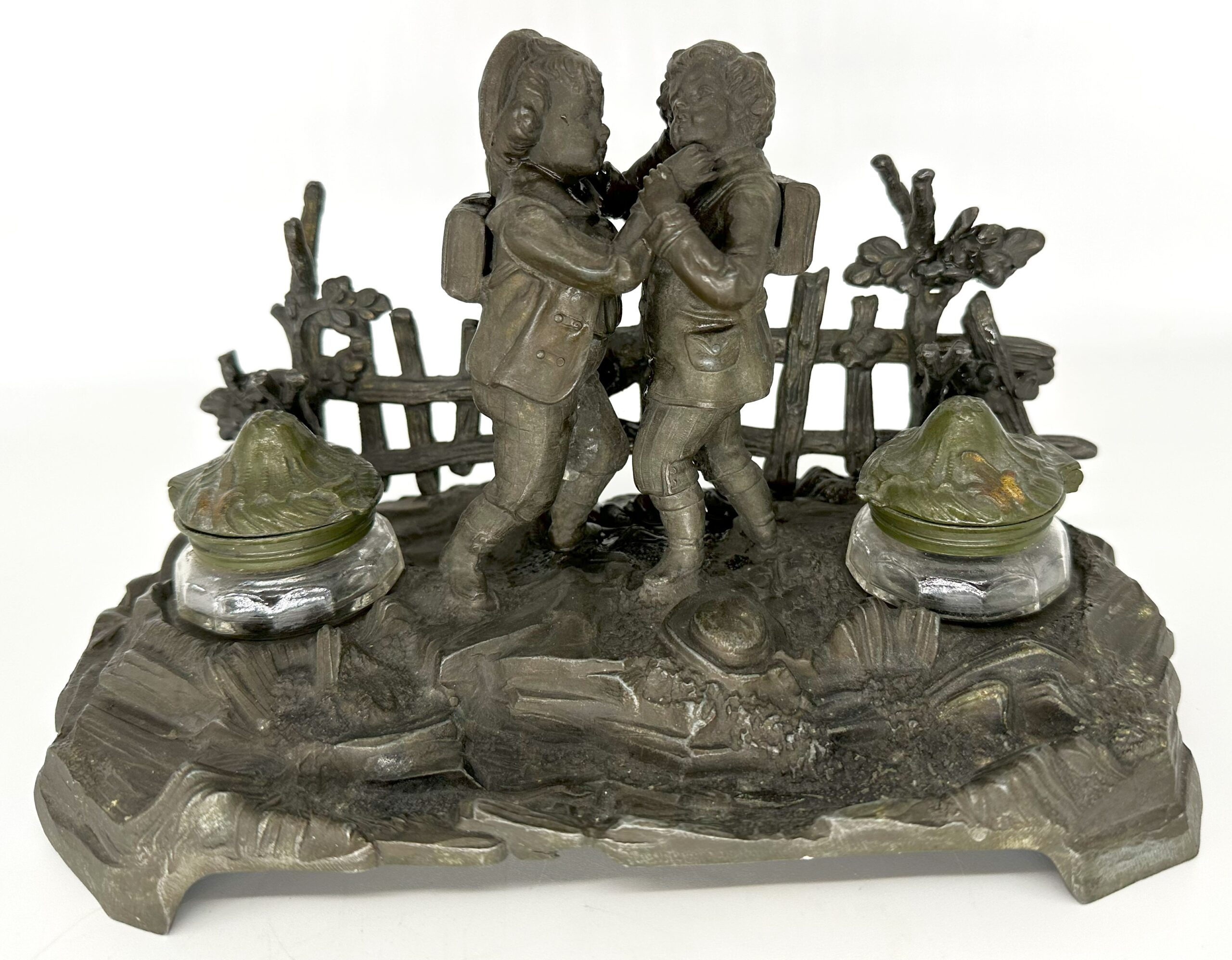 It all comes down to fisticuffs as two schoolboys duke it out. Detailed rendering with one boy’s hat already on the rocky terrain. The fence in the rear works as a pen holder. Two versions shown: one made of white metal, the other brass.