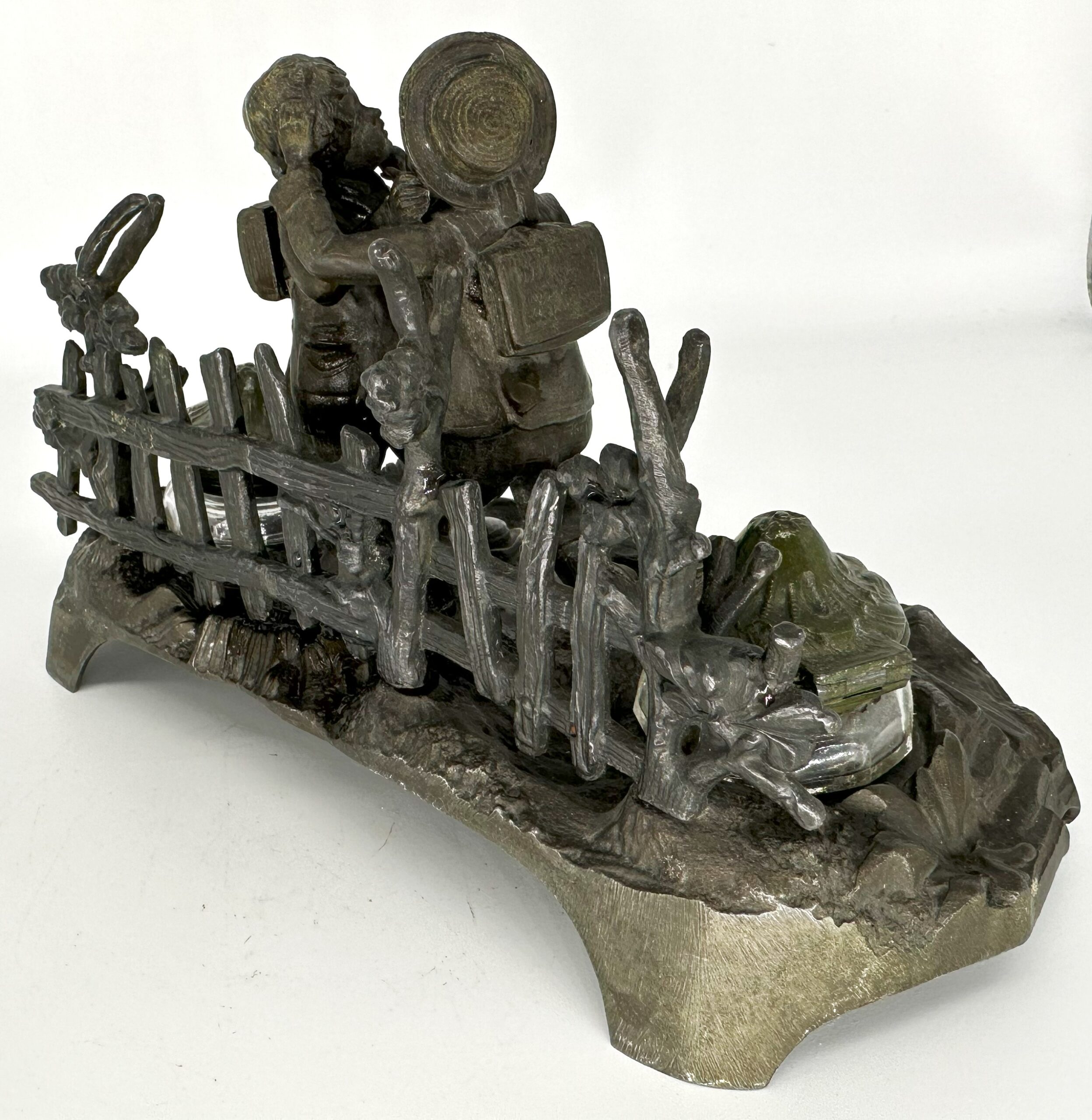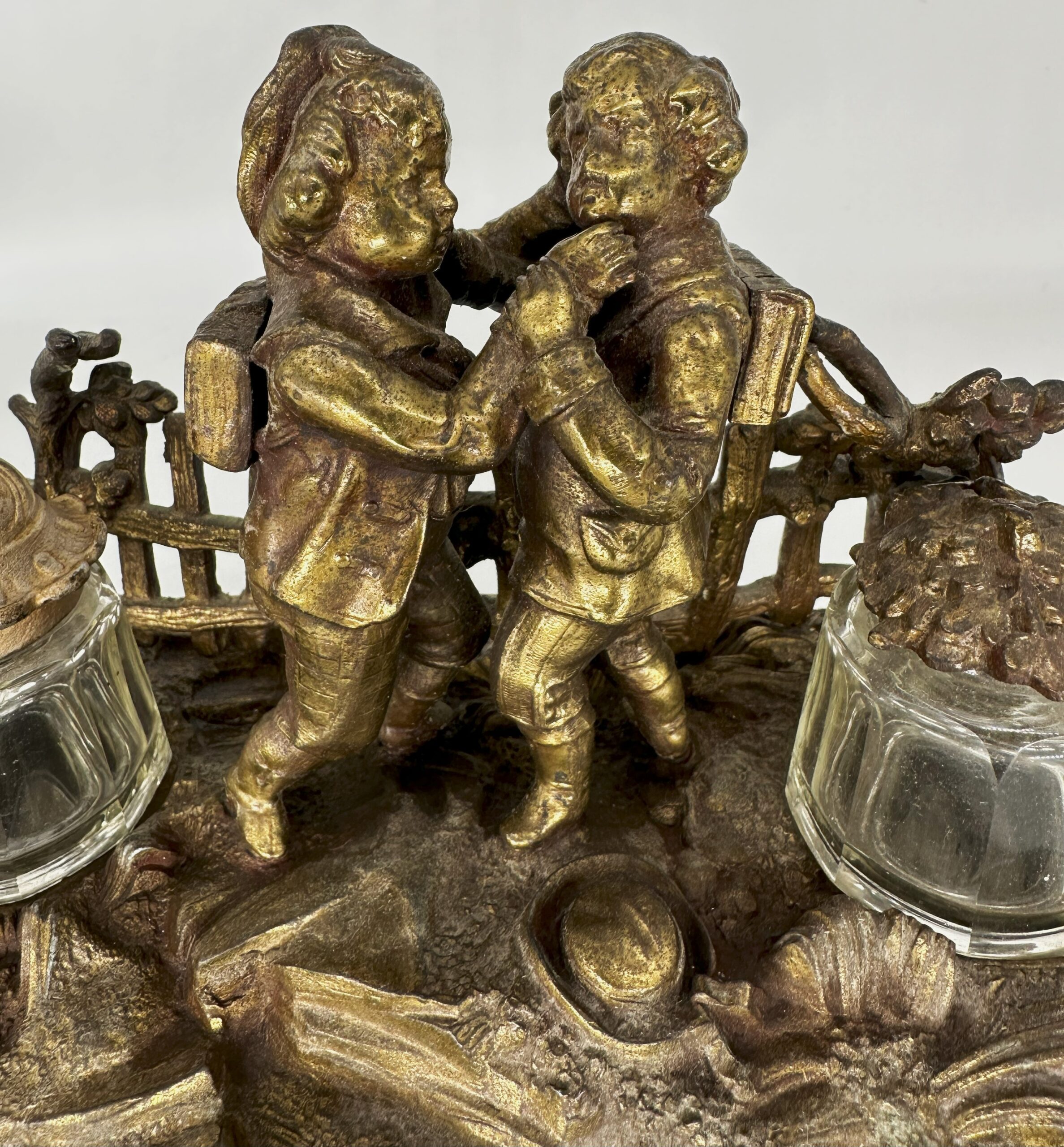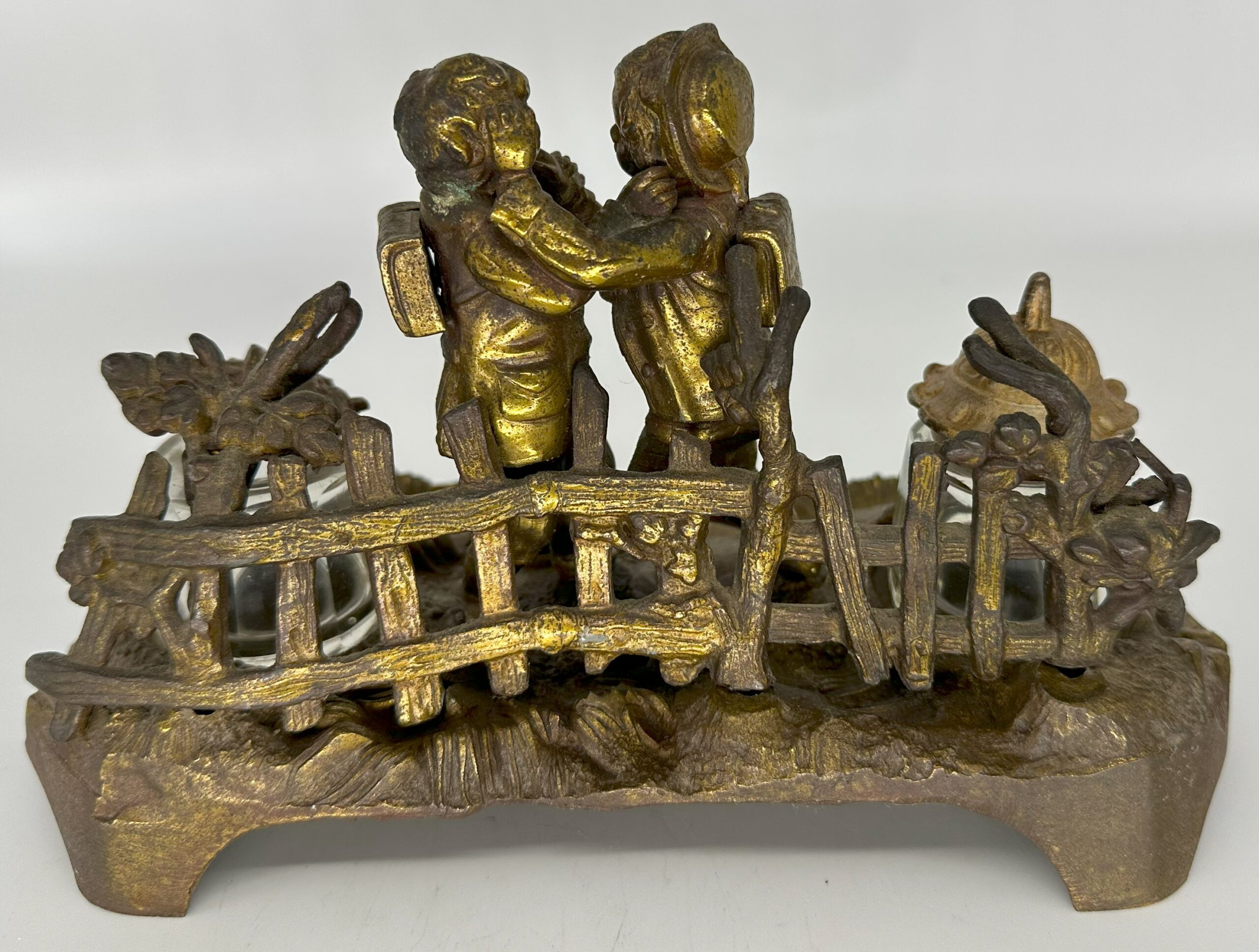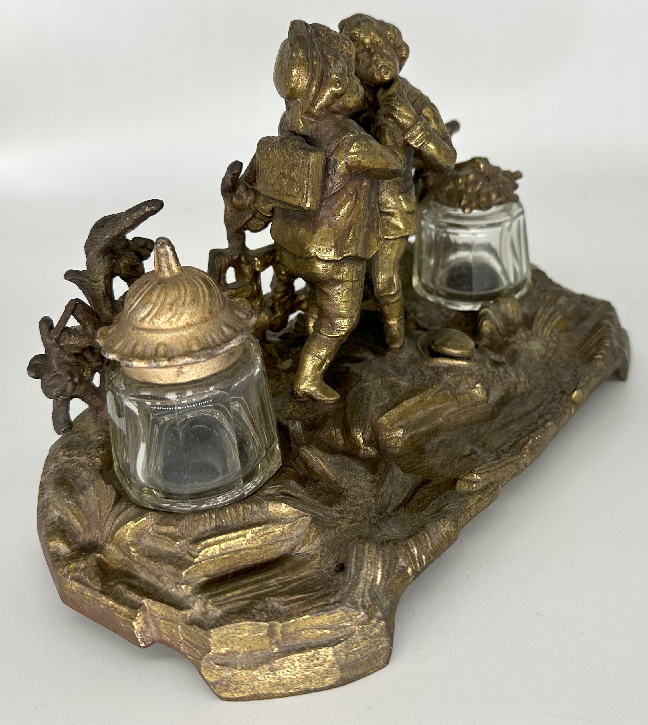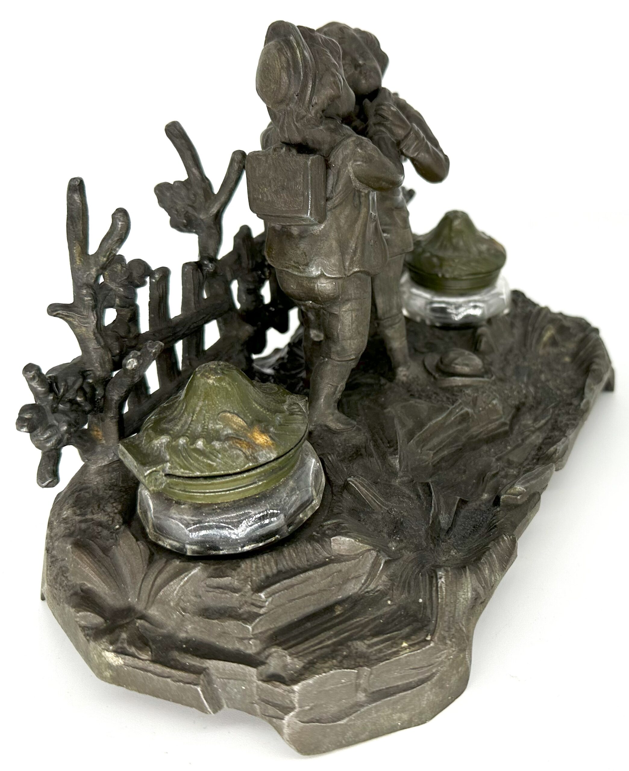 It all comes down to fisticuffs as two schoolboys duke it out. Detailed rendering with one boy’s hat already on the rocky terrain. The fence in the rear works as a pen holder. Two versions shown: one made of white metal, the other brass.