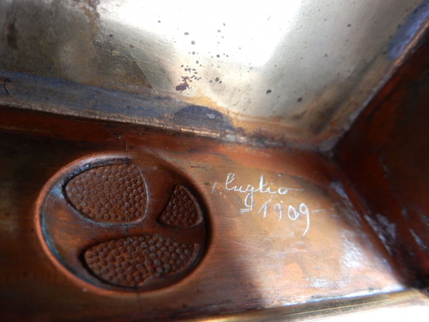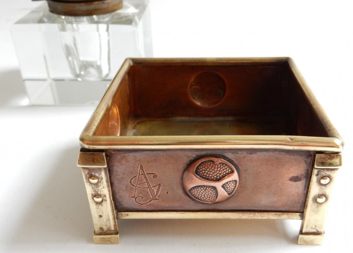 The inkwell is signed with the monogram ‘A.G.’ by the artist. This inkwell is an example of the Arts and Crafts, and was probably made in Glasgow, Scotland (Glasgow school).
