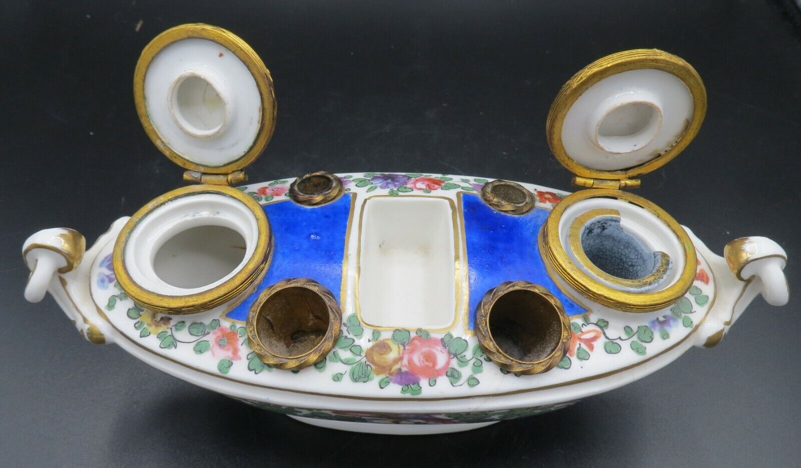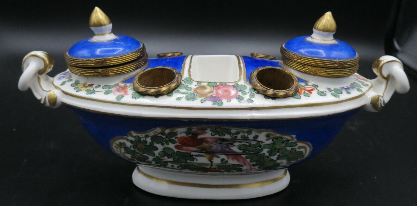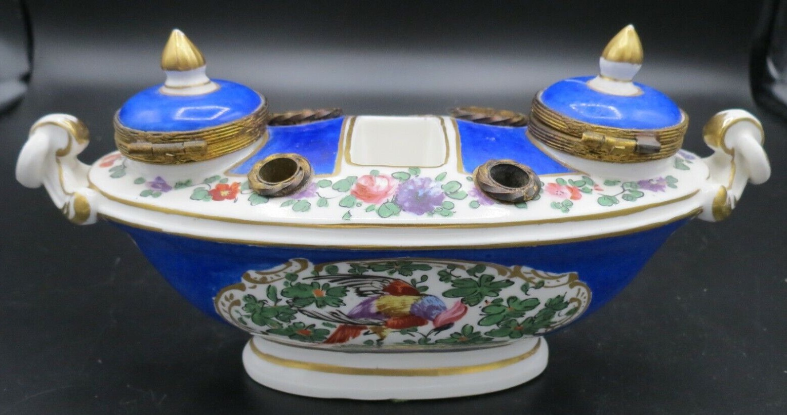Sèvres porcelain gondola-shaped inkstand featuring a hand painted bird-of-paradise. There are two inkwells with hinged lids flanking four pen holes and a central storage trough.