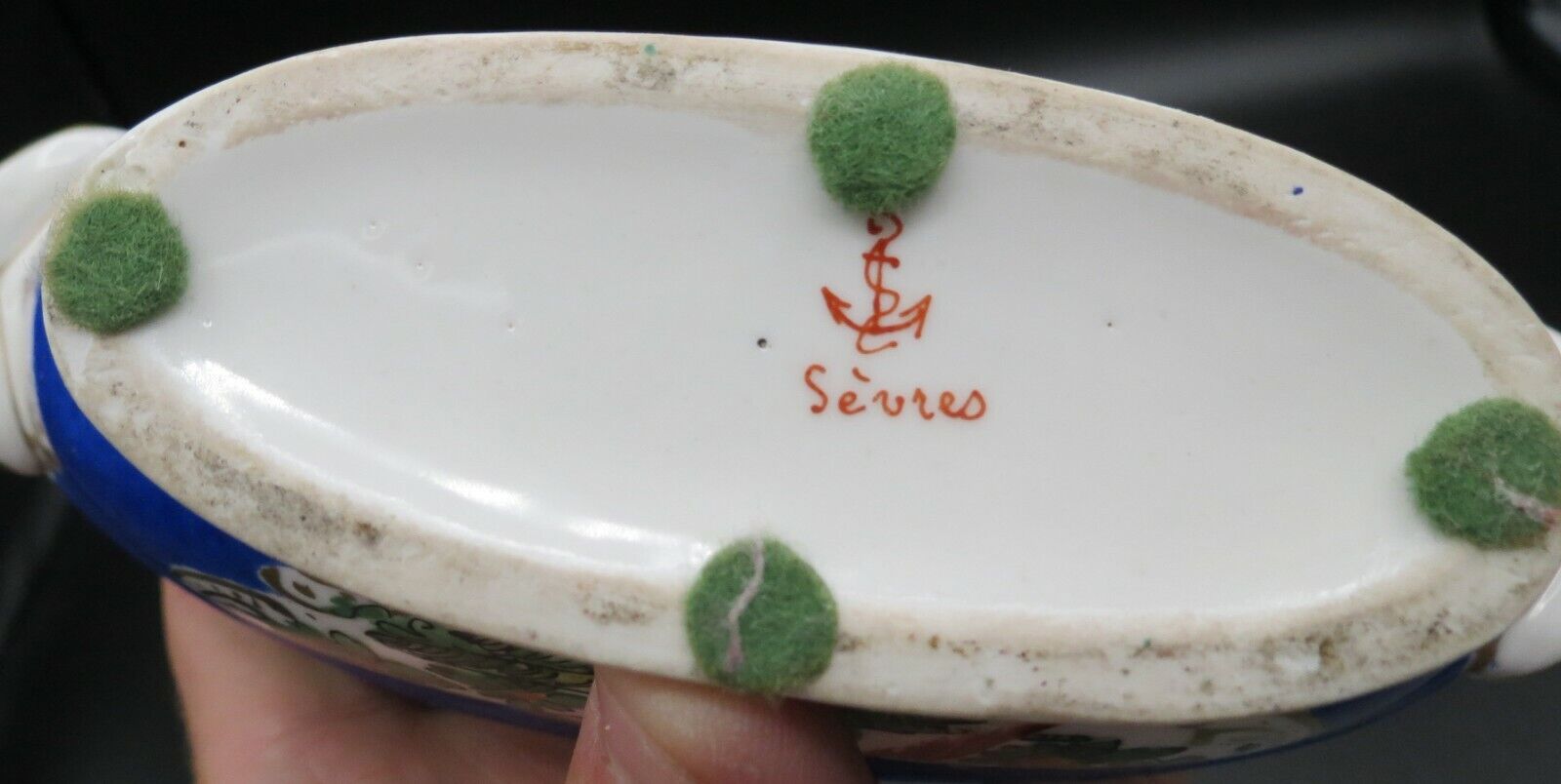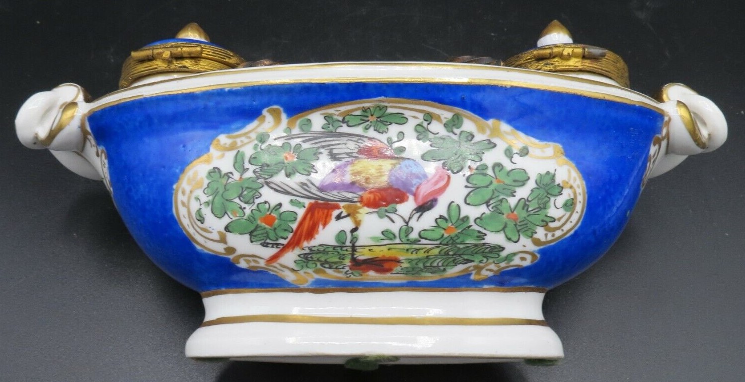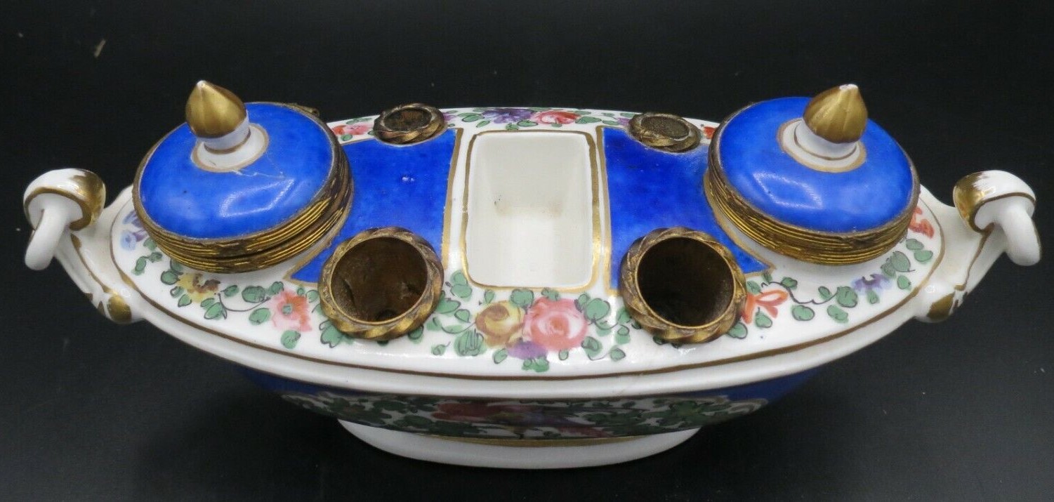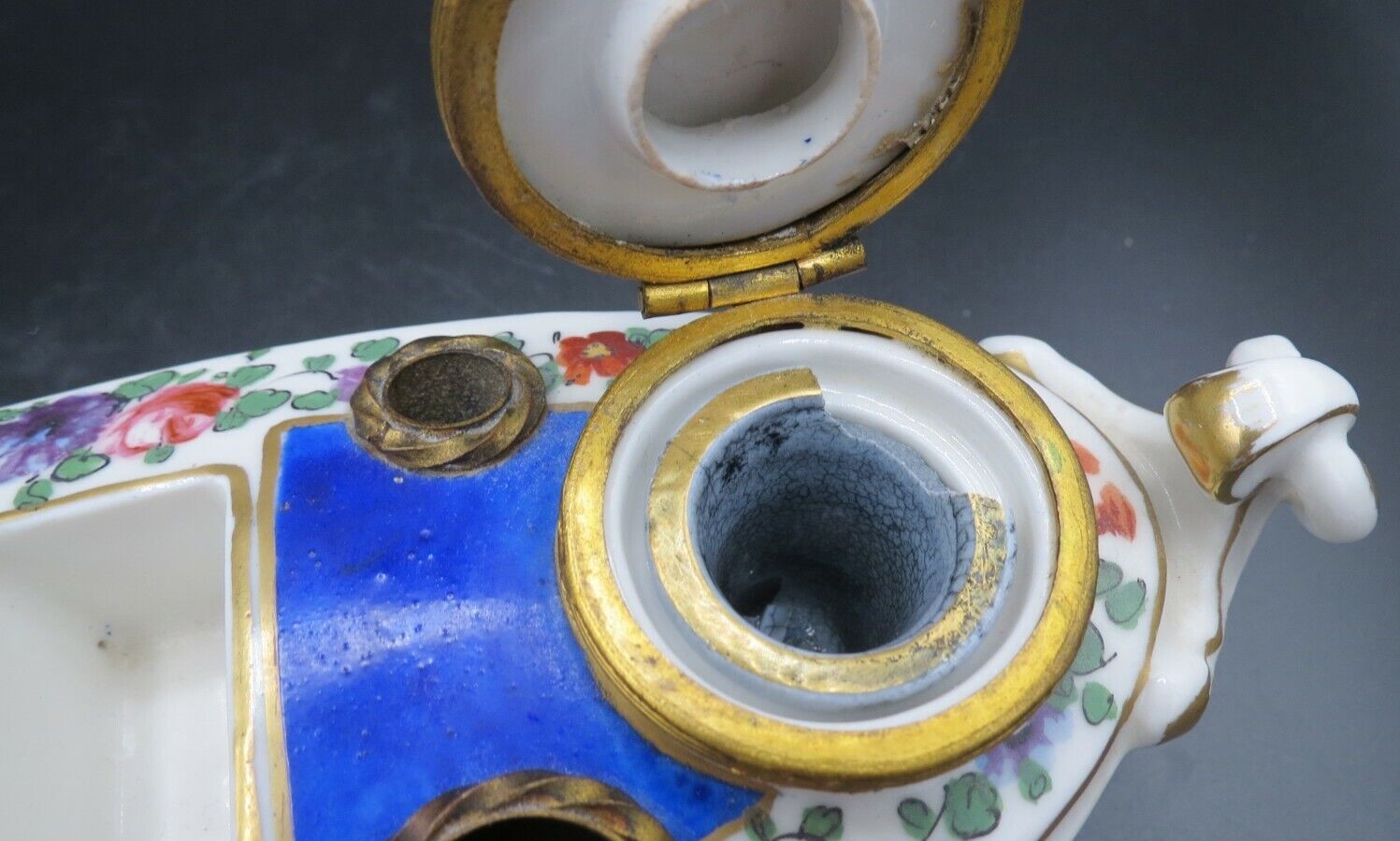 Sèvres porcelain gondola-shaped inkstand featuring a hand painted bird-of-paradise. There are two inkwells with hinged lids flanking four pen holes and a central storage trough.