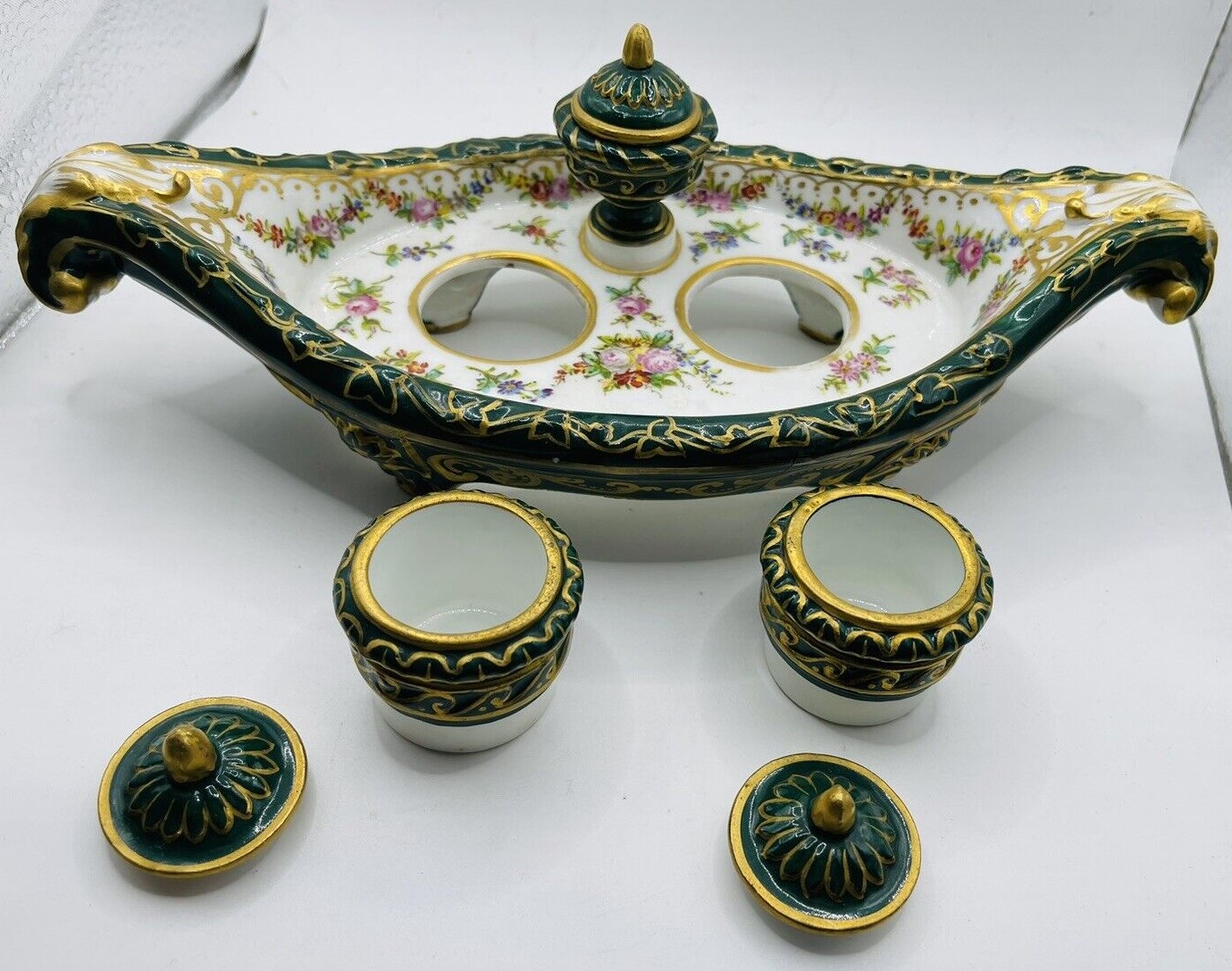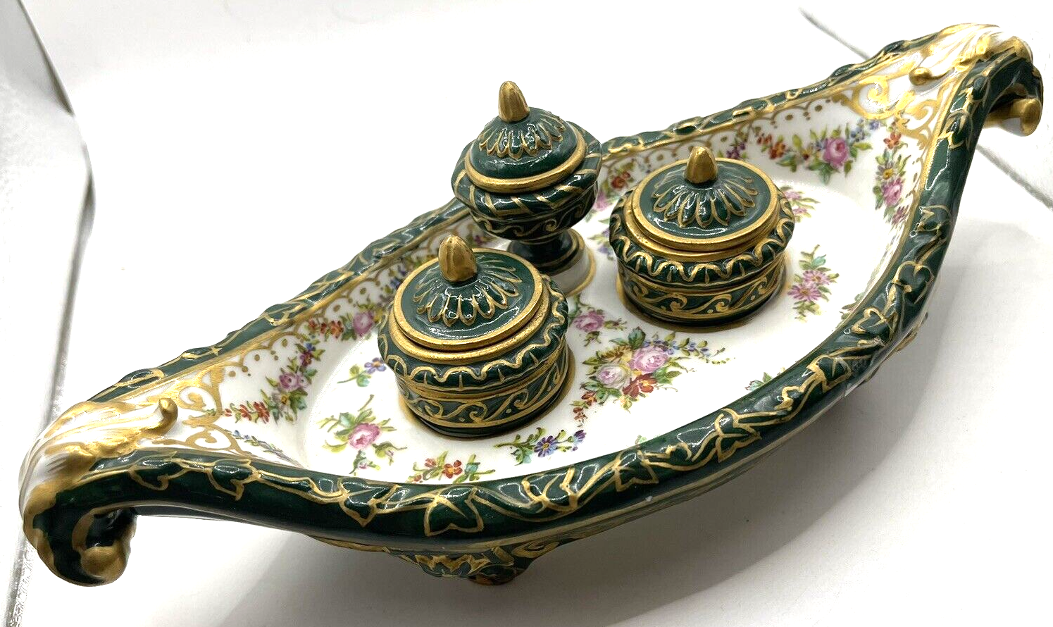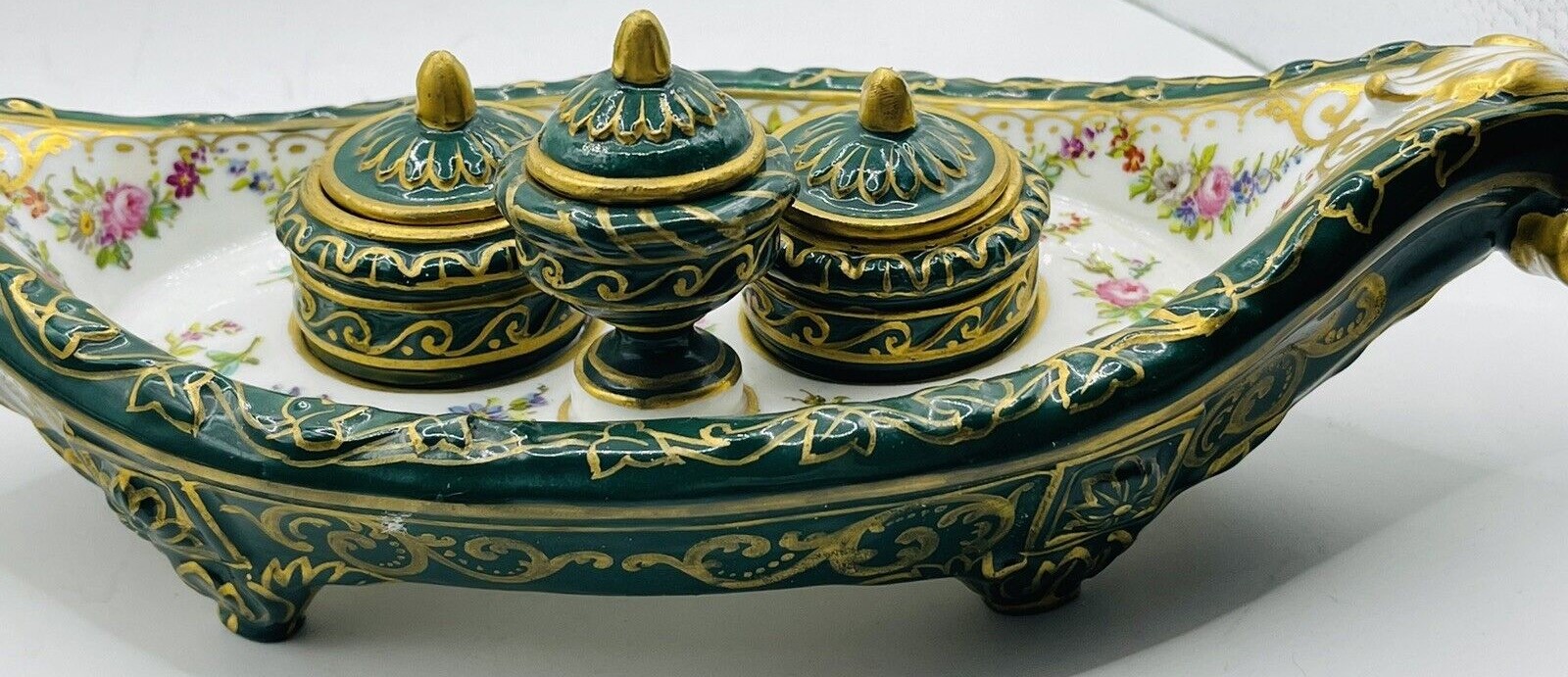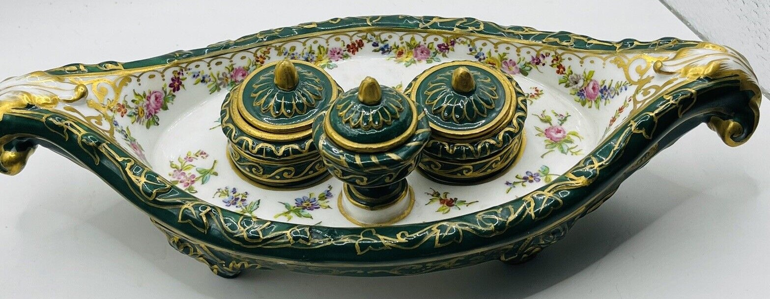 Hand painted white-base porcelain inkstand with scrolled handles, florals, green and gilt gold trim. It is marked “Mre Imple de Sevres France”.