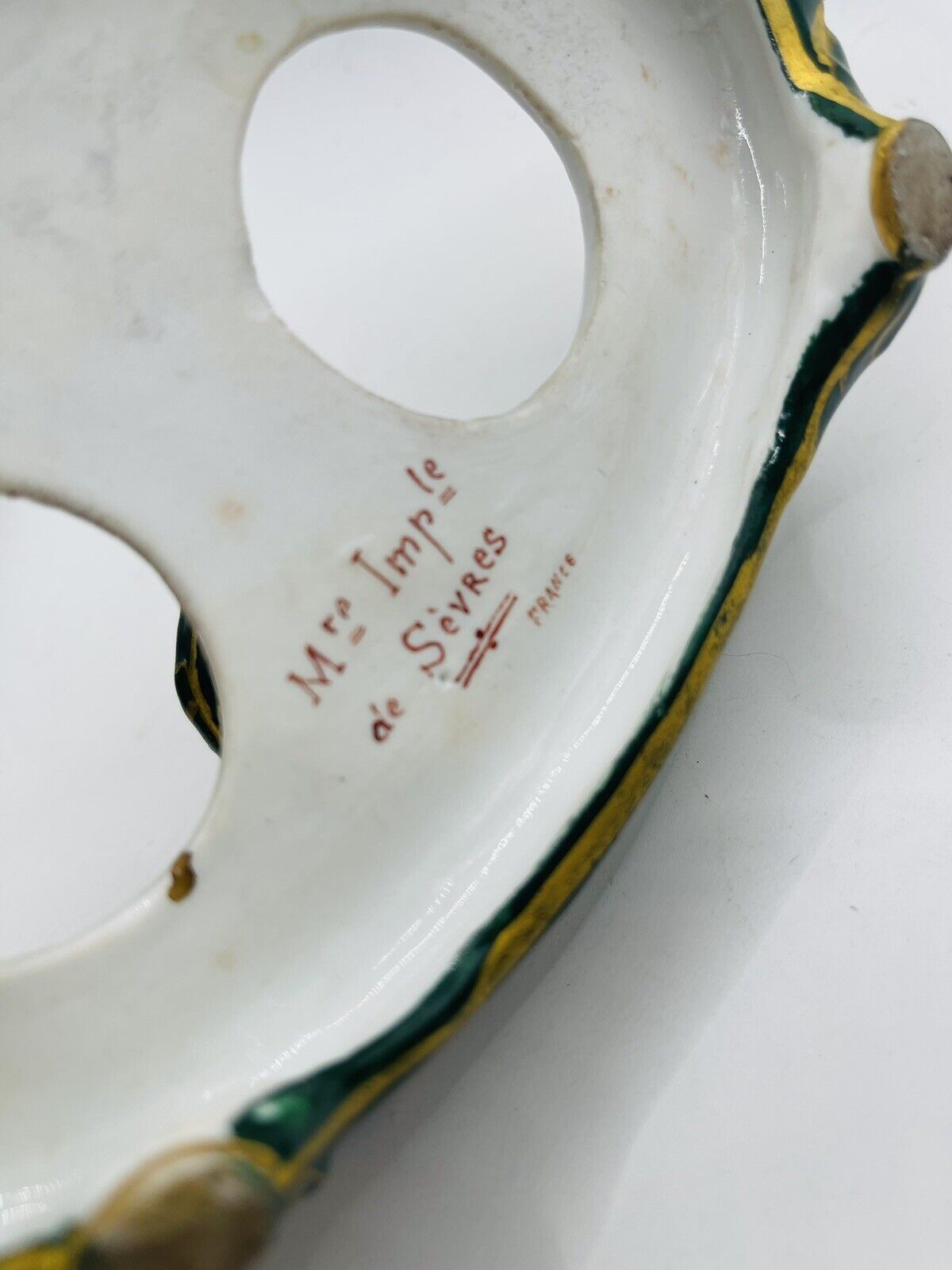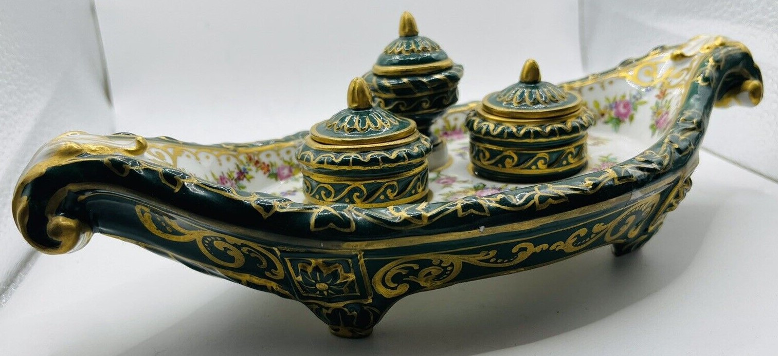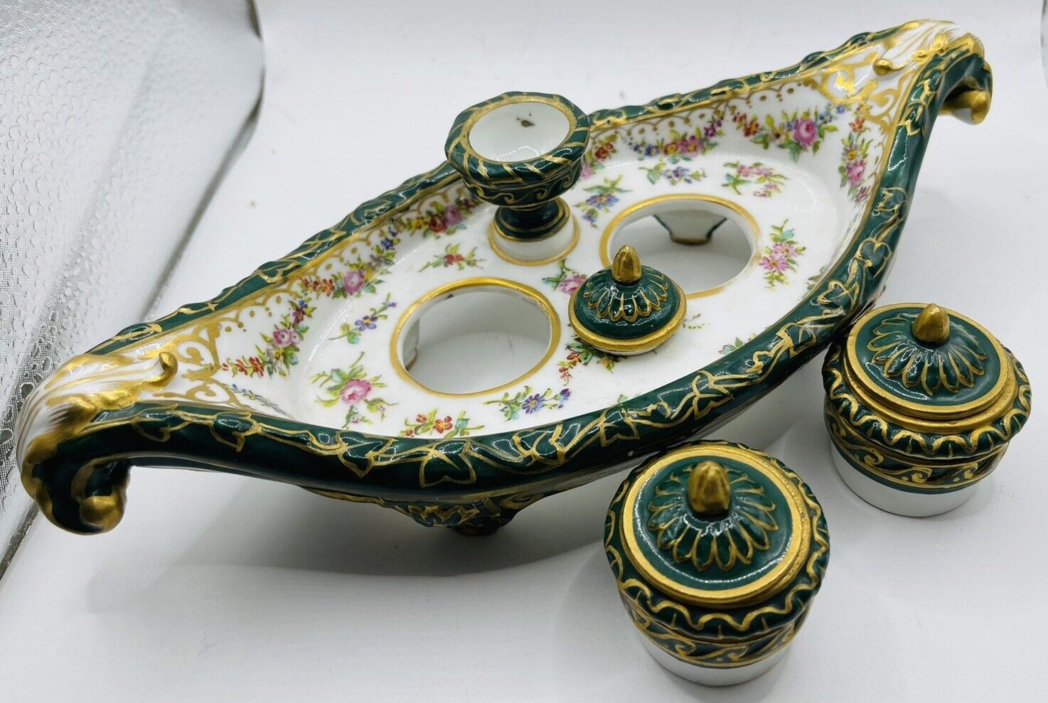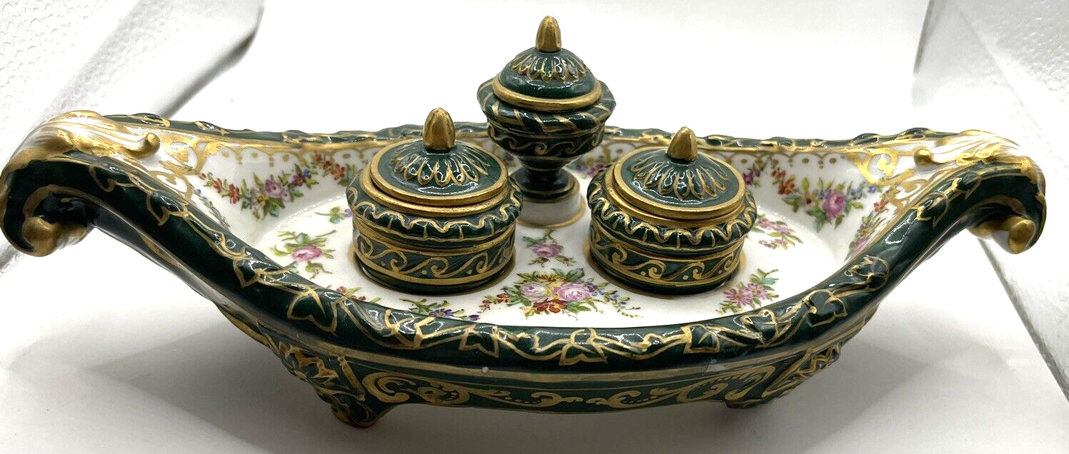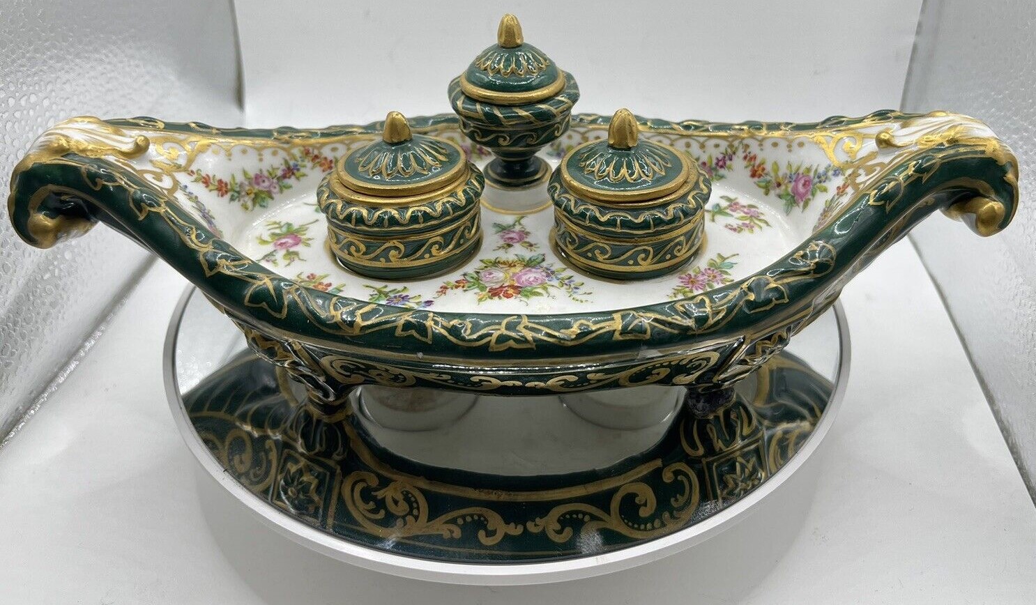 Hand painted white-base porcelain inkstand with scrolled handles, florals, green and gilt gold trim. It is marked “Mre Imple de Sevres France”.
