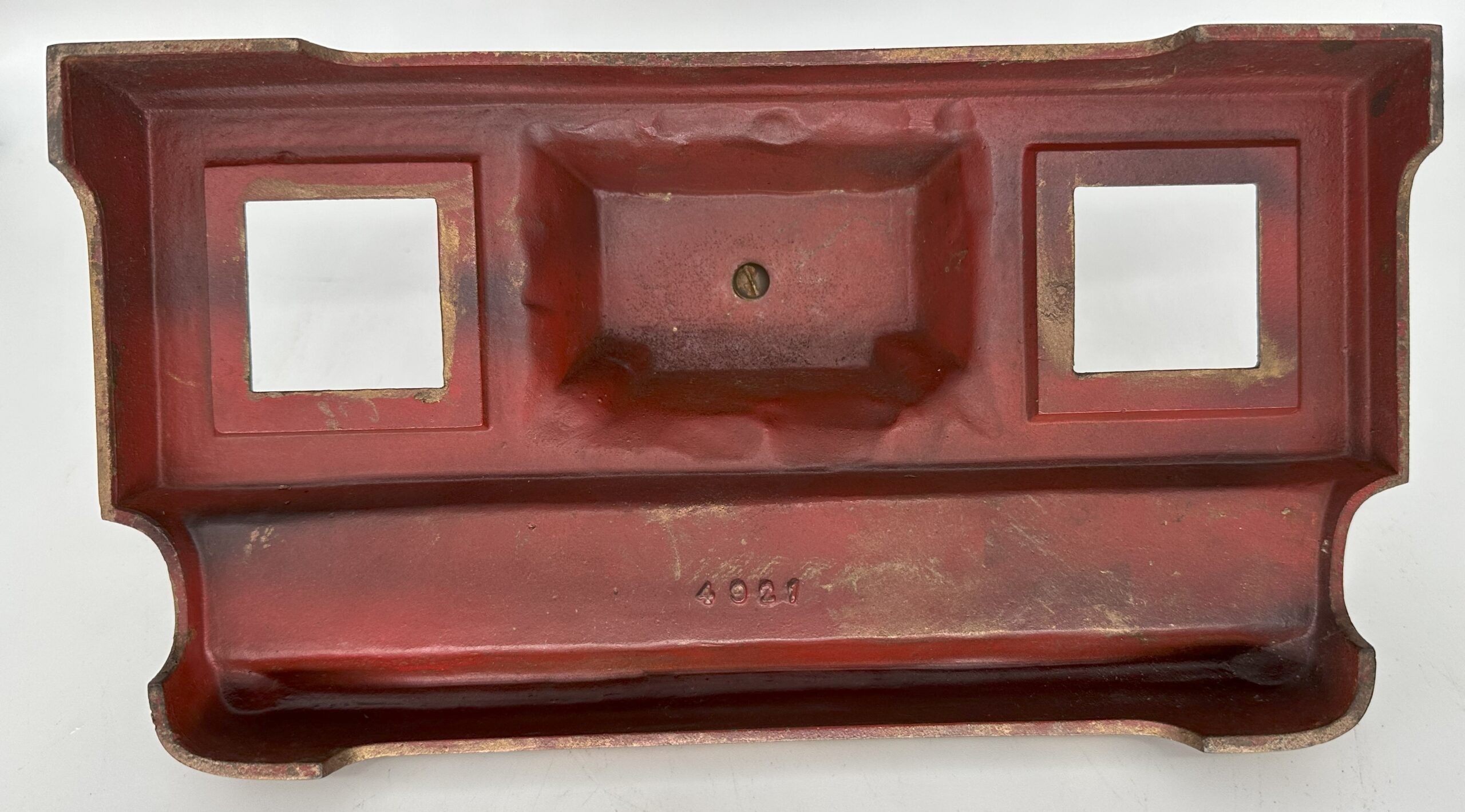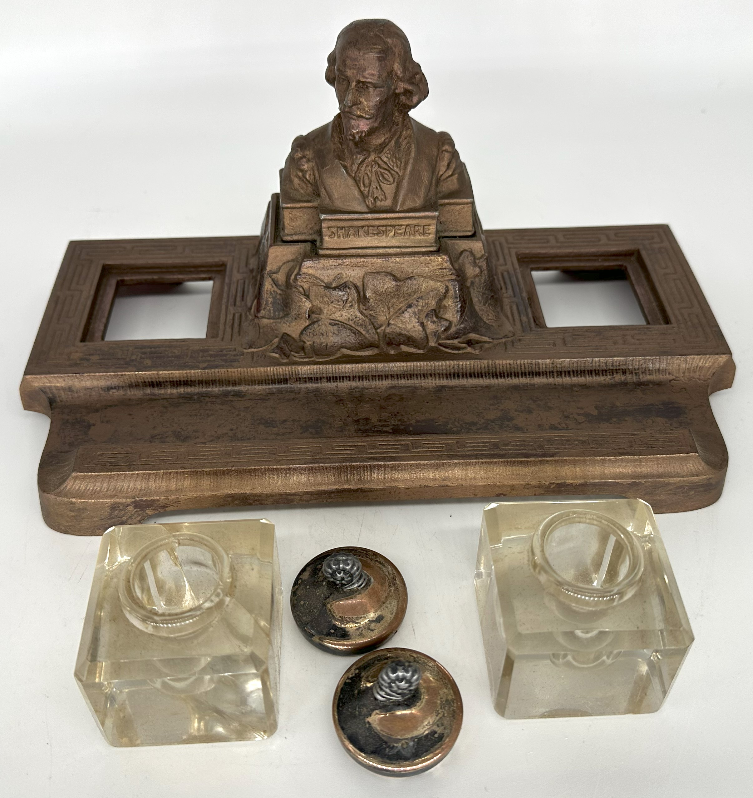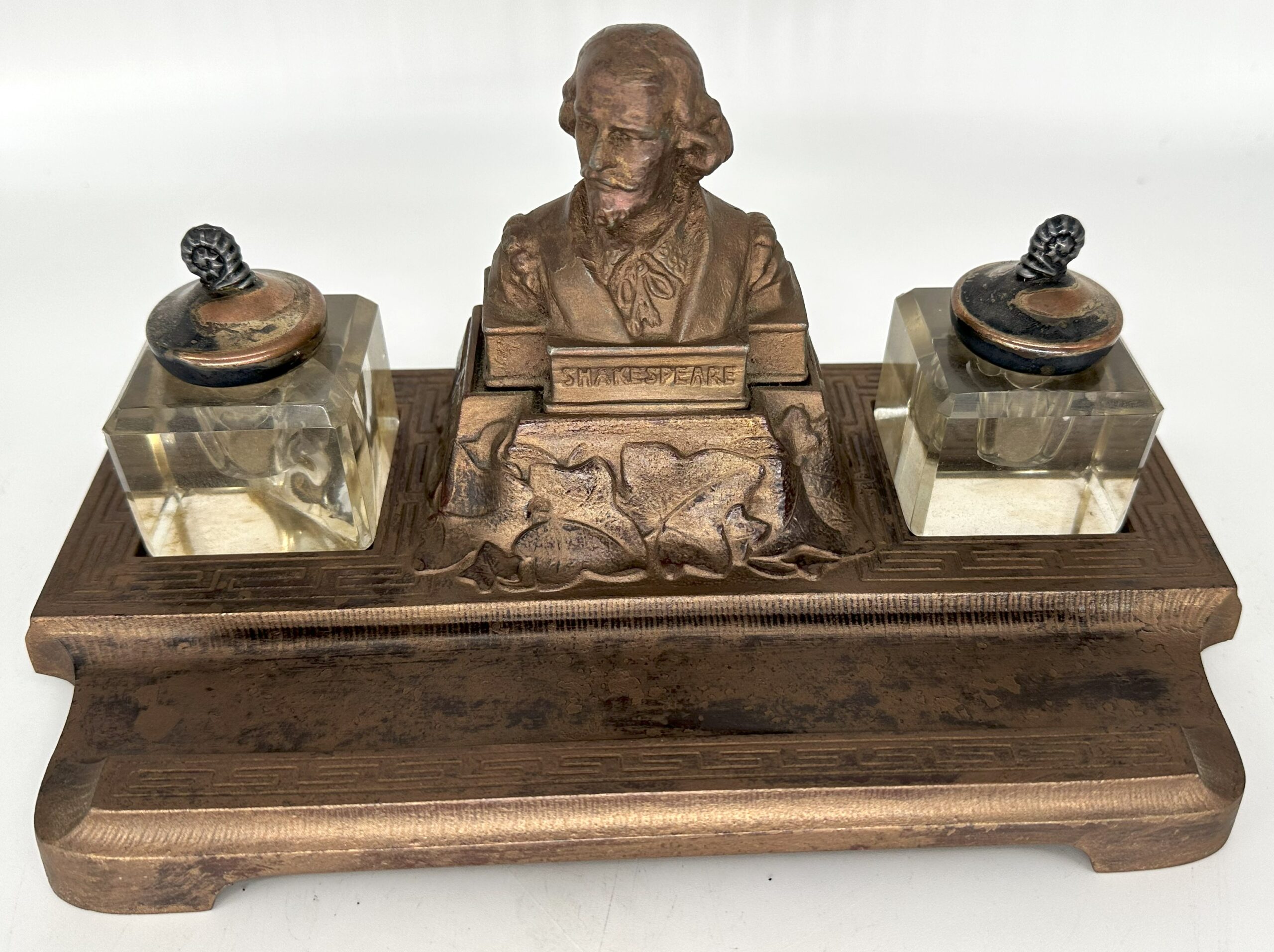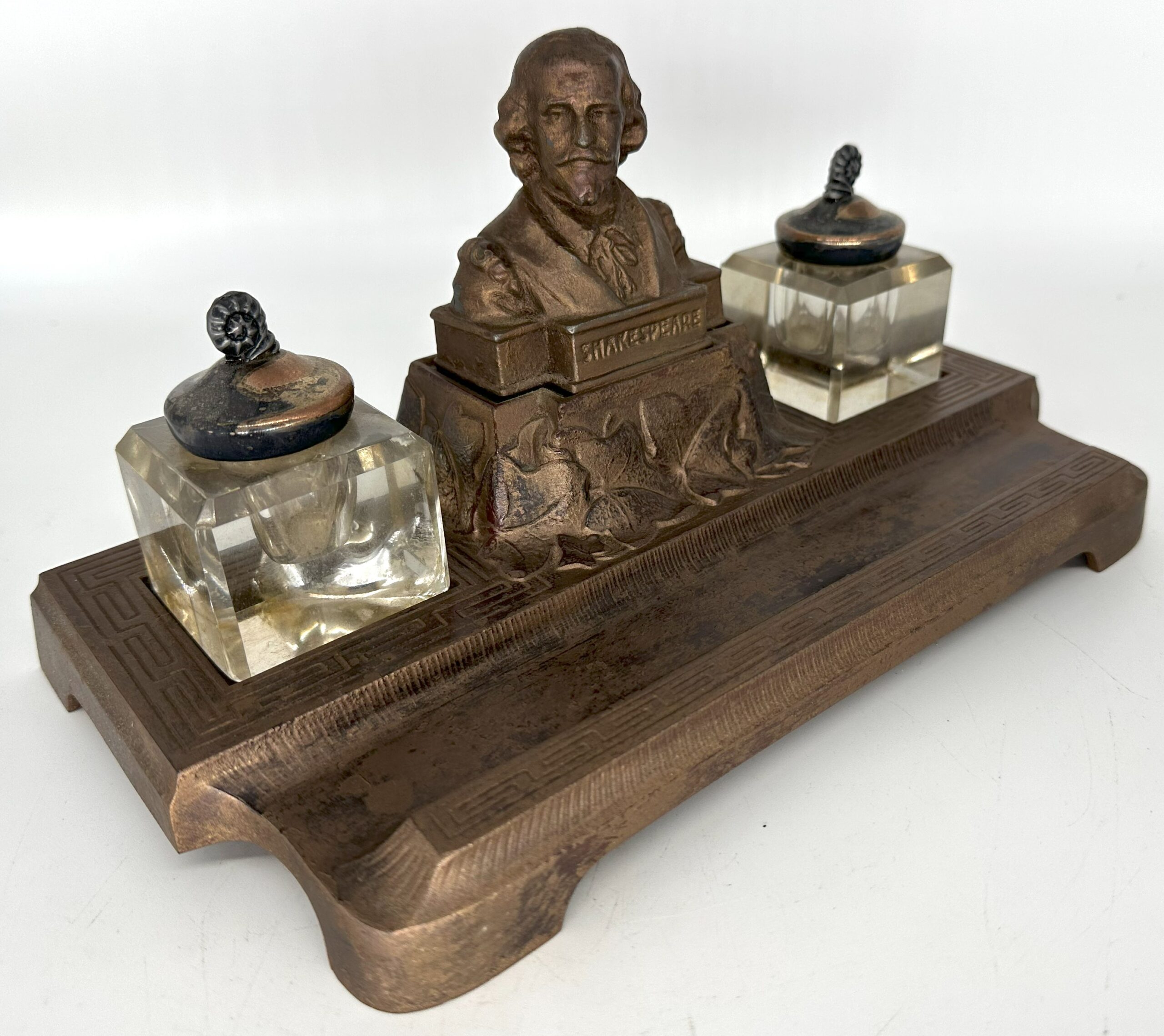 Shakespeare’s bust rests on an ivy-covered plinth. On either side is an inkwell with a separate lid. In the front is a pen tray. The number 4921 is stamped on the underside.