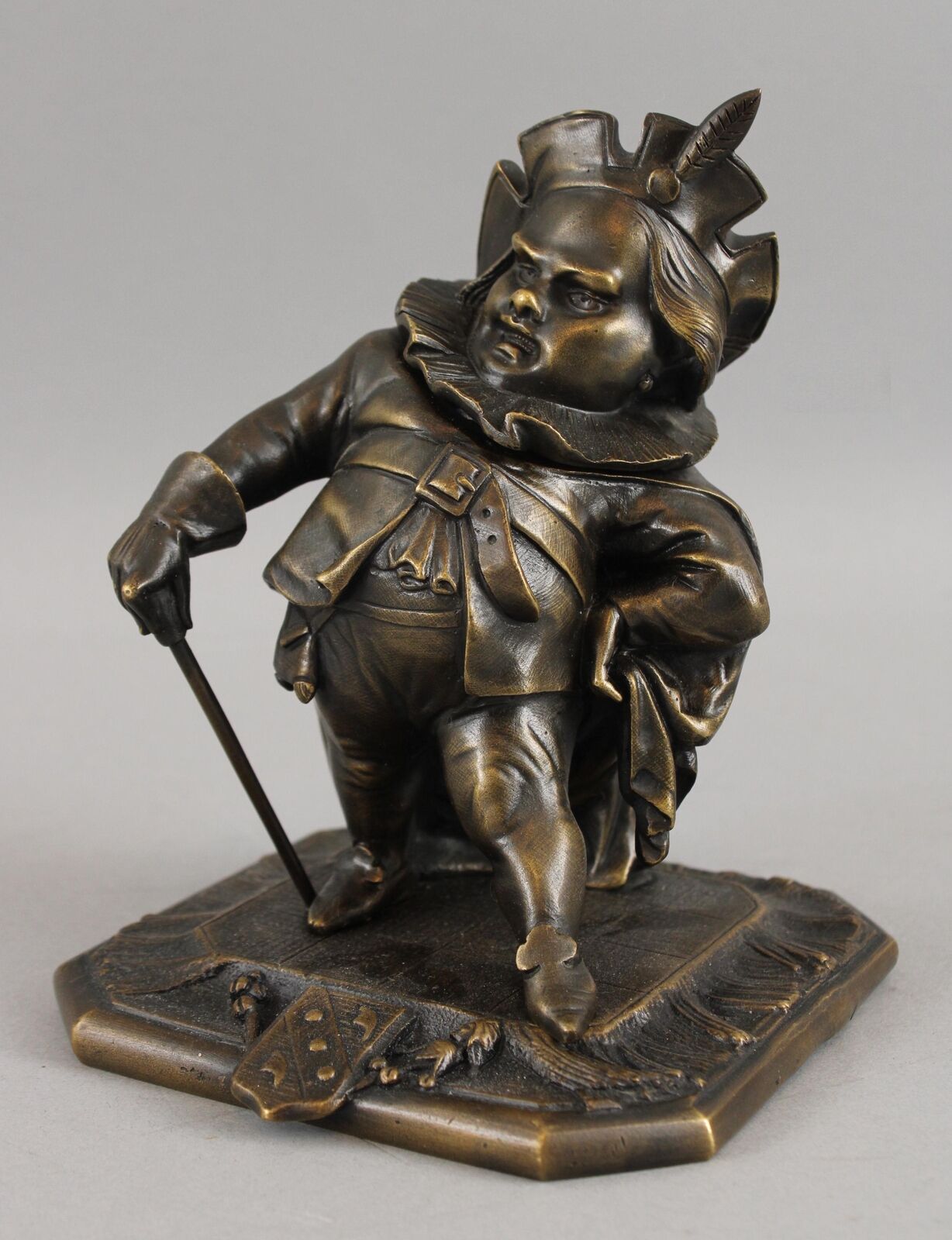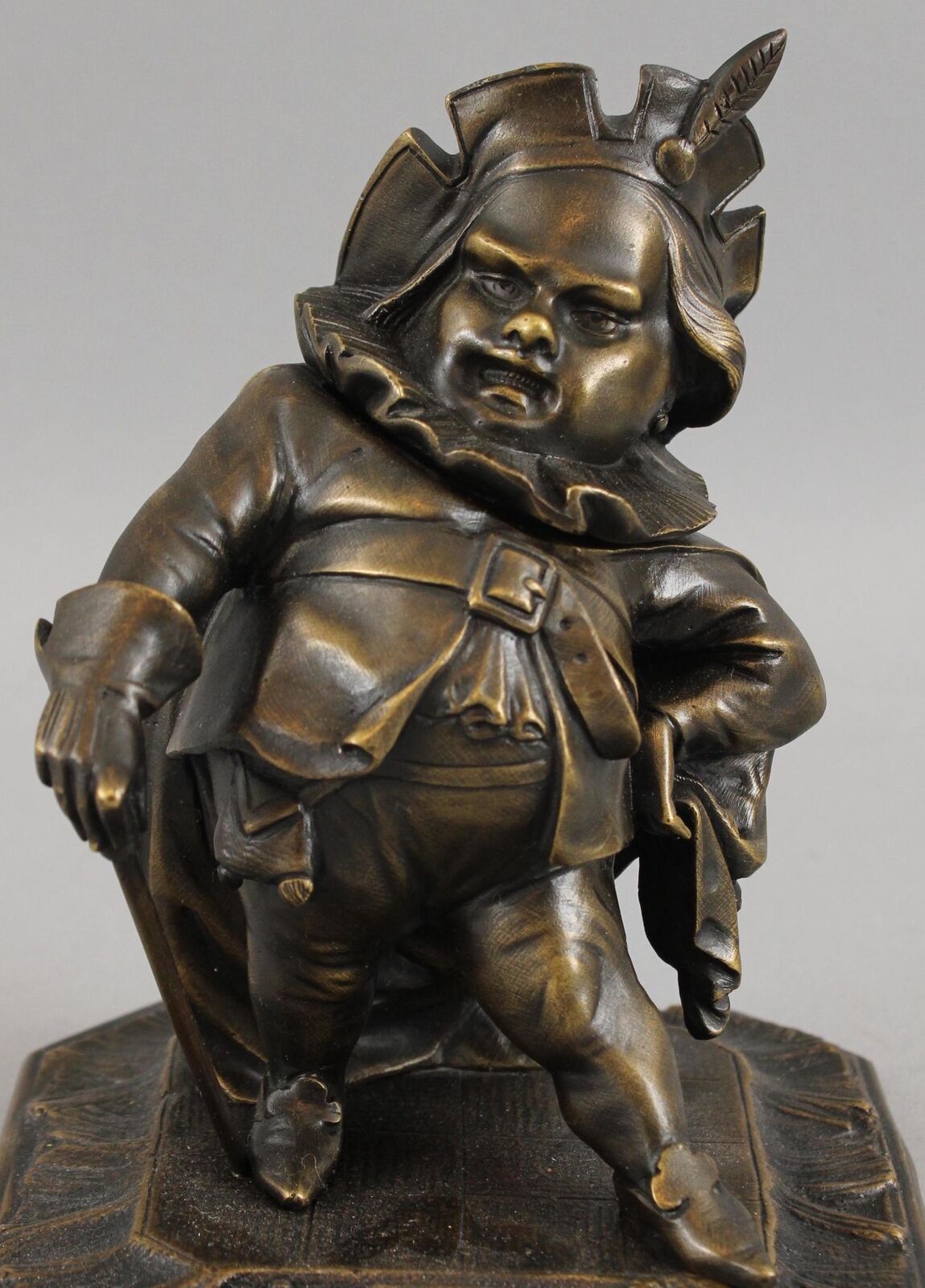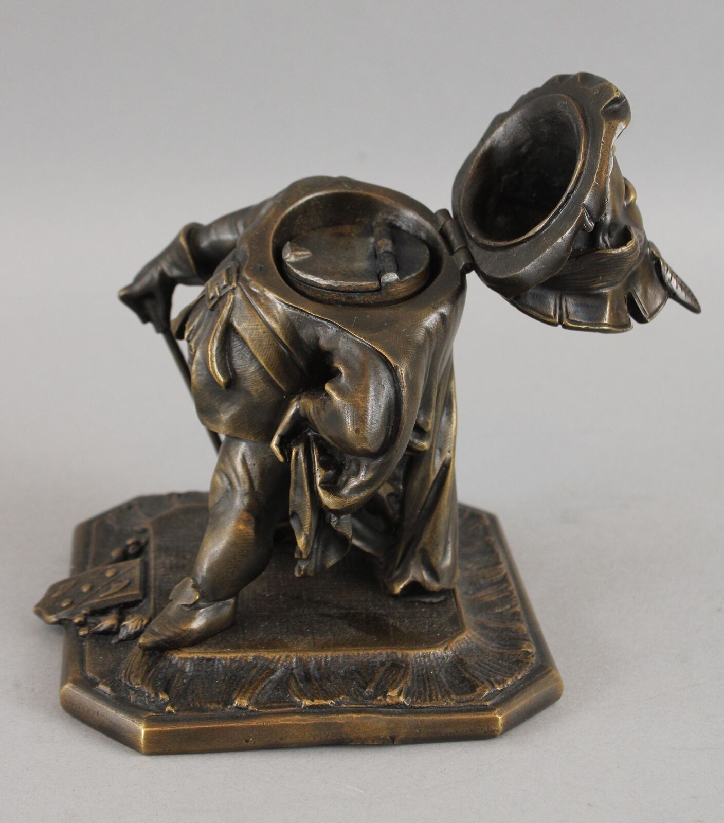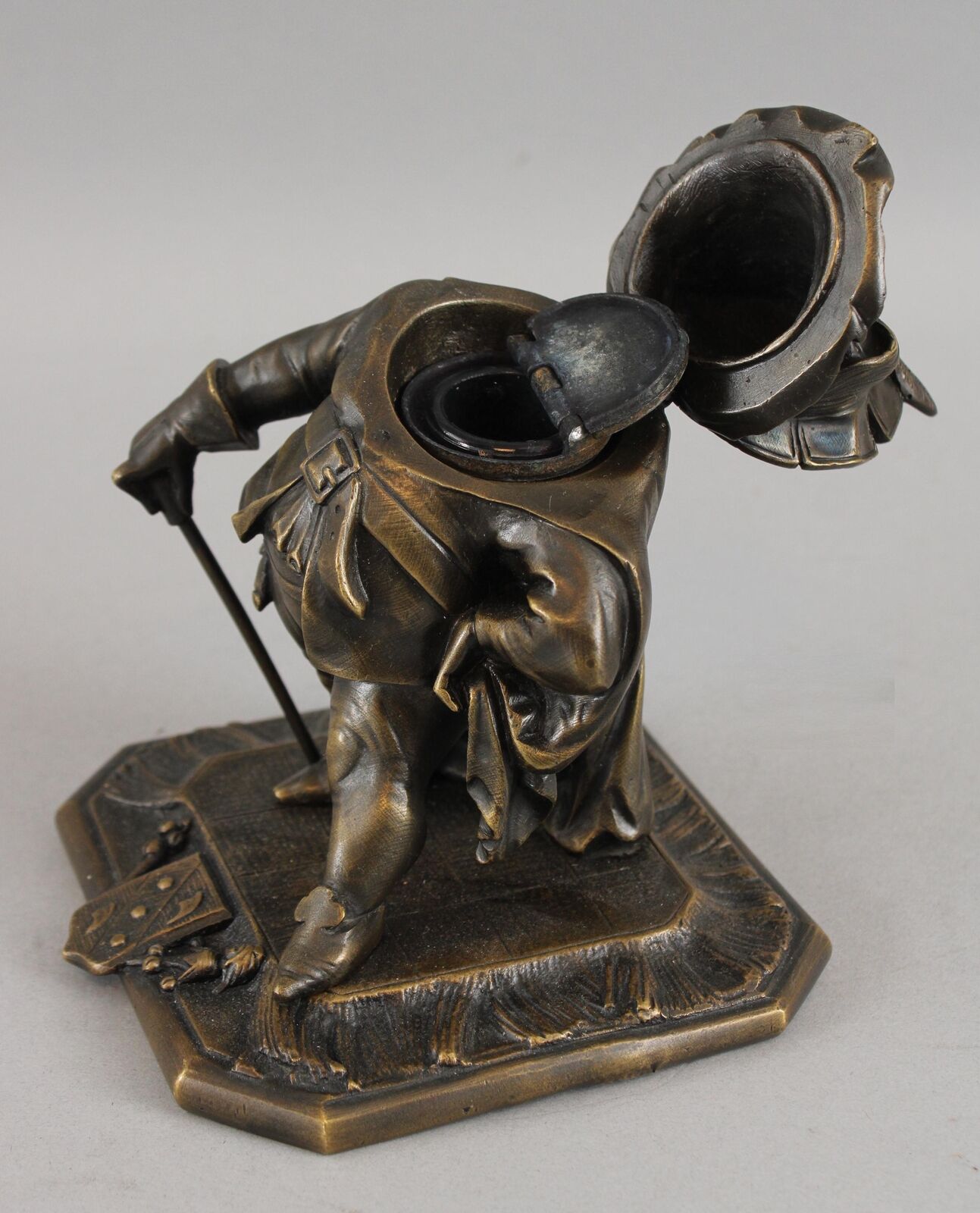 Featured in three plays as primarily a comic figure, Falstaff, a fat, vain, and boastful knight, spends most of his time drinking with petty criminals, living on stolen or borrowed money. Now Falstaff is immortalized in the form of a bronze inkwell. His head is hinged at the ruffled collar. Inside is a removable bronze inkwell with a hinged lid and glass font. The base is marked “GD” and numbered “1930”.