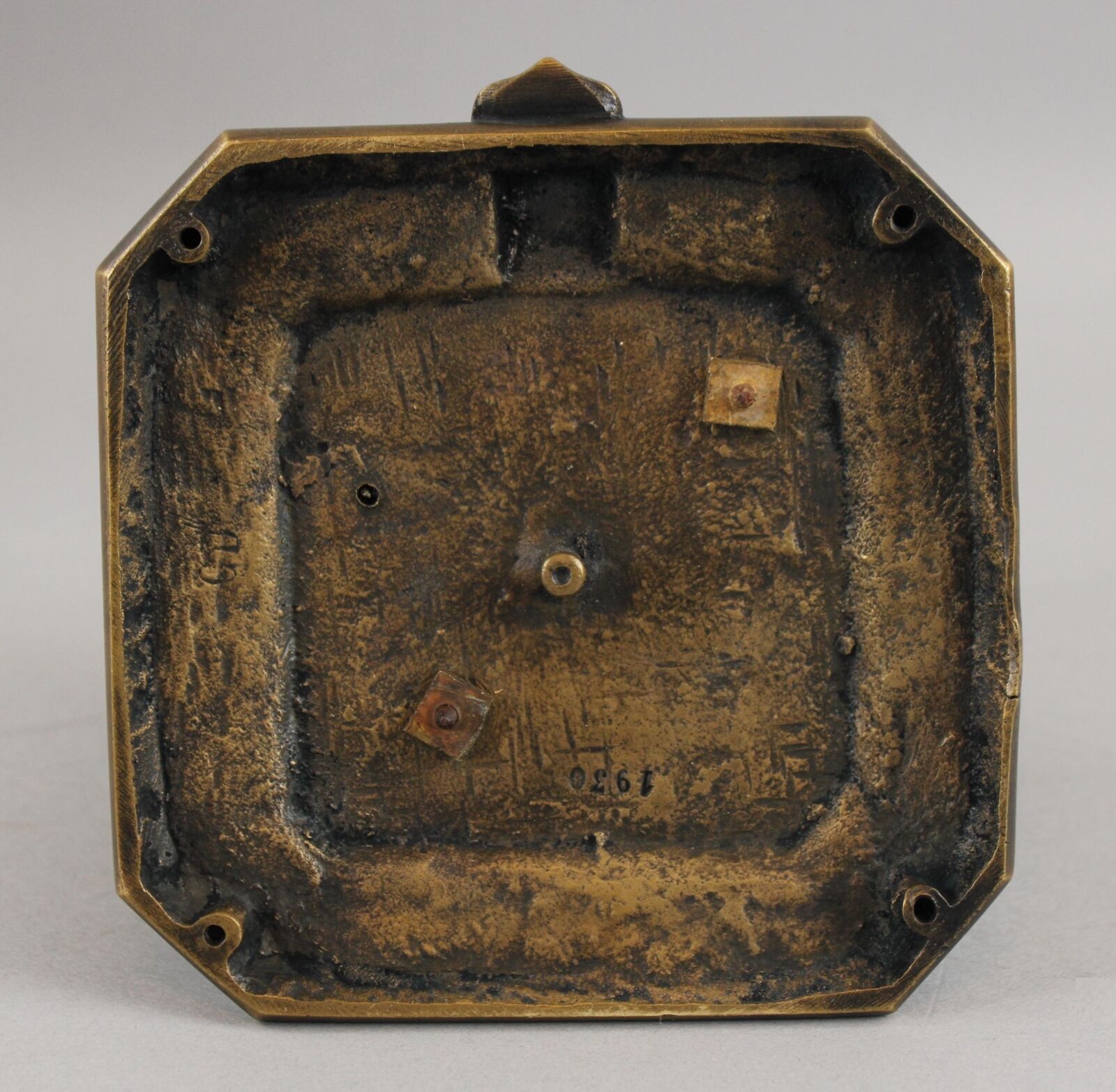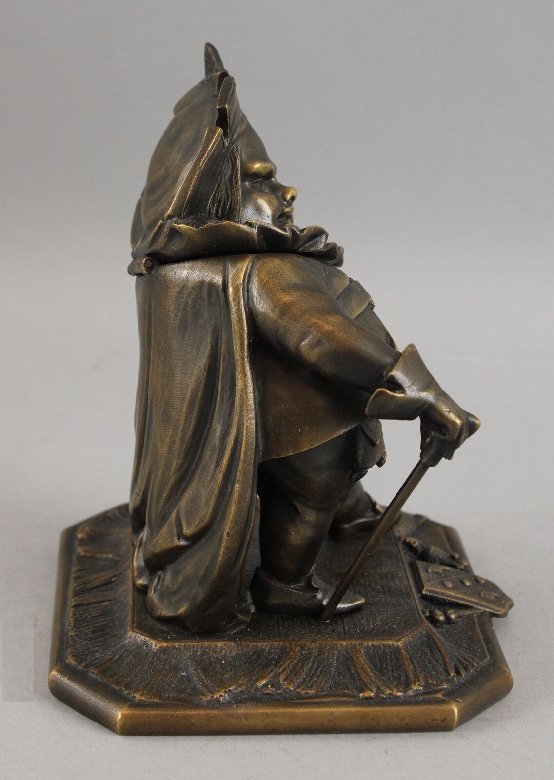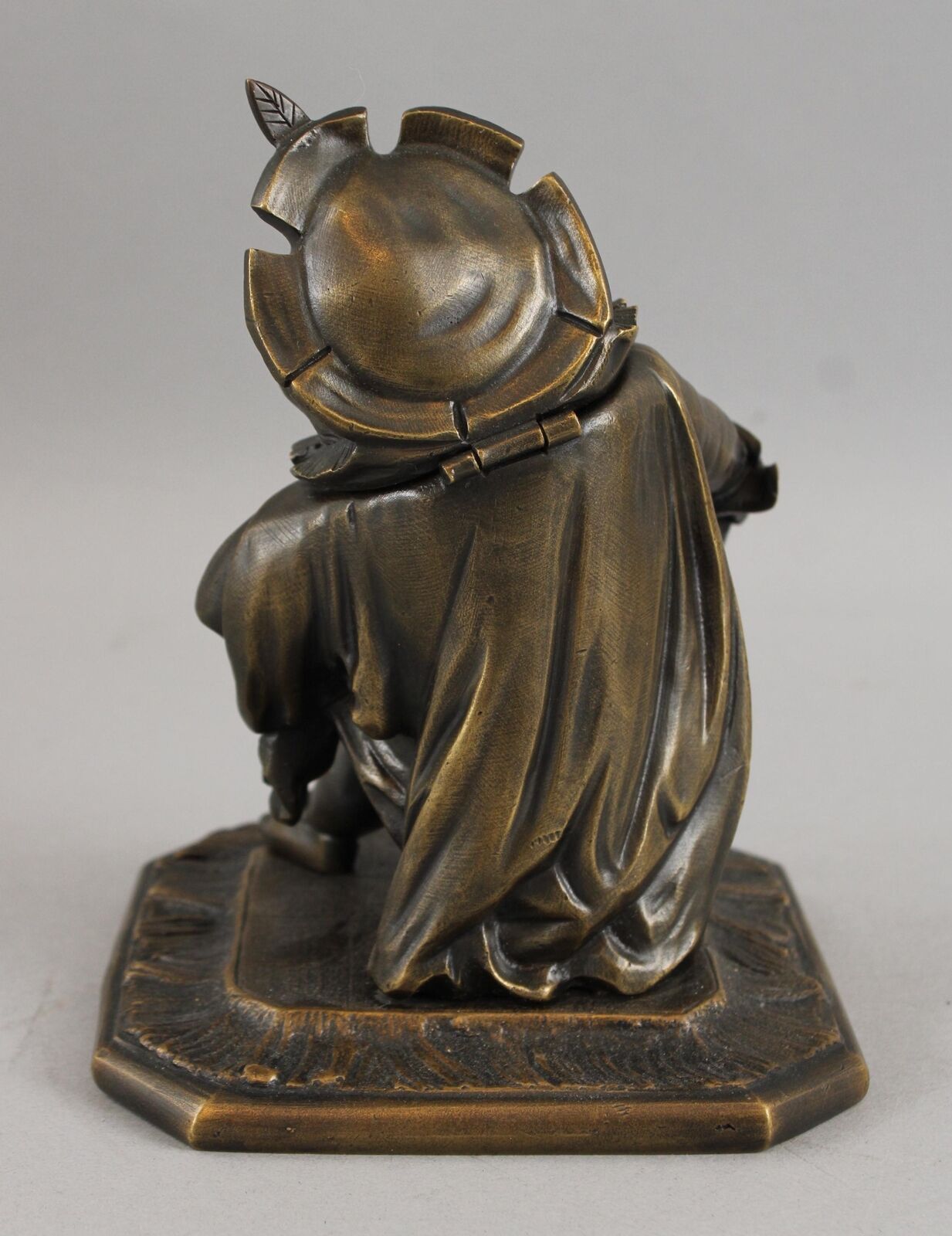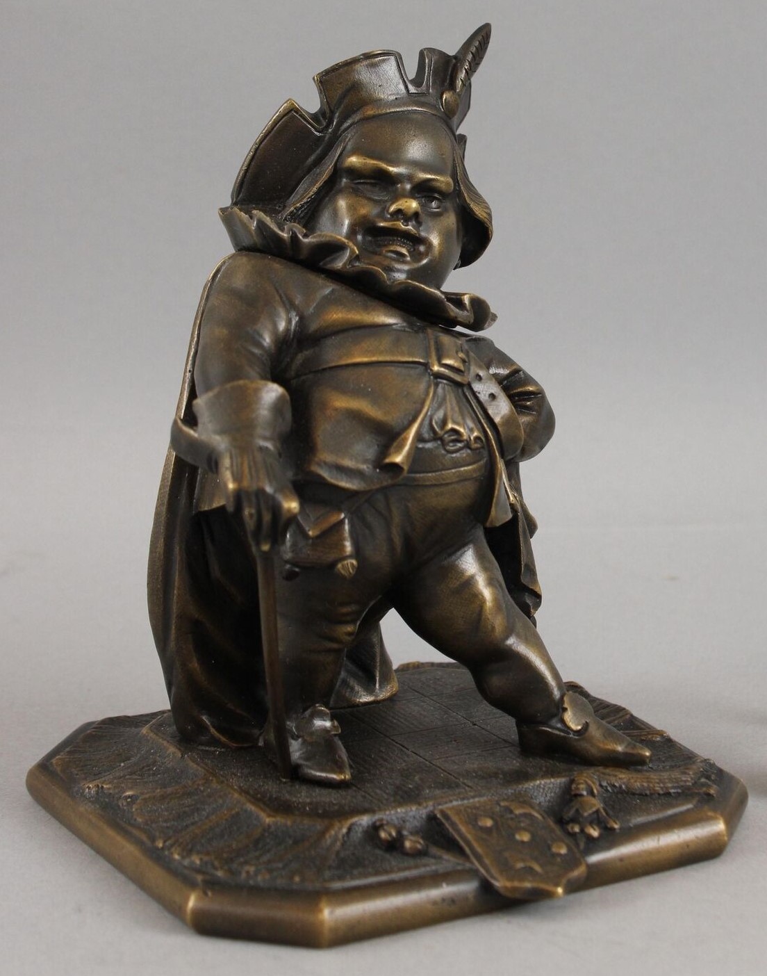 Featured in three plays as primarily a comic figure, Falstaff, a fat, vain, and boastful knight, spends most of his time drinking with petty criminals, living on stolen or borrowed money. Now Falstaff is immortalized in the form of a bronze inkwell. His head is hinged at the ruffled collar. Inside is a removable bronze inkwell with a hinged lid and glass font. The base is marked “GD” and numbered “1930”.