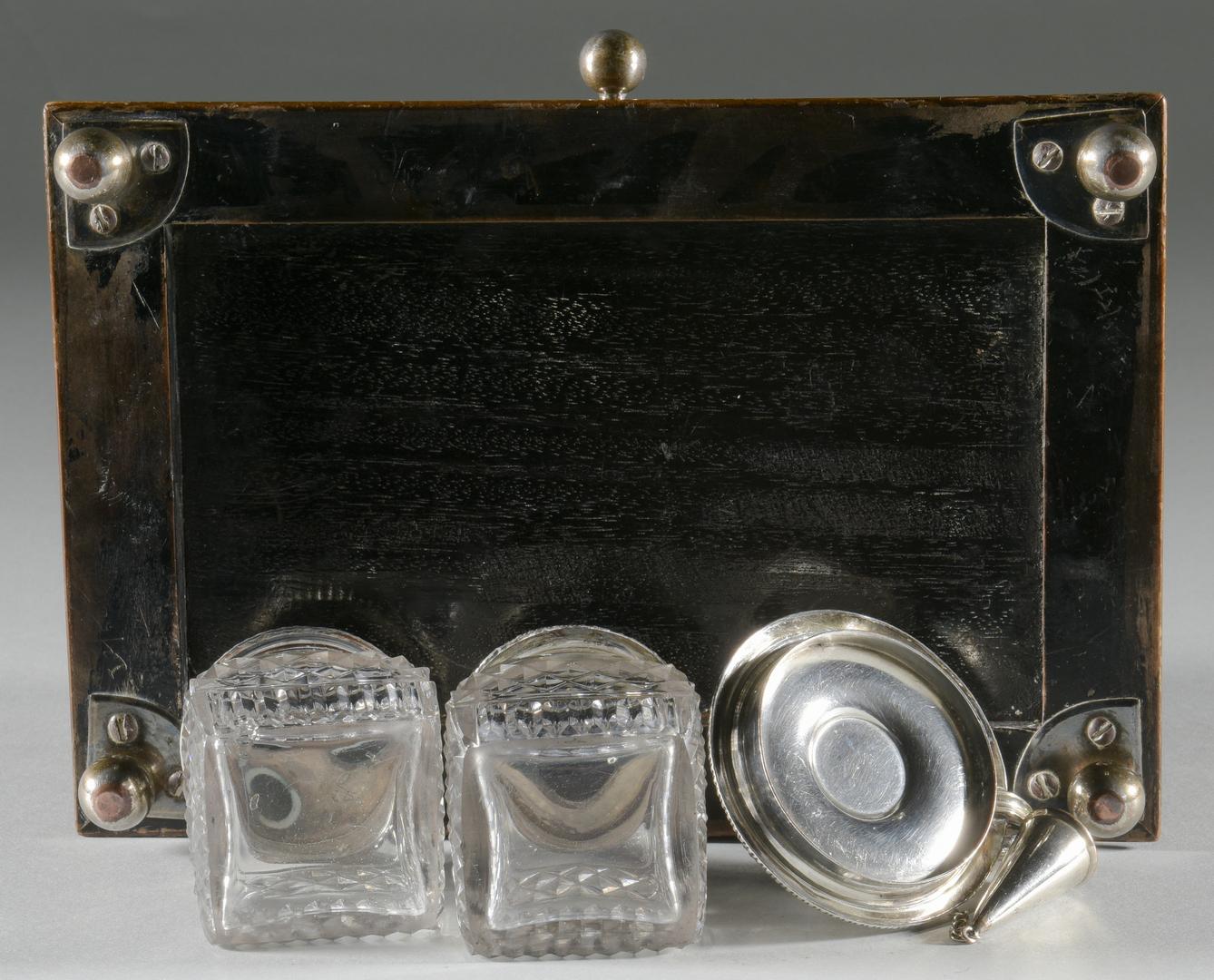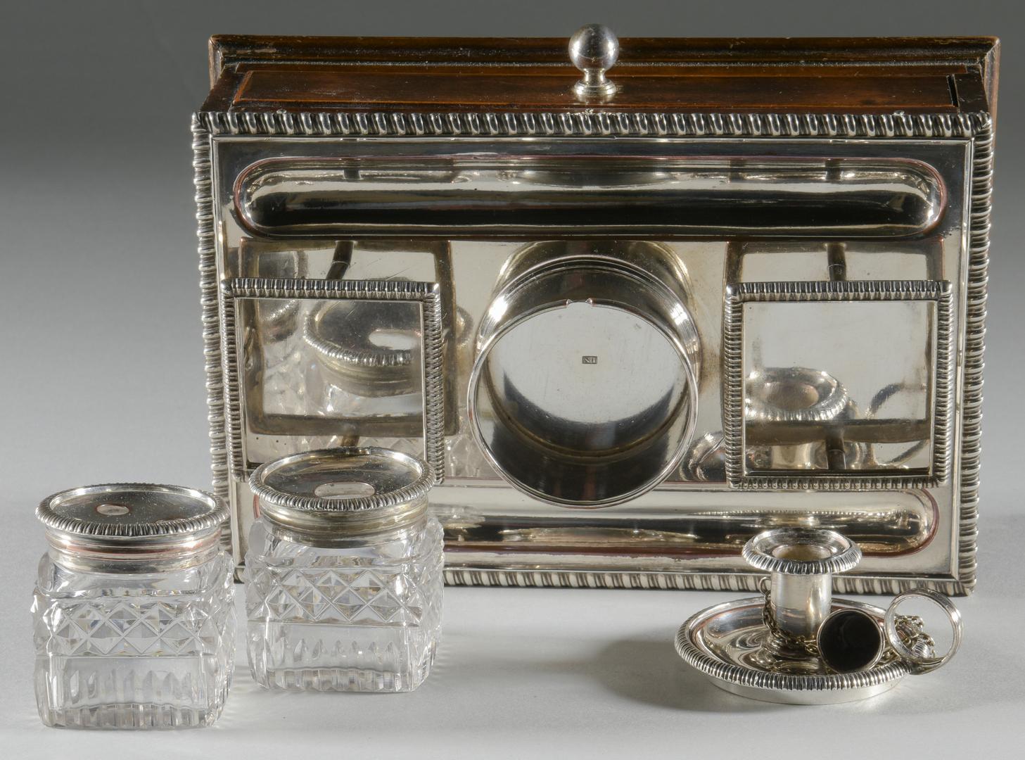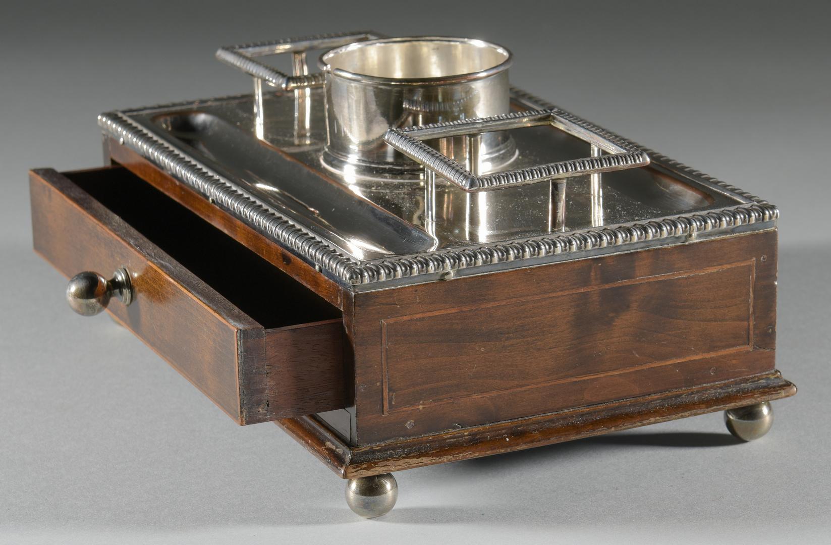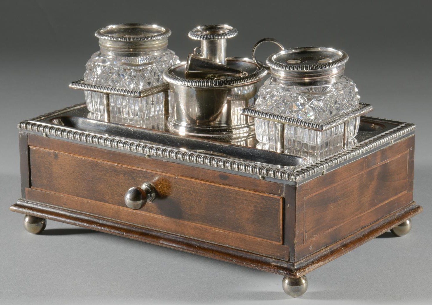 Old Sheffield-mounted inlaid mahogany writing box with blind dovetailed drawer and silver knob, resting on silver bun feet. On top are an inkstand with a square cut glass inkwell and sander, and a round wafer pot topped with a taper candle stick holder and snuffer between two pen grooves. All silver elements are accented by gadrooned edges. The interior of the wafer pot is stamped I N, in a serrated rectangle.