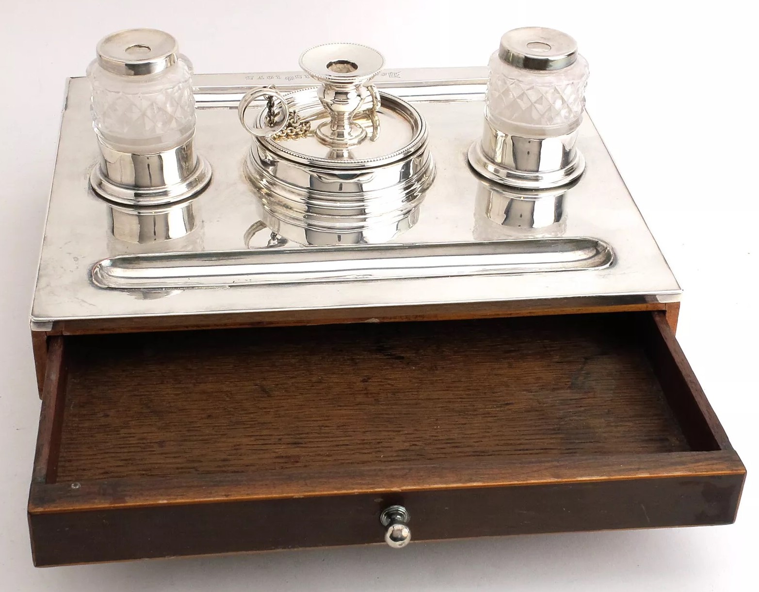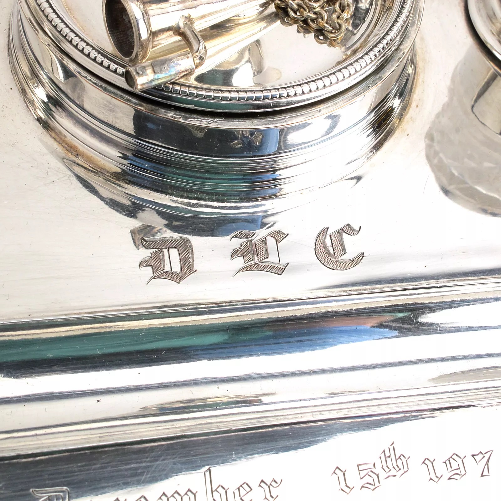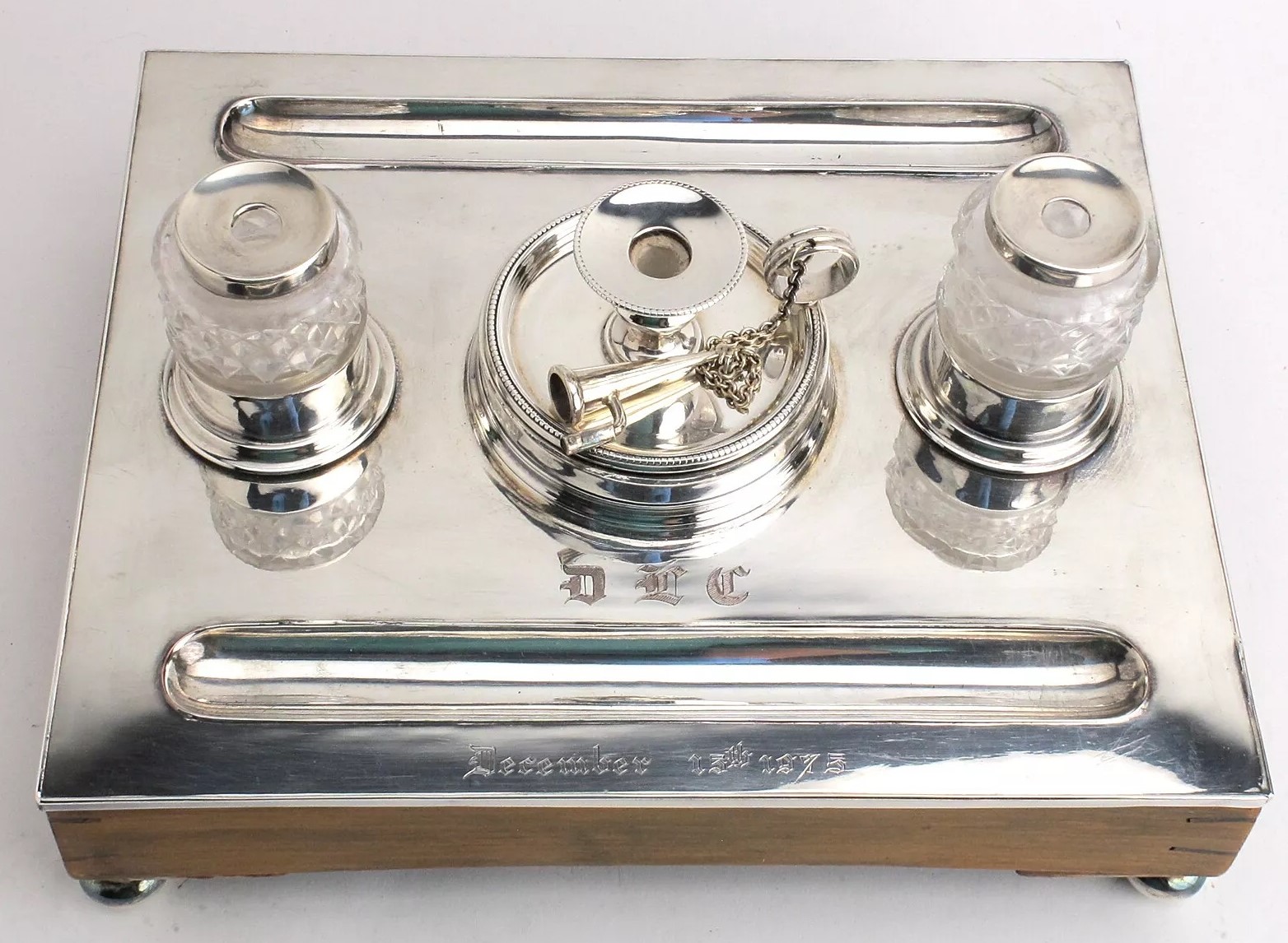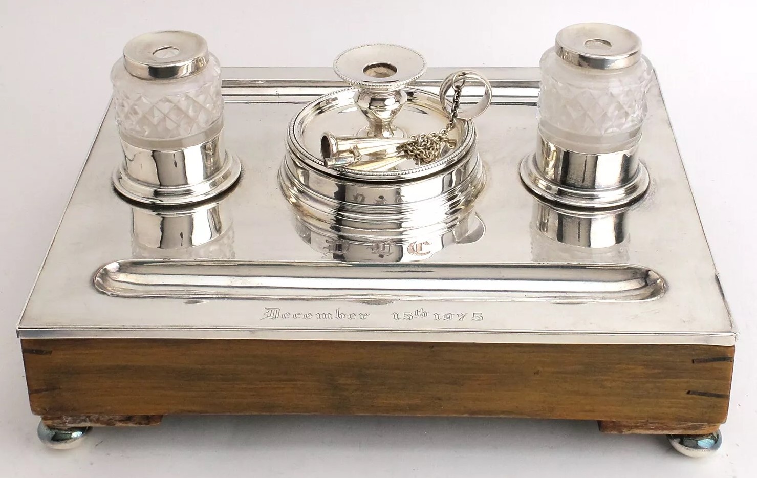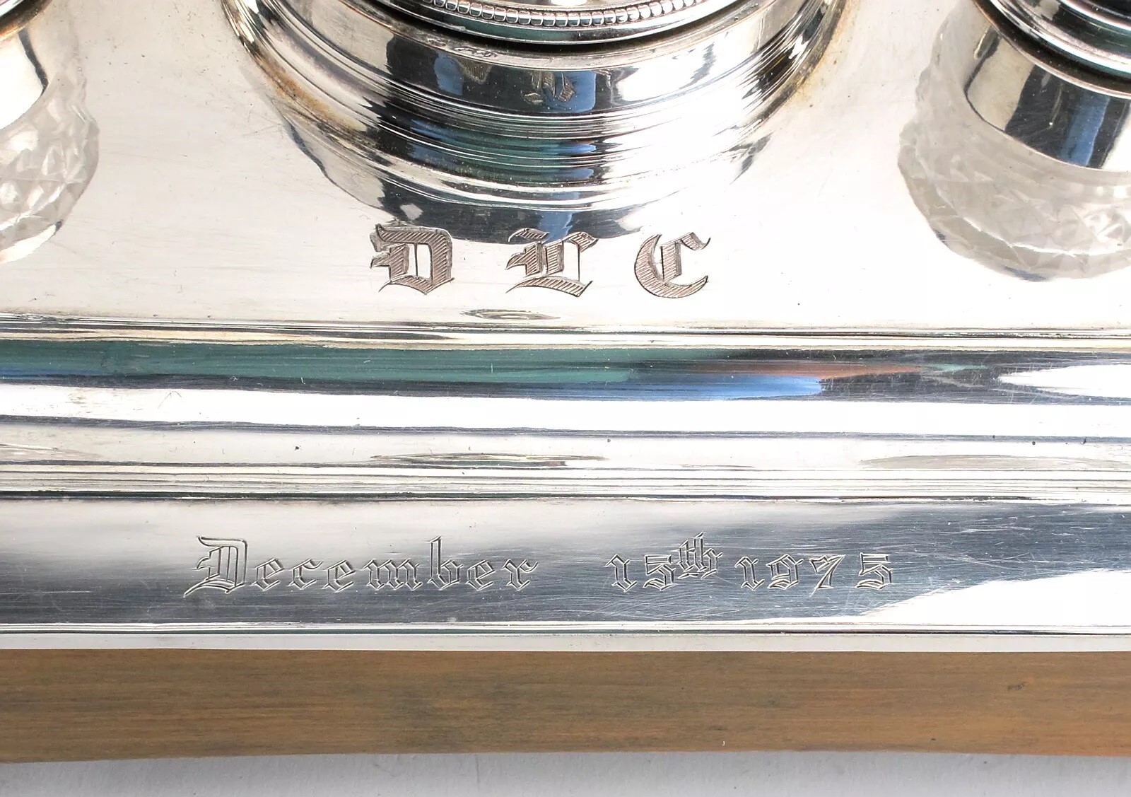 This Sheffield silverplated inkstand is mounted on a polished mahogany base. The inkstand features two cut glass inkwells with silverplated lids, positioned on either side of a central chamberstick. The chamberstick includes an attached snuffer, which was used to extinguish candles. there is a pen channel on both sides suggesting this may have been used on a partner’s desk. Below the silverplate and inkwells, there is a pull-out drawer with a round knob. The entire piece is supported by four rounded bun feet. The monogramming and the date of 1975 suggest that this inkstand was personalized as a gift, even though the inkstand itself dates to around 1900.