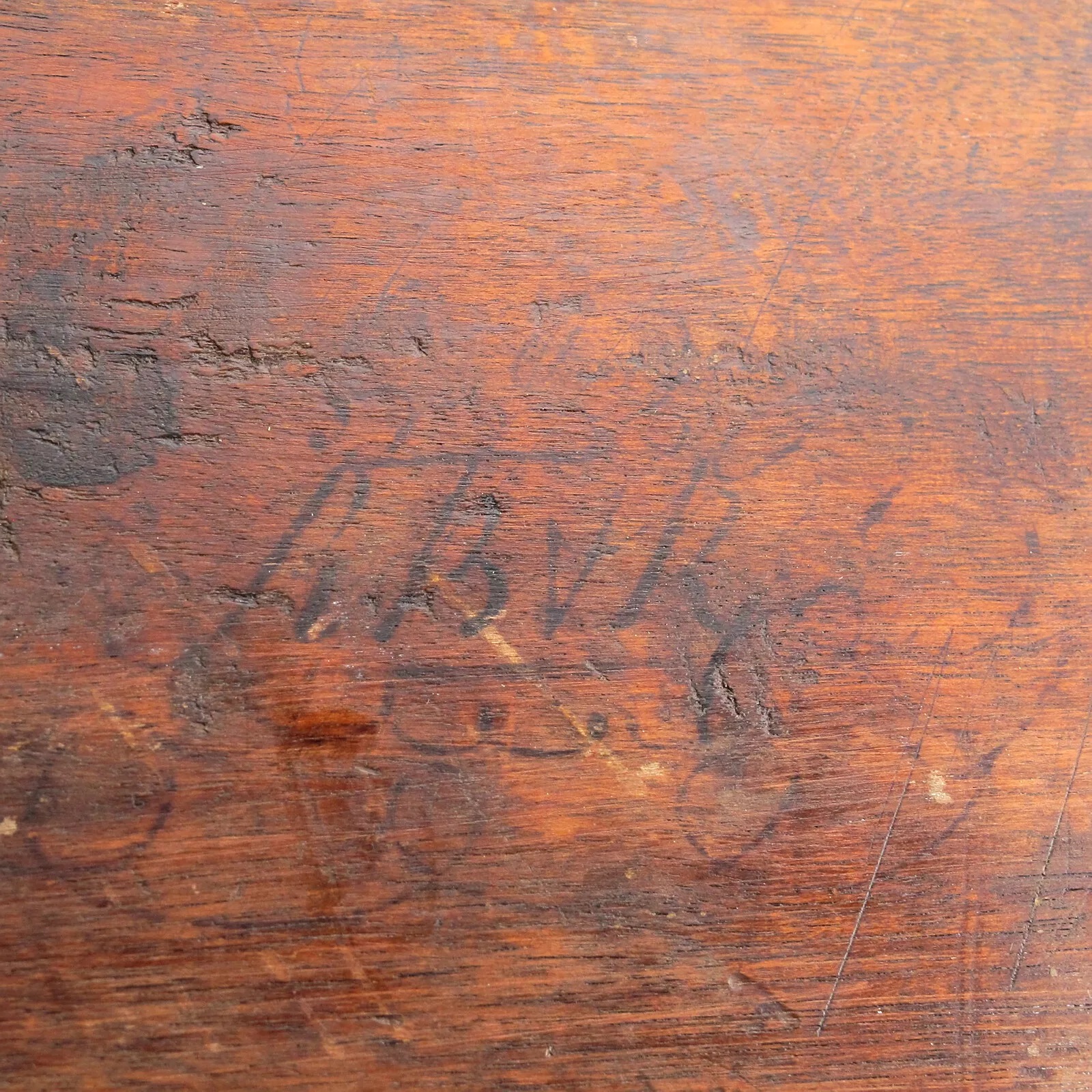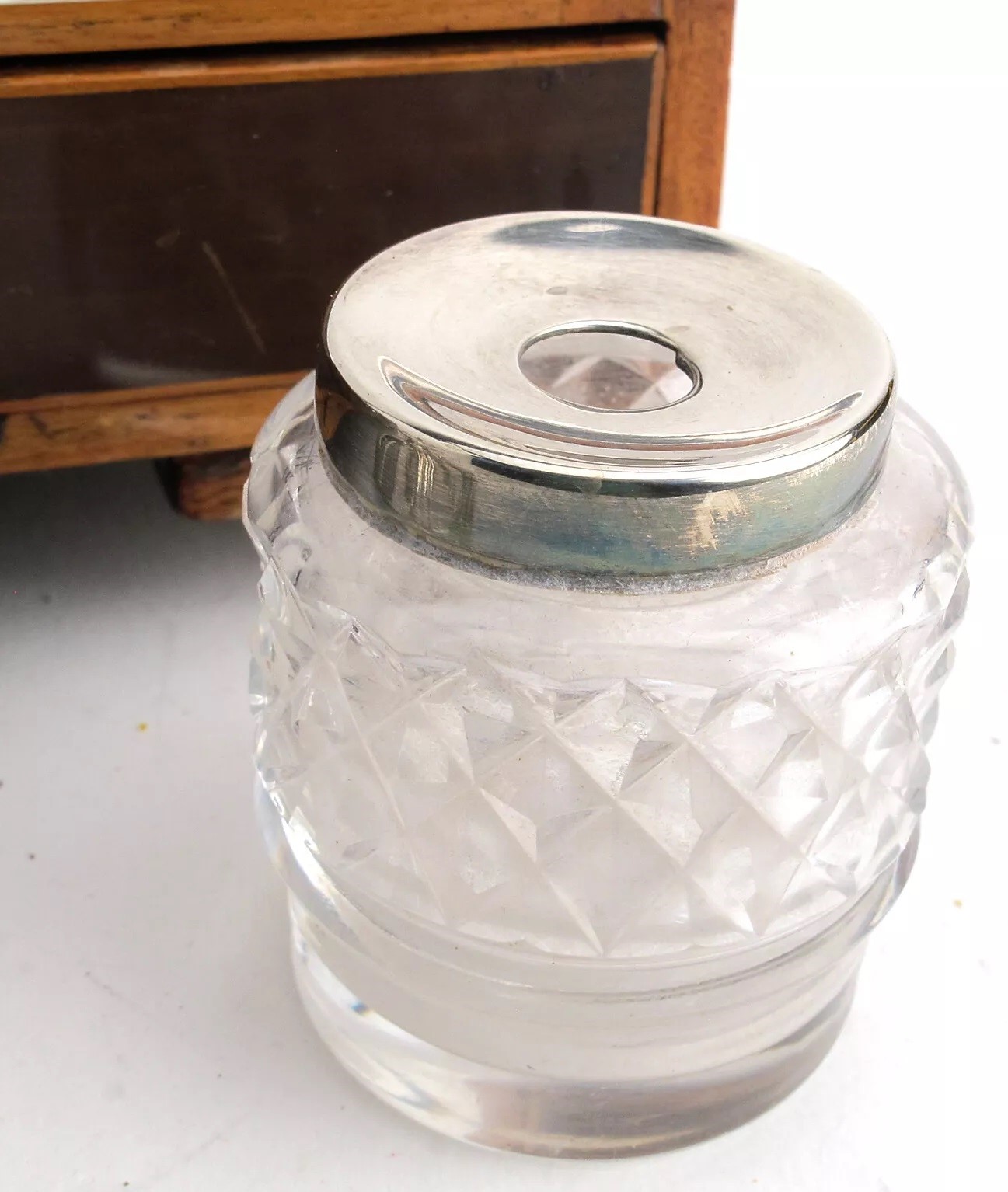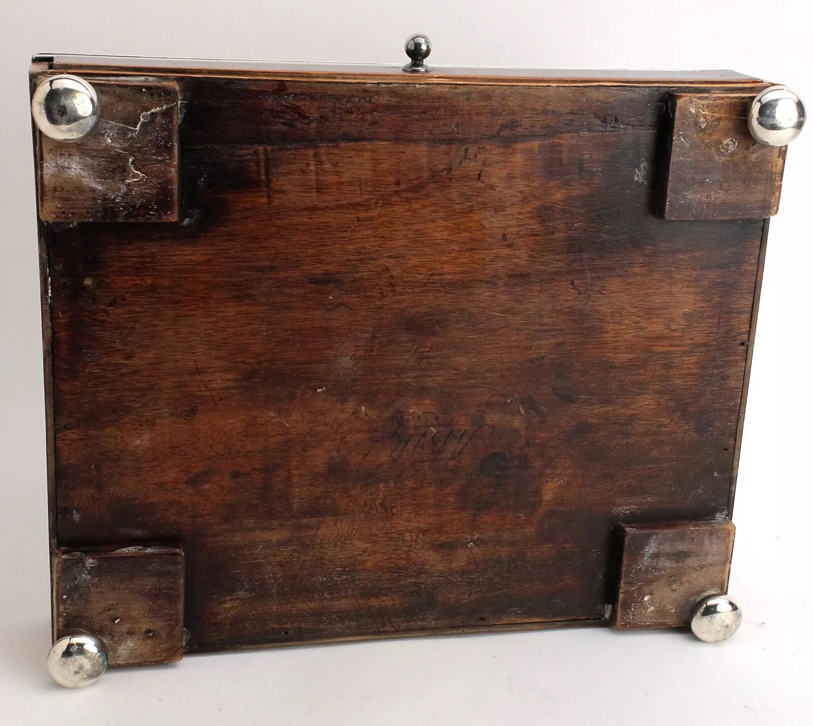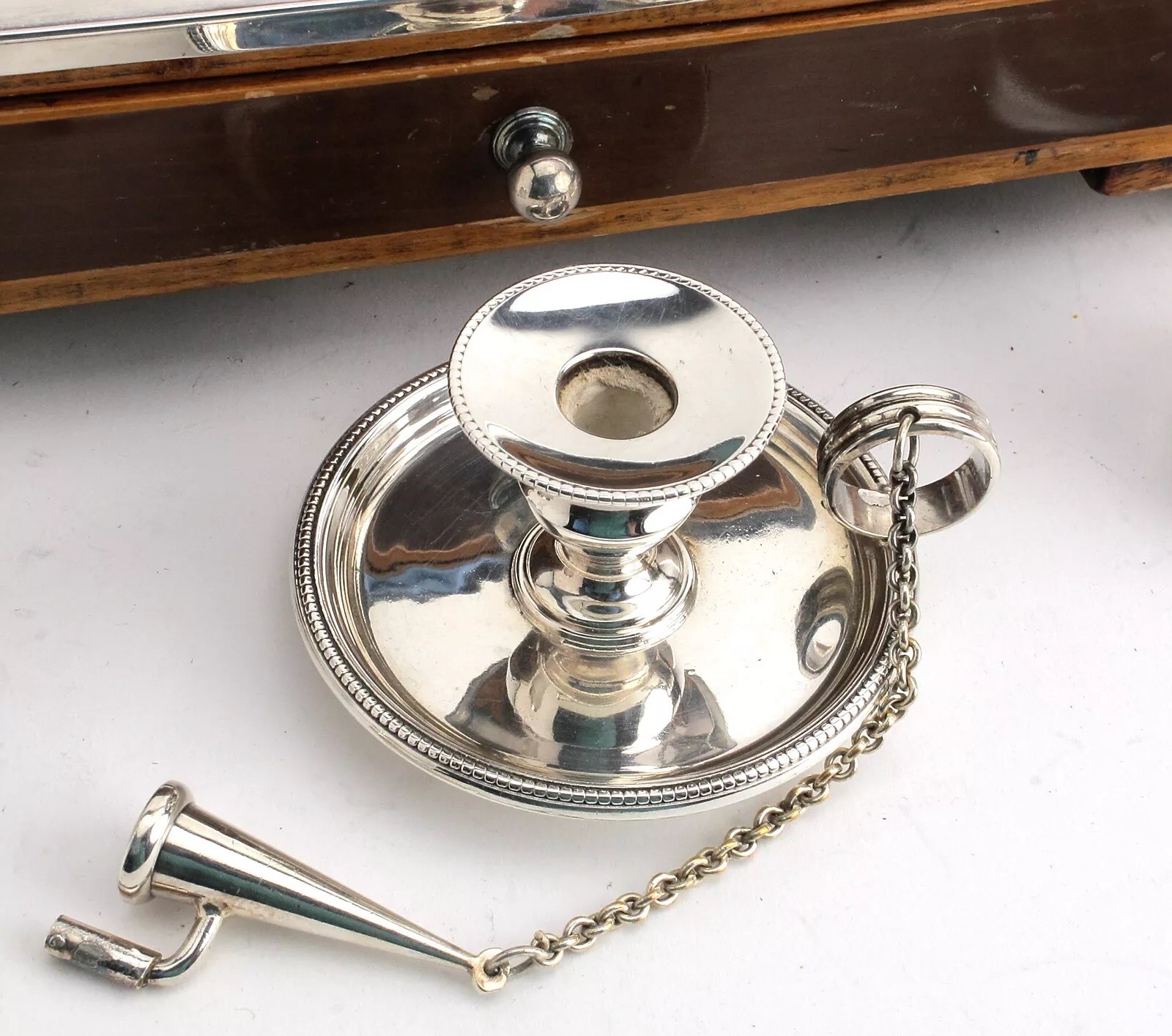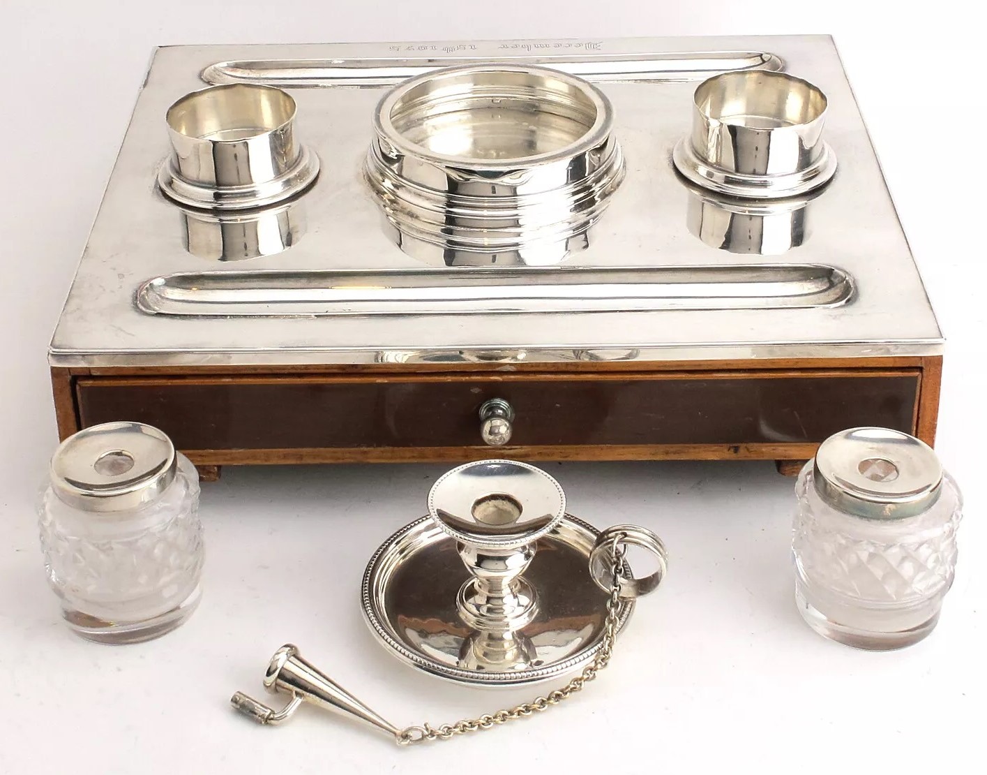 This Sheffield silverplated inkstand is mounted on a polished mahogany base. The inkstand features two cut glass inkwells with silverplated lids, positioned on either side of a central chamberstick. The chamberstick includes an attached snuffer, which was used to extinguish candles. there is a pen channel on both sides suggesting this may have been used on a partner’s desk. Below the silverplate and inkwells, there is a pull-out drawer with a round knob. The entire piece is supported by four rounded bun feet. The monogramming and the date of 1975 suggest that this inkstand was personalized as a gift, even though the inkstand itself dates to around 1900.