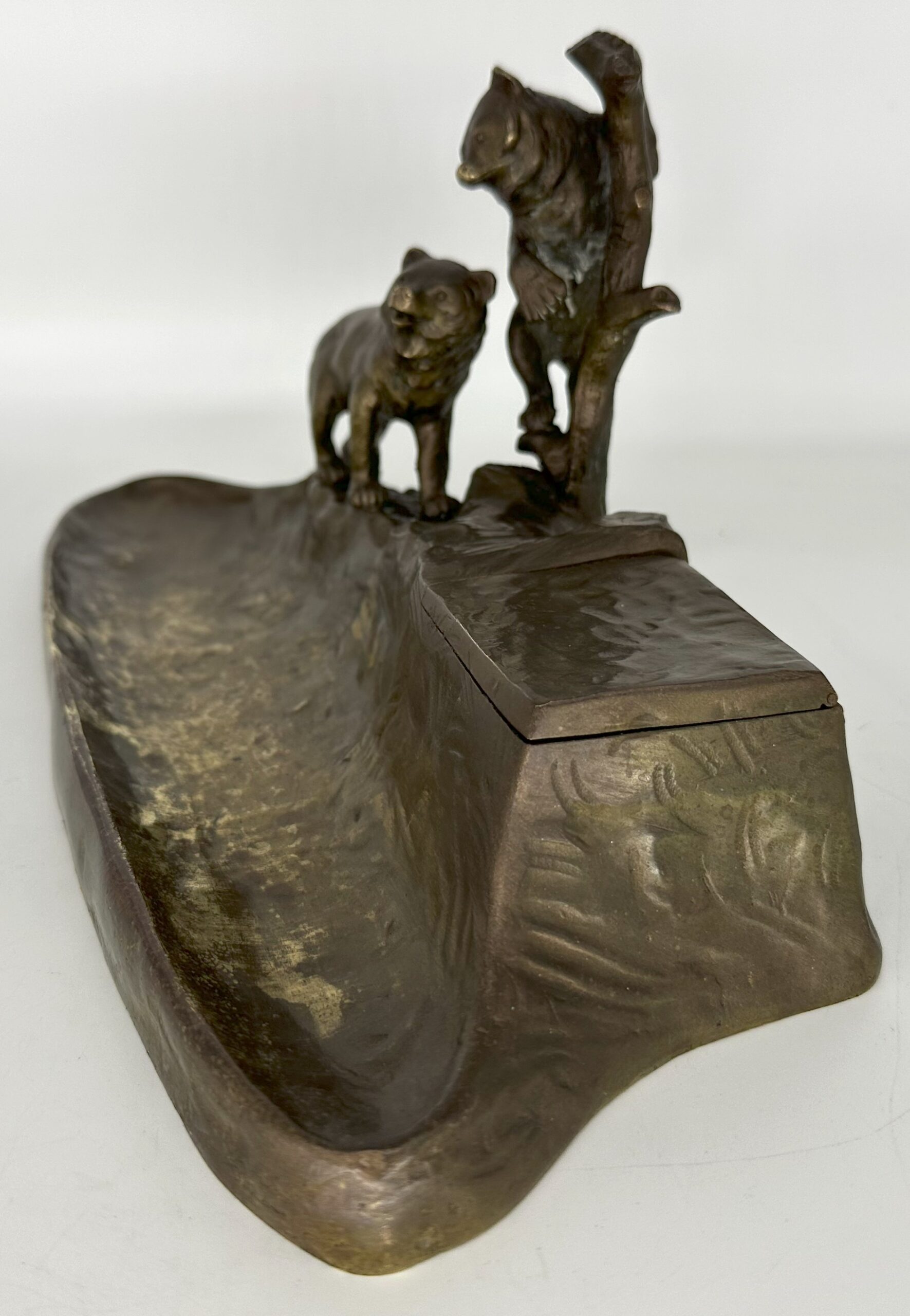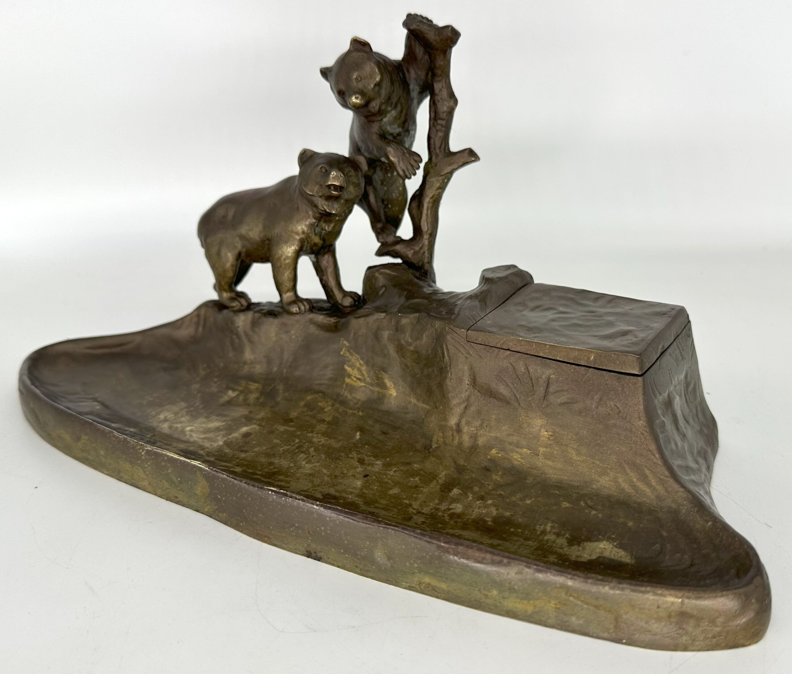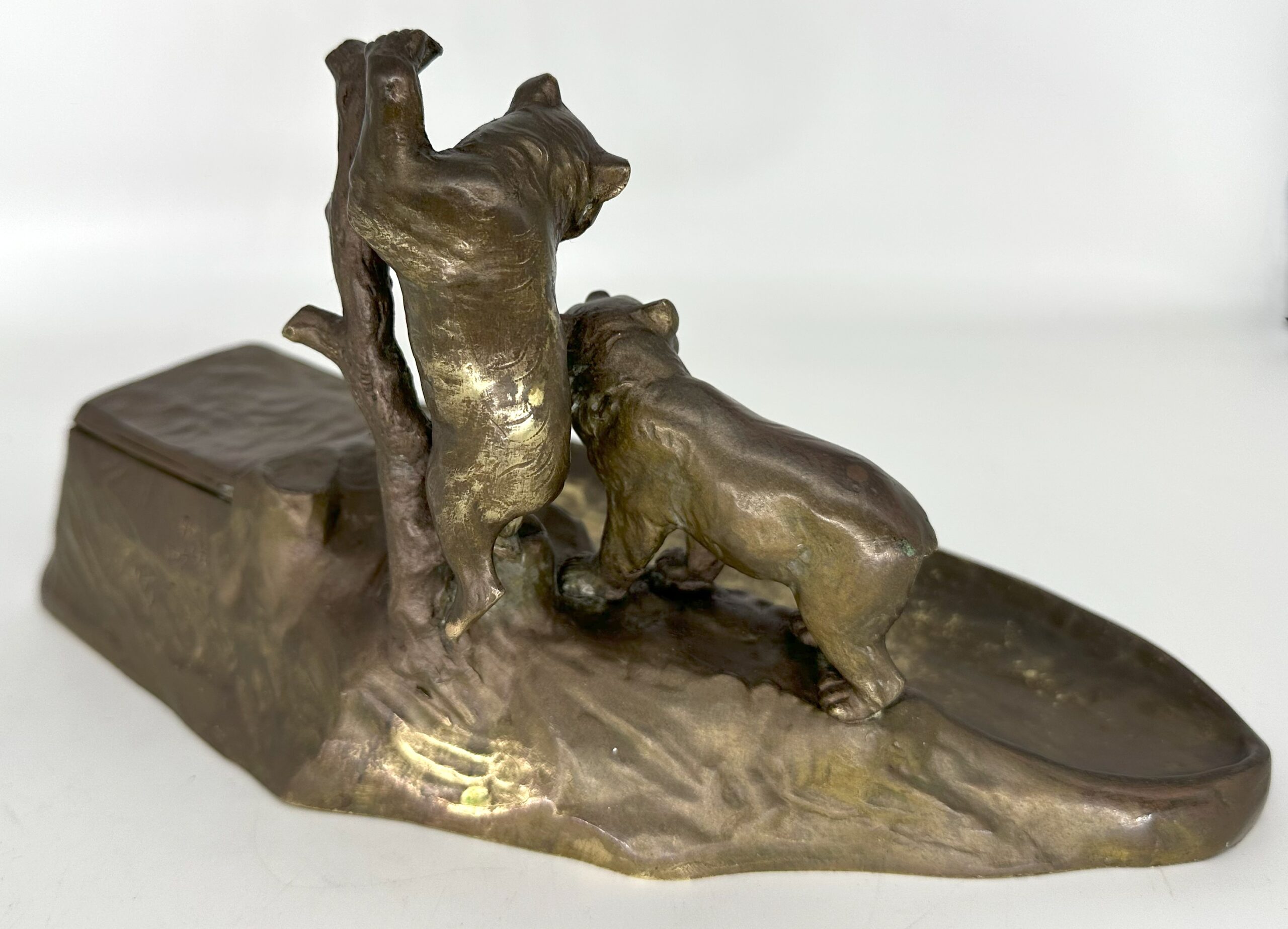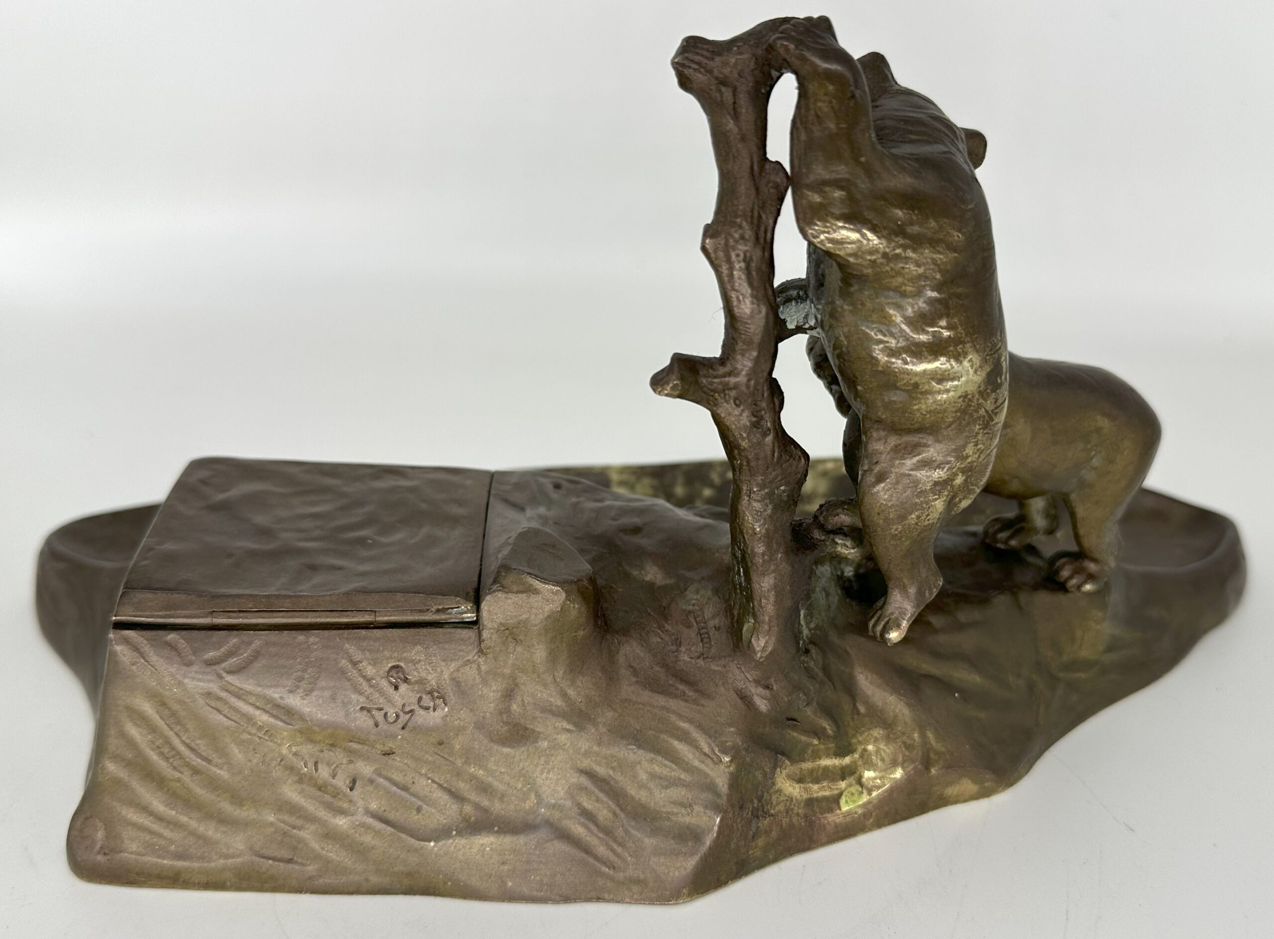 This Austrian bronze inkstand features two bears in a naturalistic setting—one bear is climbing a tree, while the other stands on the ground. The base is designed to resemble rocky terrain with the inkwell blended into the design. The piece is marked “TUSCA,” and it also bears a foundry mark: the letter K inside an upside-down horseshoe.