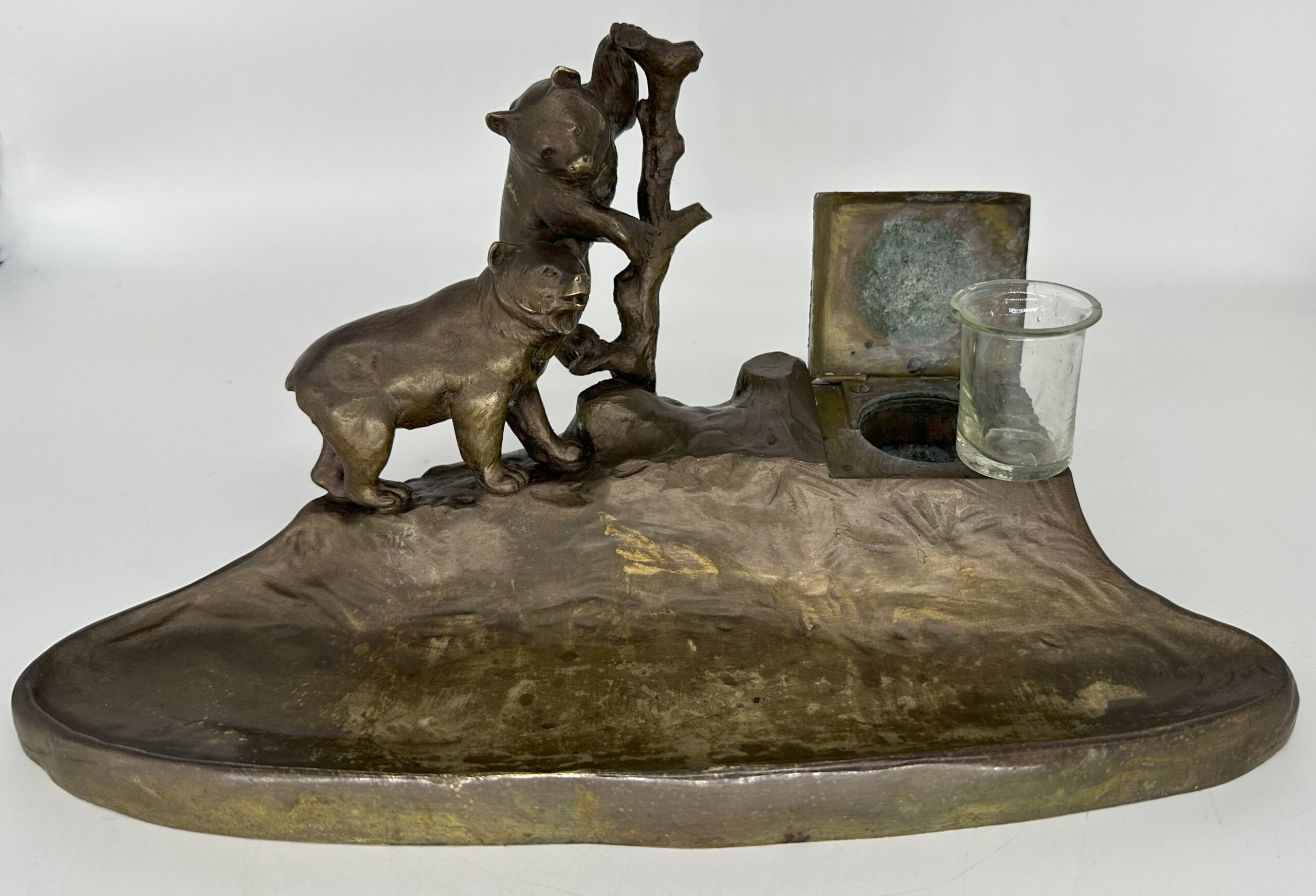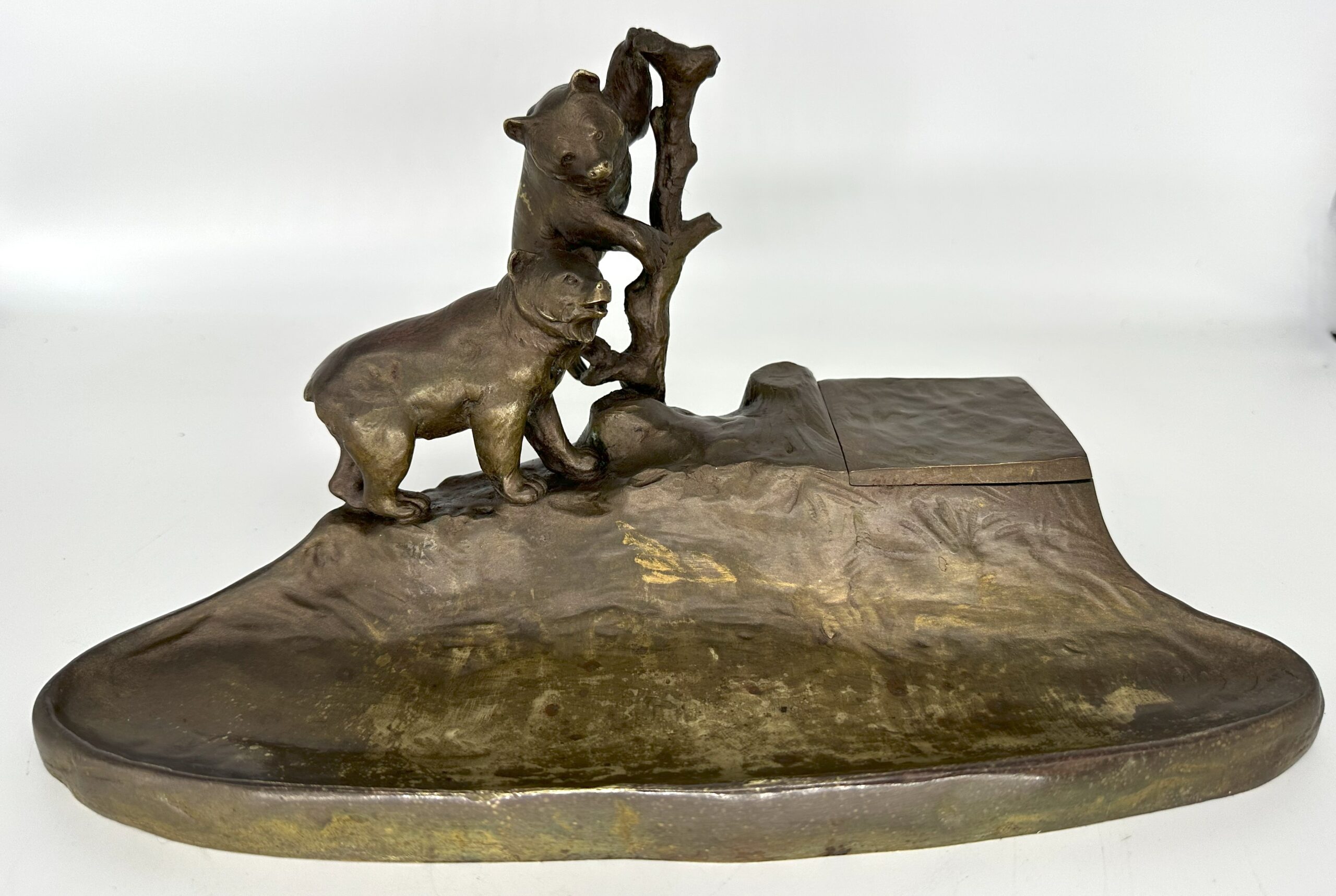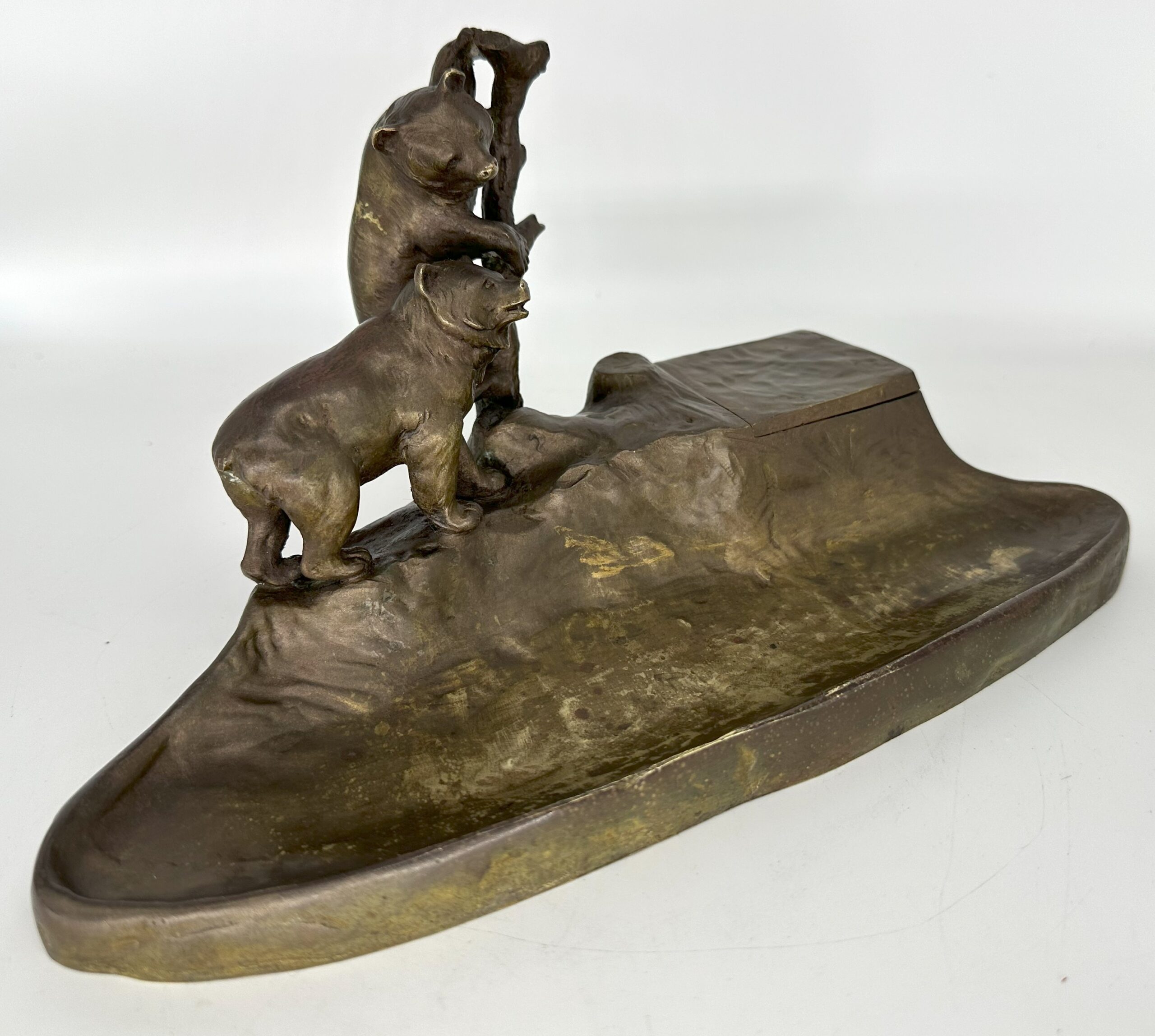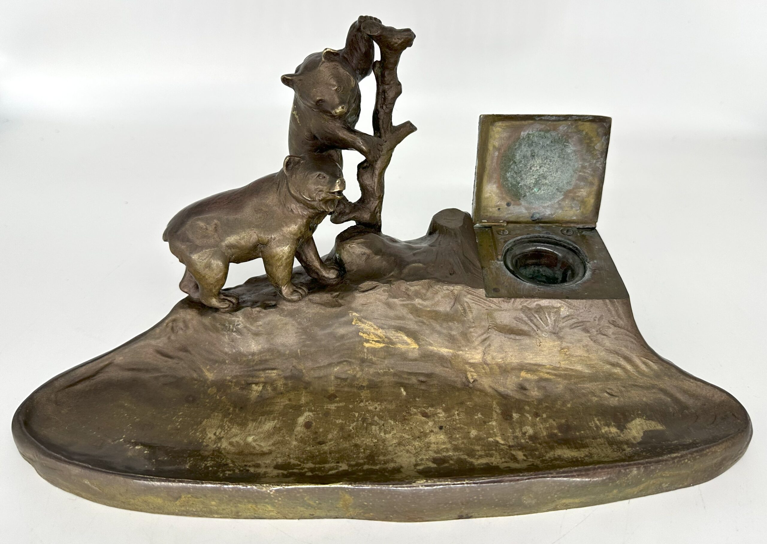 This Austrian bronze inkstand features two bears in a naturalistic setting—one bear is climbing a tree, while the other stands on the ground. The base is designed to resemble rocky terrain with the inkwell blended into the design. The piece is marked “TUSCA,” and it also bears a foundry mark: the letter K inside an upside-down horseshoe.