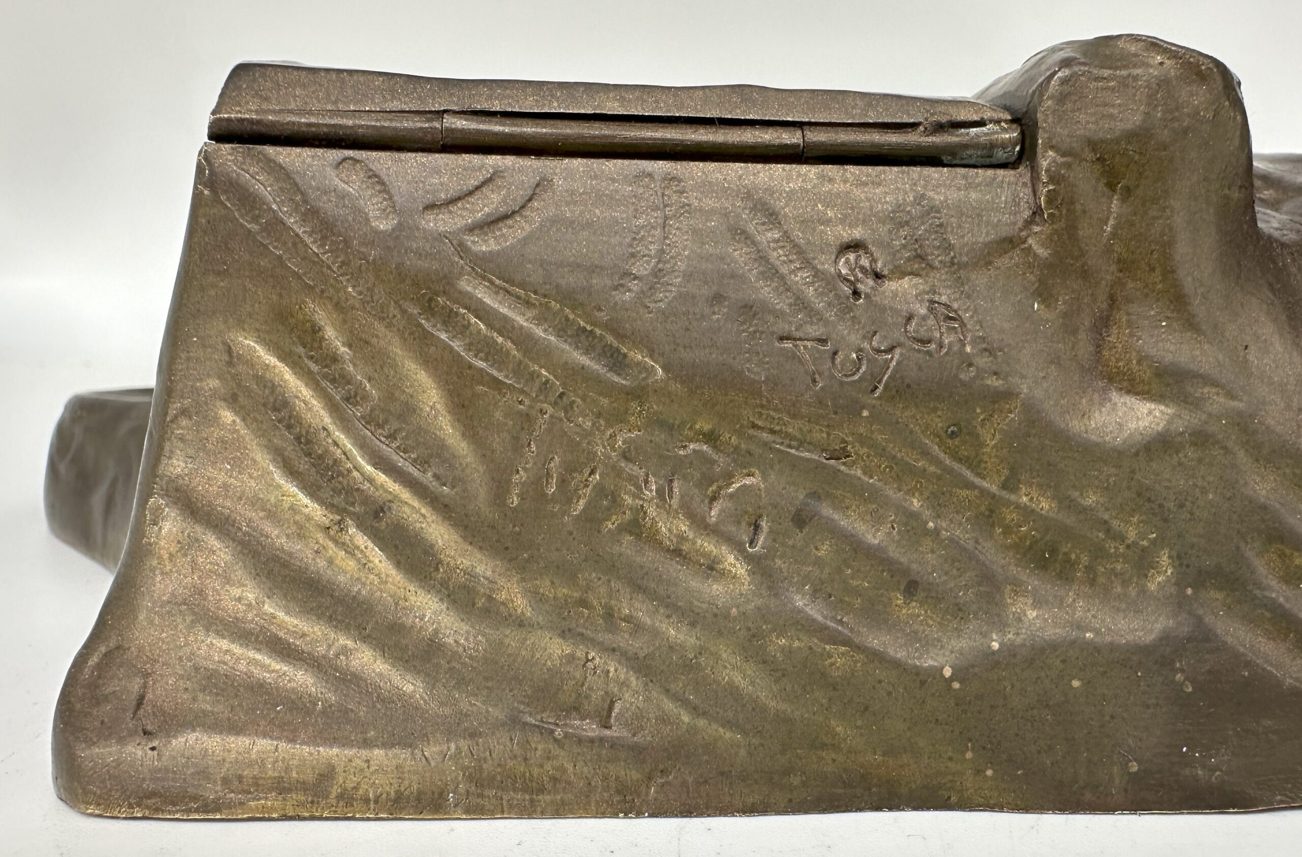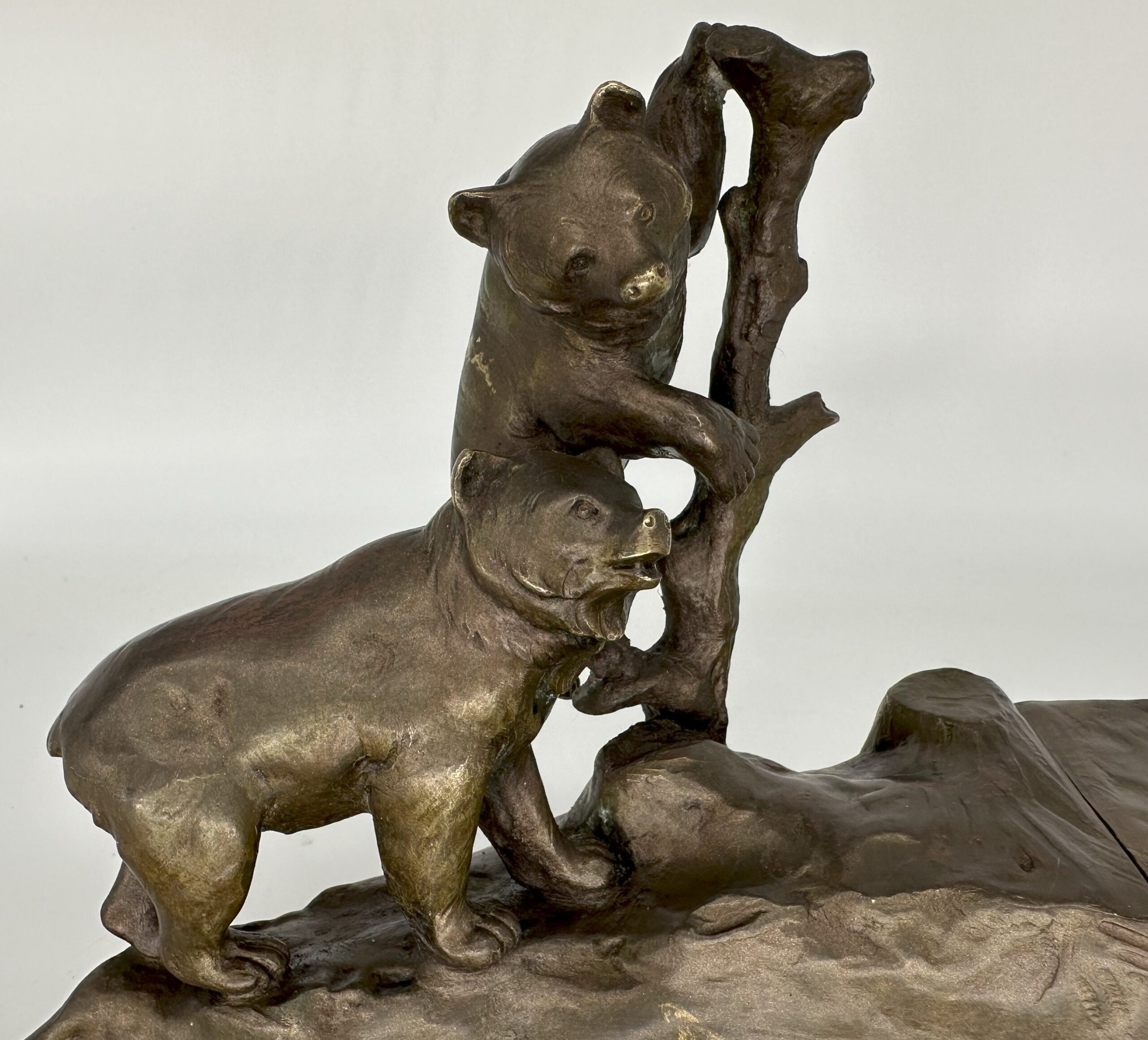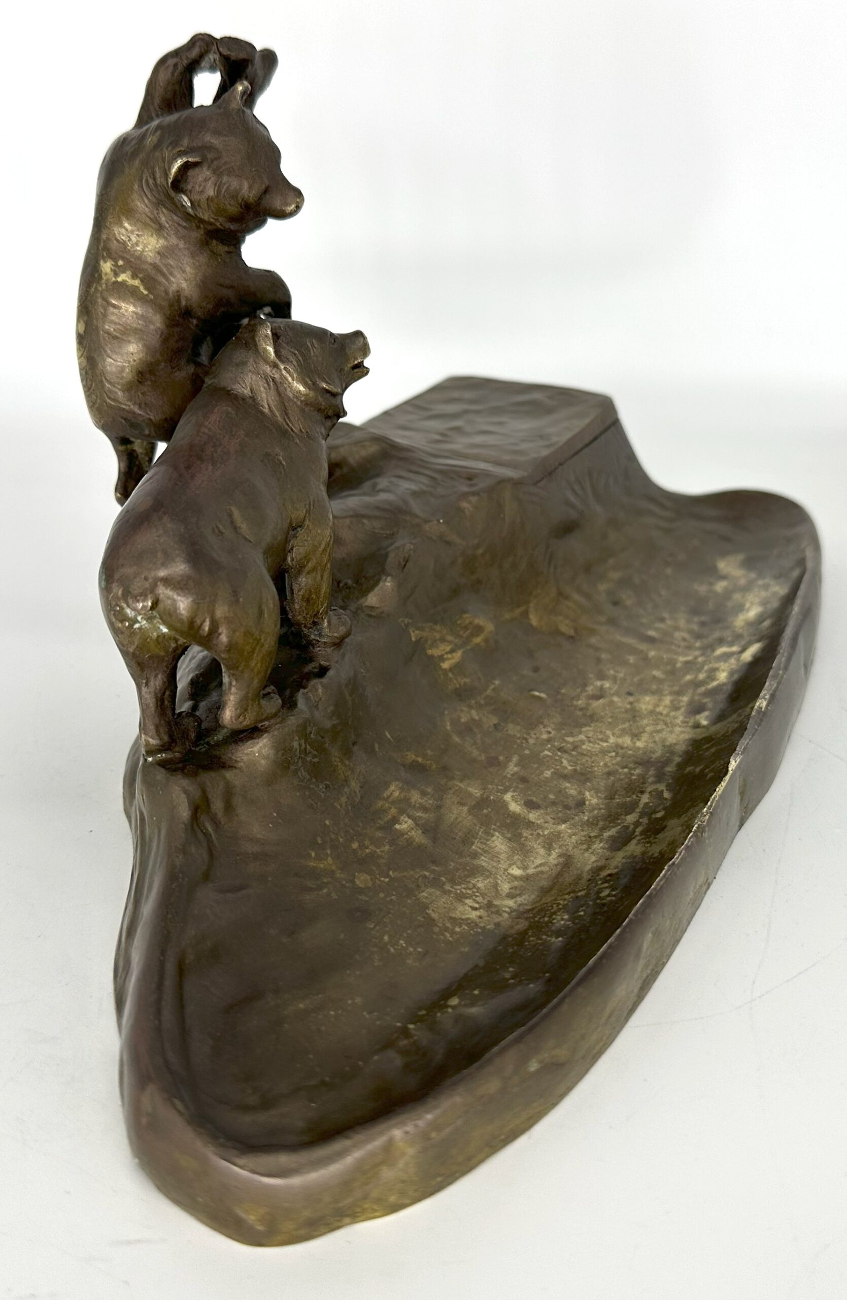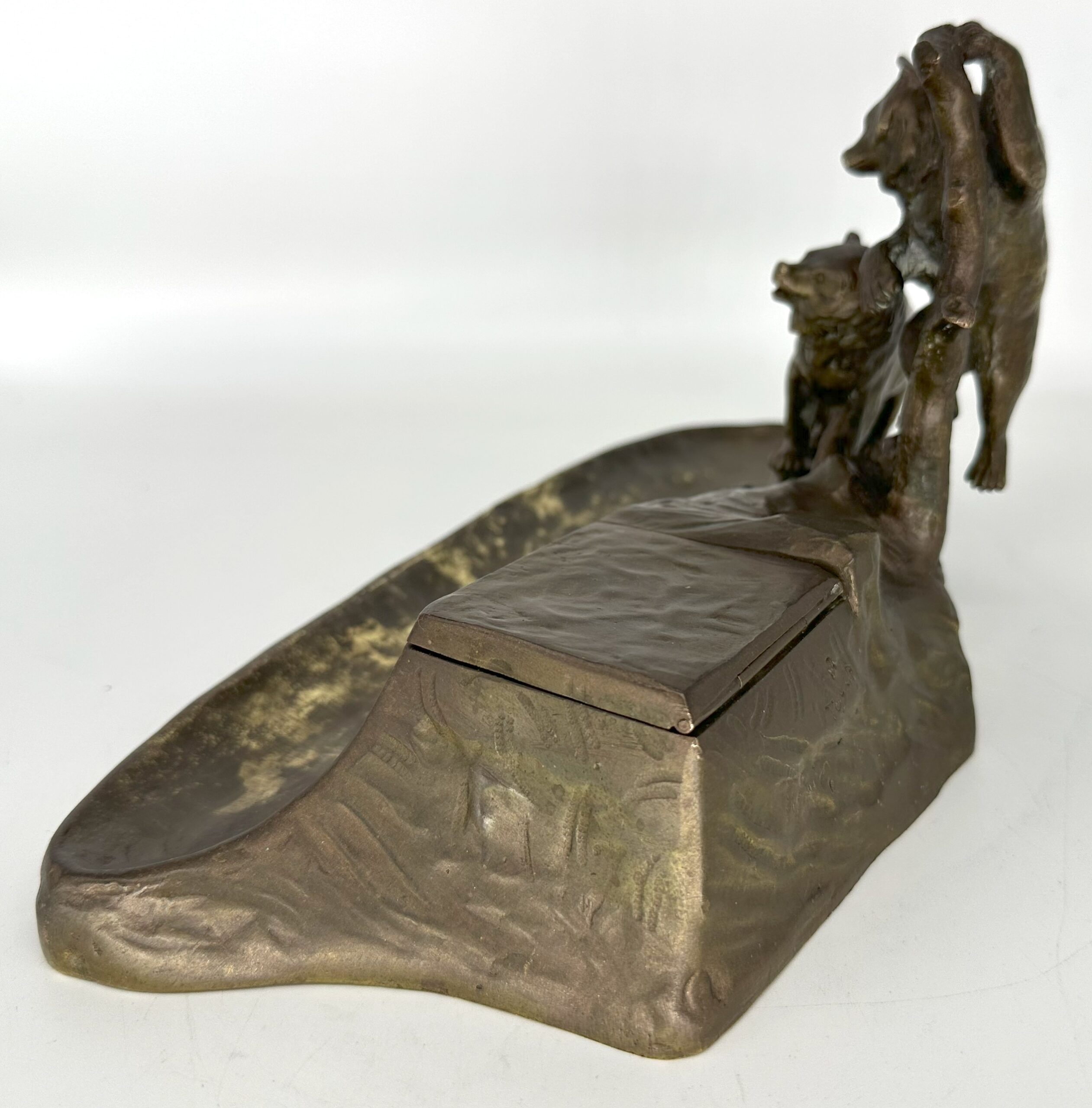This Austrian bronze inkstand features two bears in a naturalistic setting—one bear is climbing a tree, while the other stands on the ground. The base is designed to resemble rocky terrain with the inkwell blended into the design. The piece is marked “TUSCA,” and it also bears a foundry mark: the letter K inside an upside-down horseshoe.