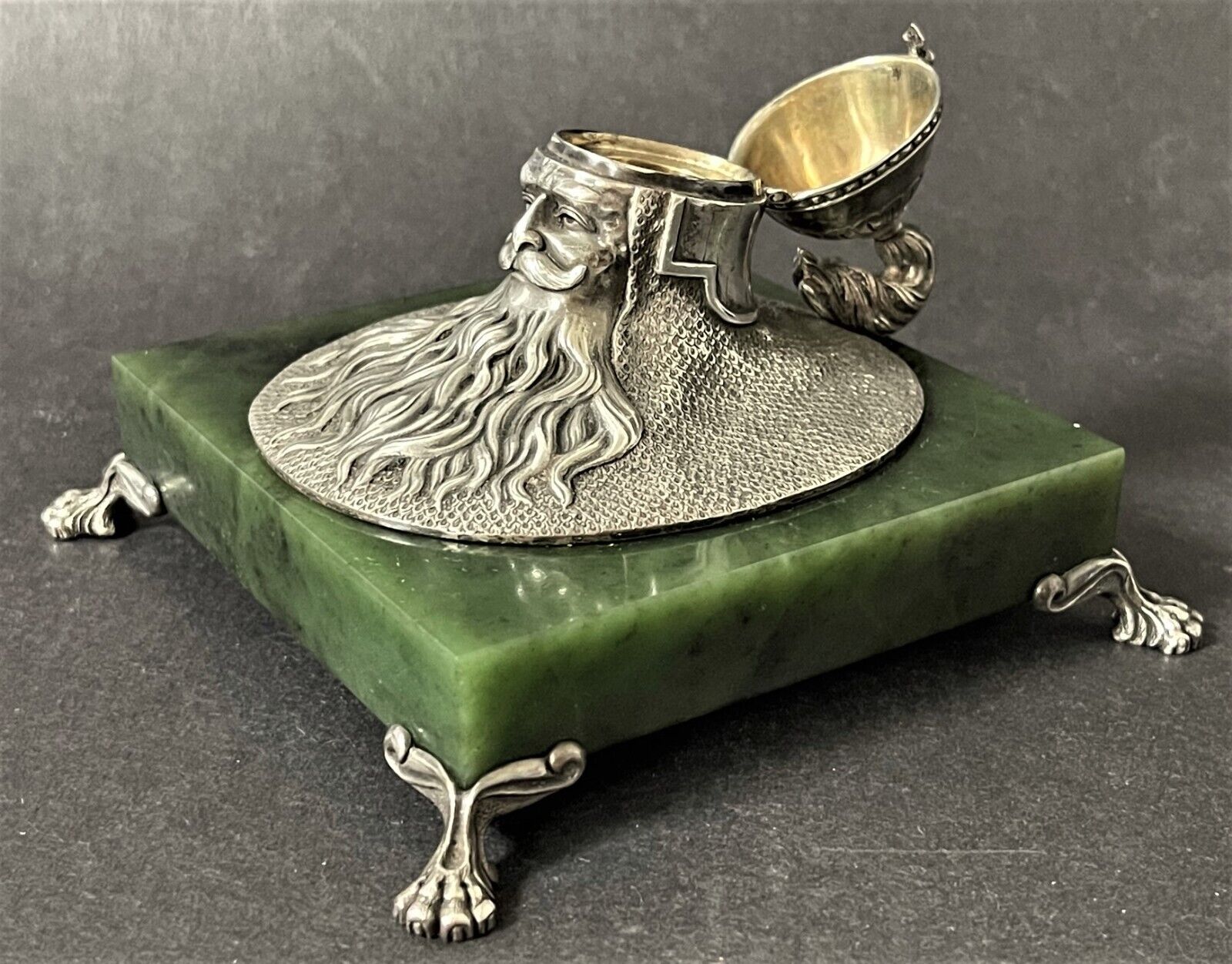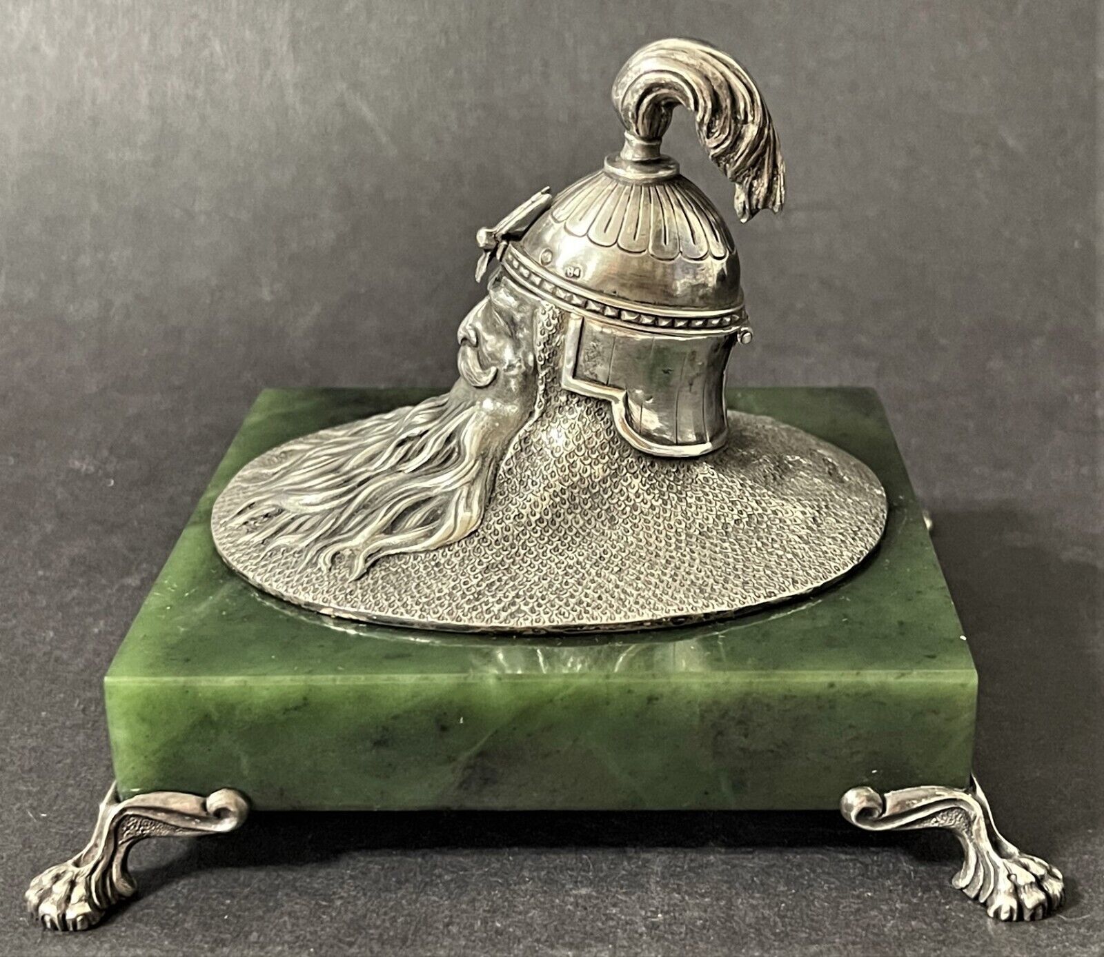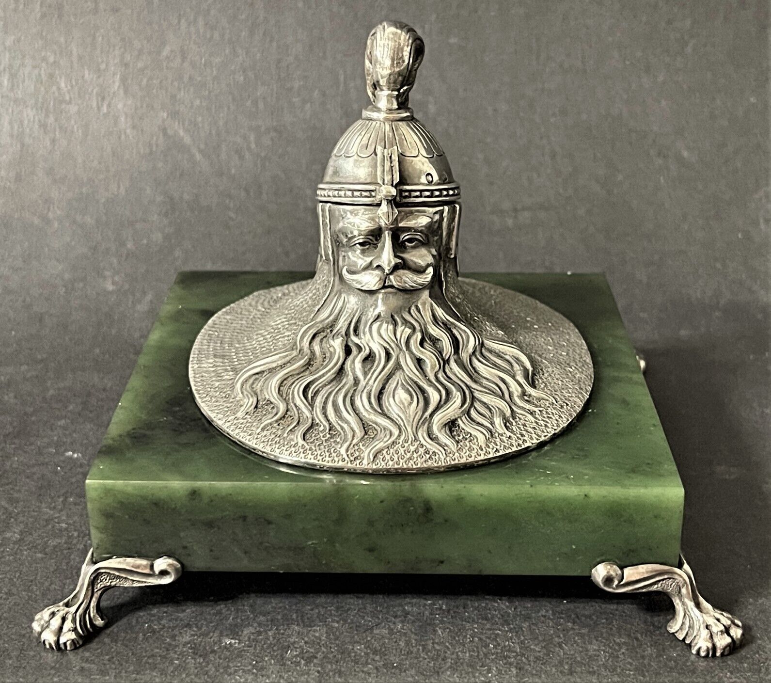 19th Century Imperial Russian inkwell made by one of the most prominent Russian silversmiths, Ivan Khlebnikov. A square base of polished jade is mounted on four silver legs in the shape of lion’s paws. The upper part is made of silver in the shape of a Russian bogatyr’s head; the upper part of the head with a helmet opens. Inside is a hollow gilded ink container.