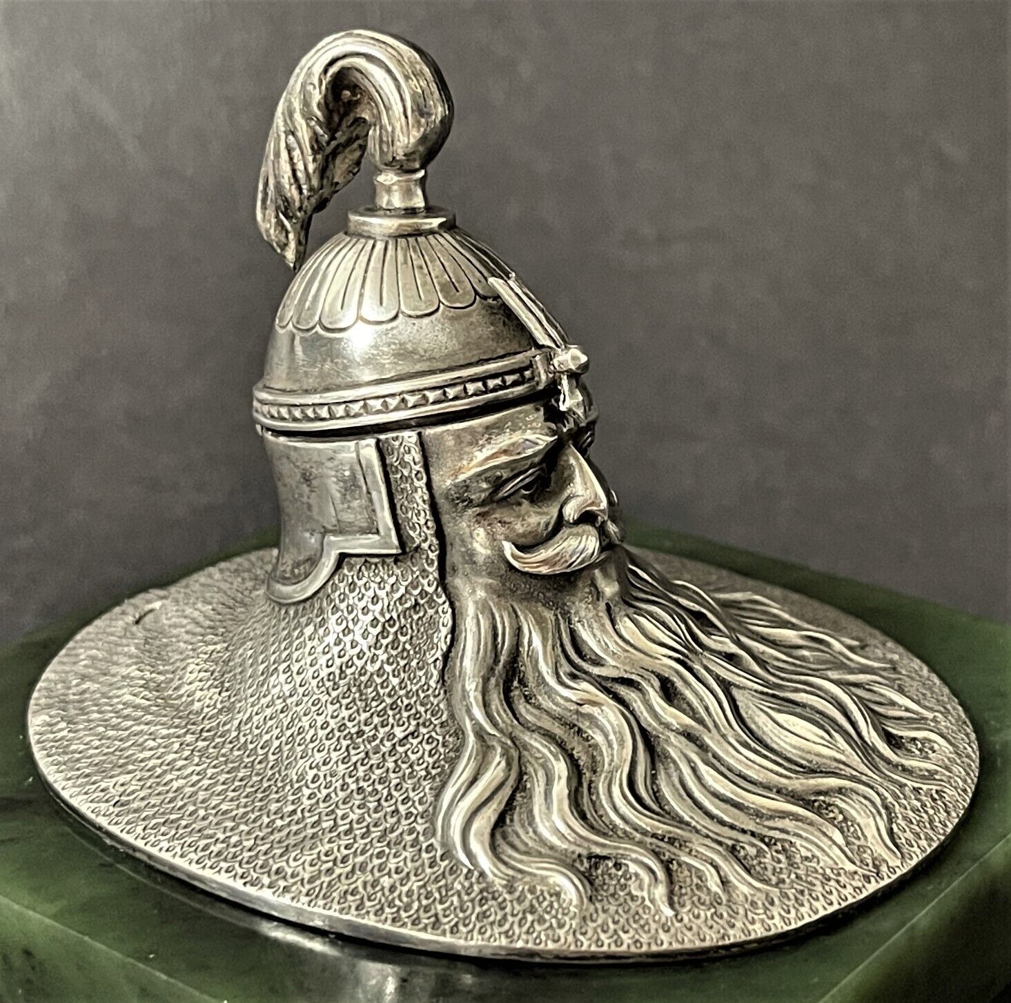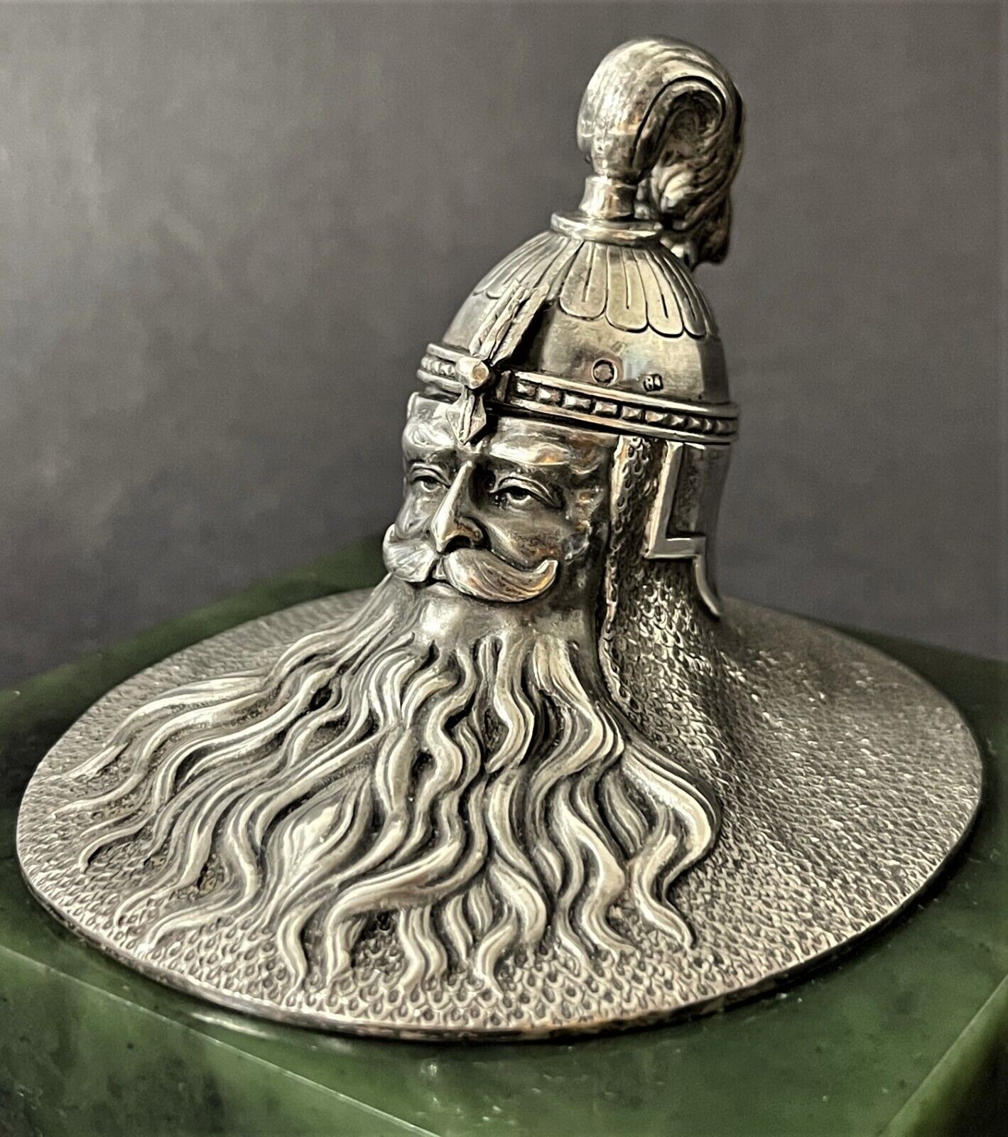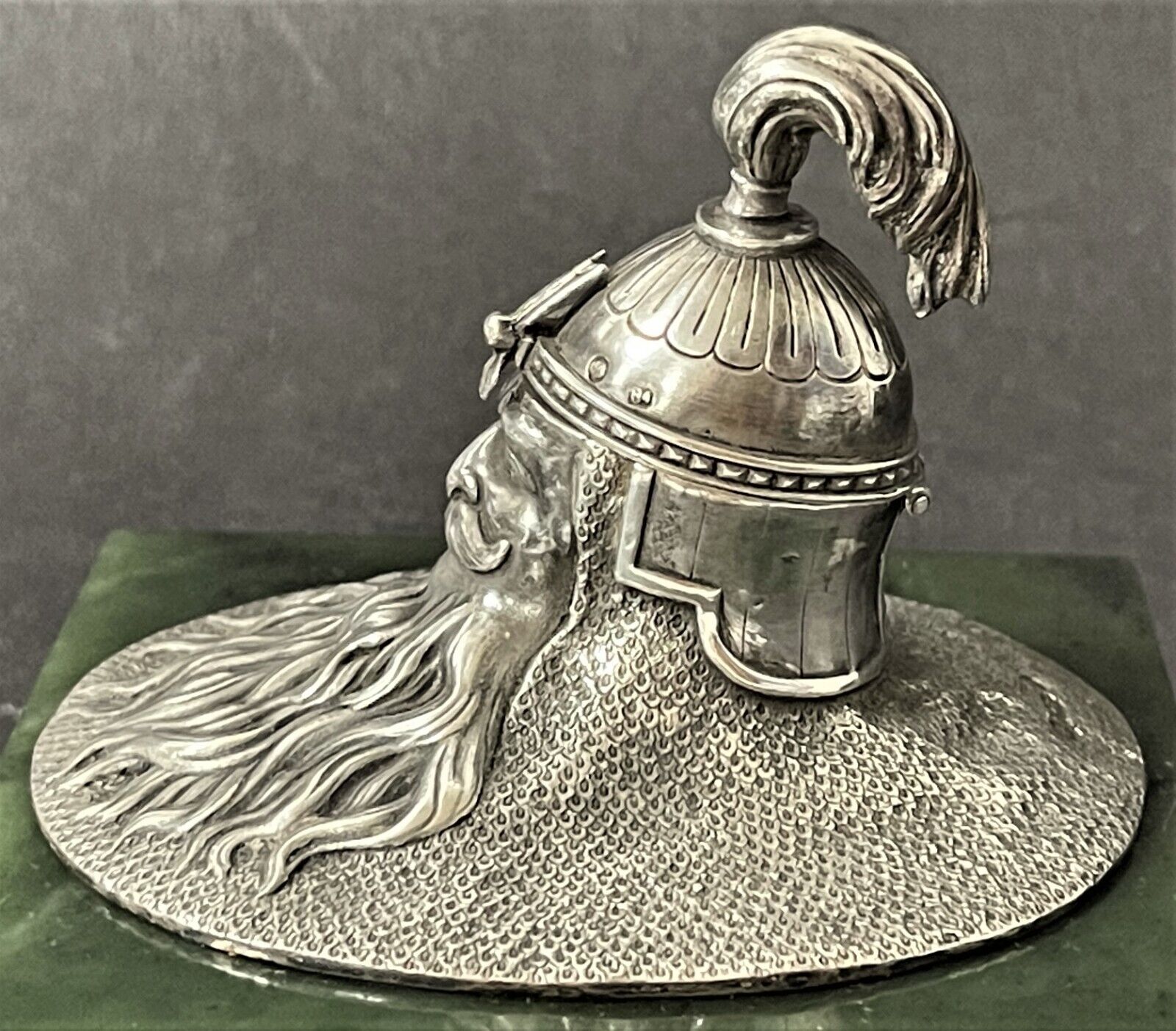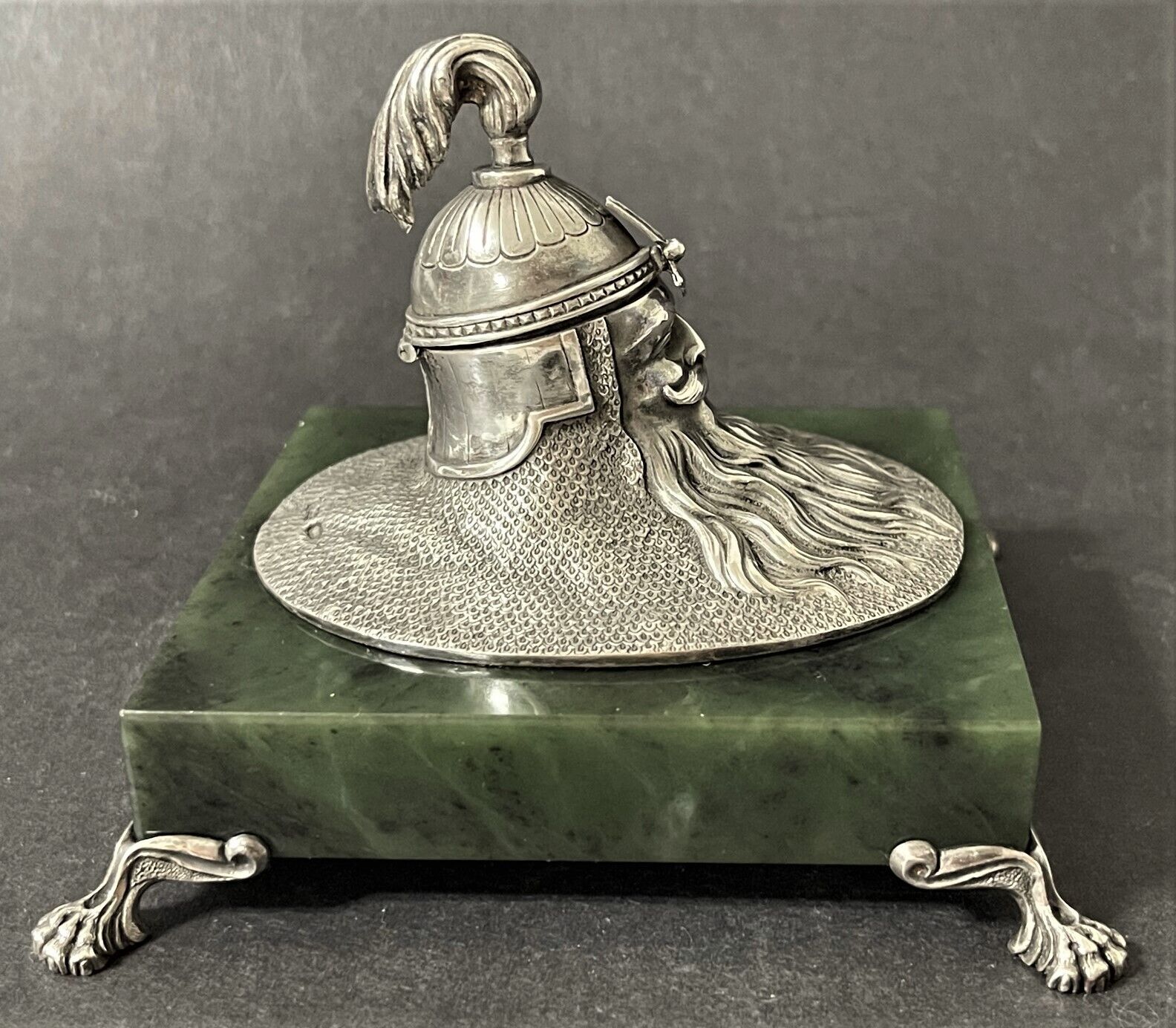 19th Century Imperial Russian inkwell made by one of the most prominent Russian silversmiths, Ivan Khlebnikov. A square base of polished jade is mounted on four silver legs in the shape of lion’s paws. The upper part is made of silver in the shape of a Russian bogatyr’s head; the upper part of the head with a helmet opens. Inside is a hollow gilded ink container.