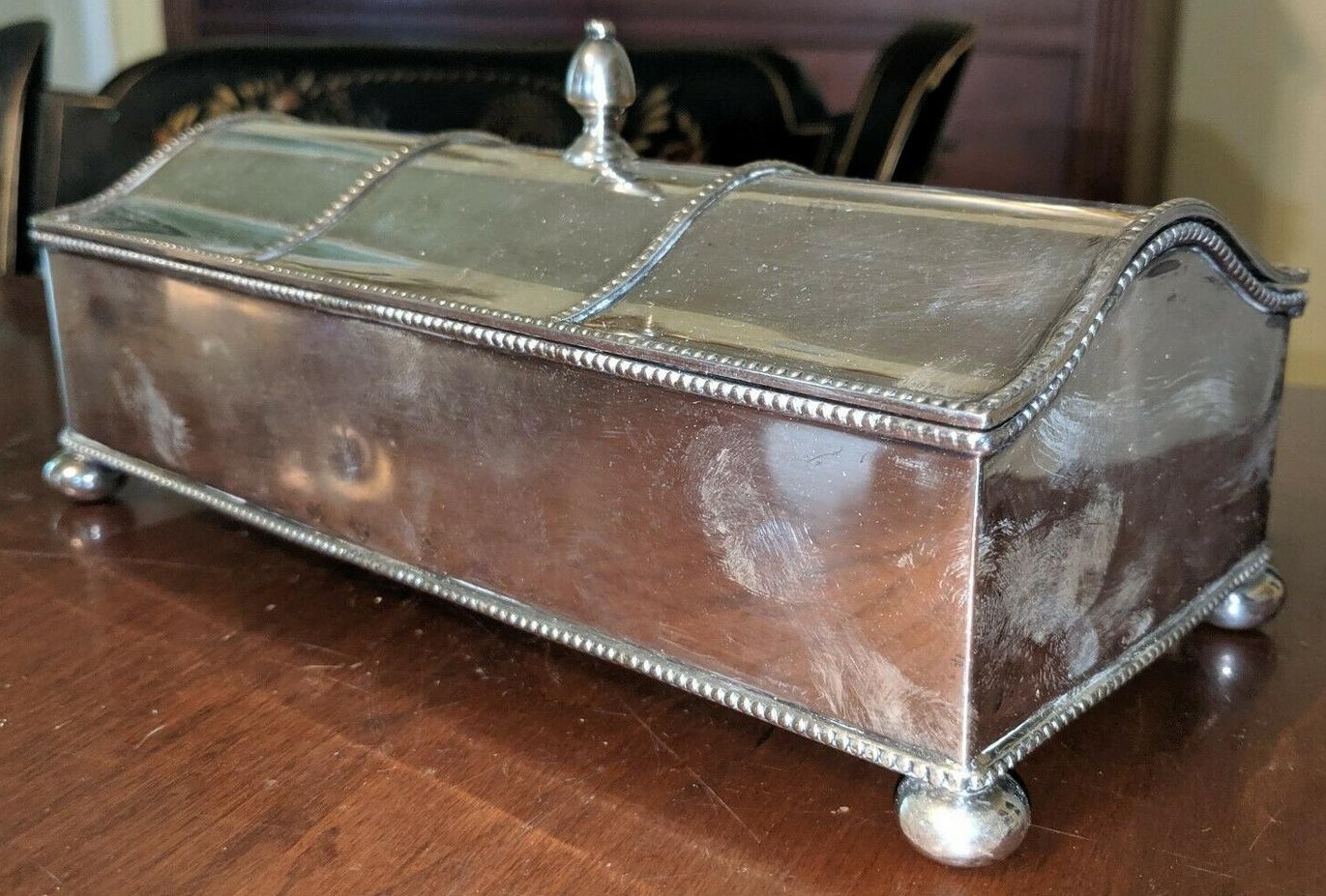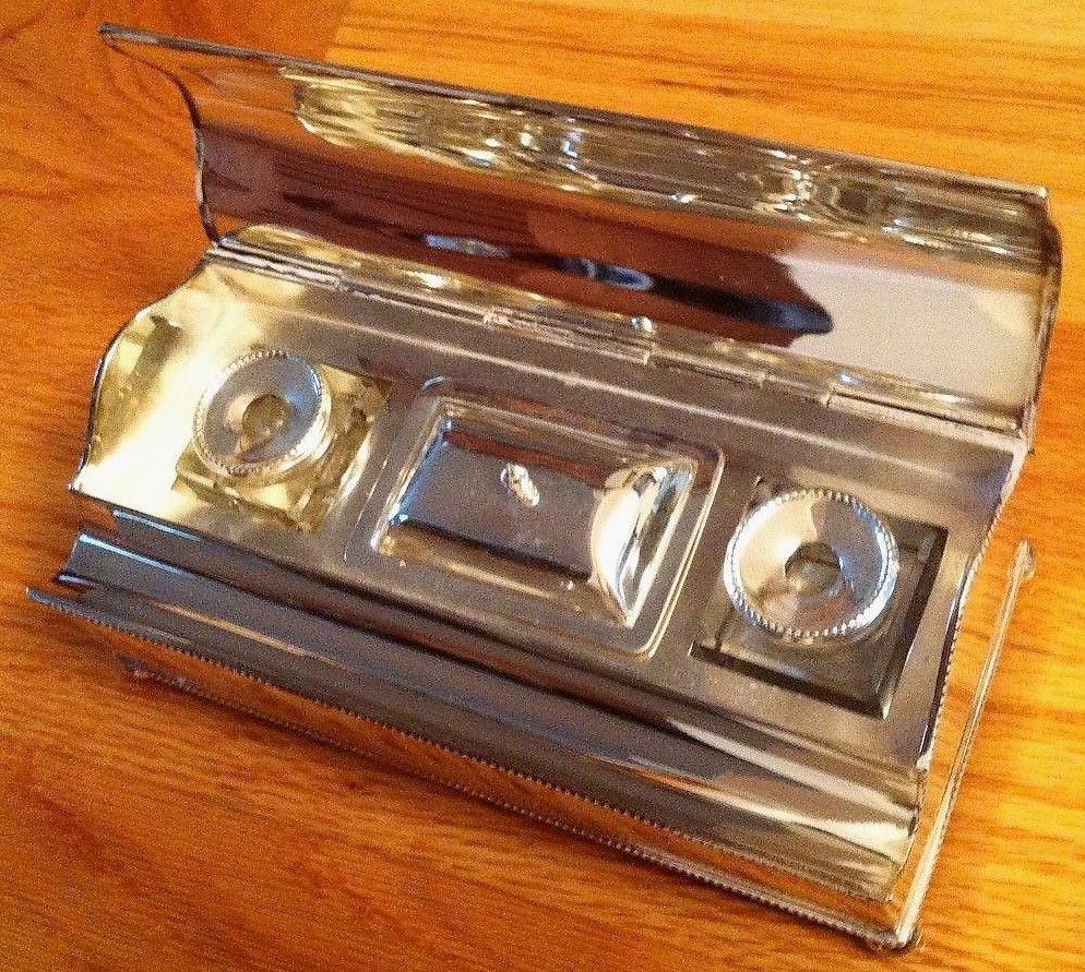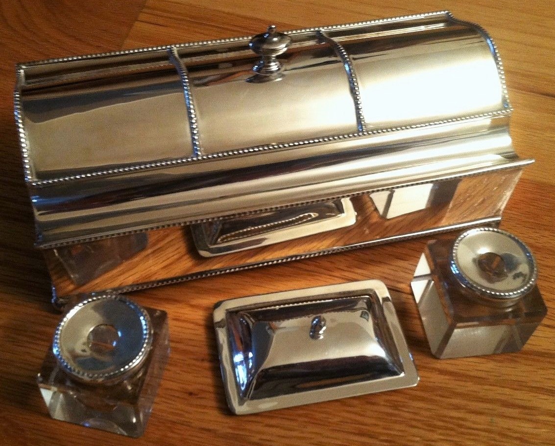 Casket style inkstand with hinged lid and ball feet.  The inside contains two glass inkwells with silver tops, and a lidded storage compartment. The inkstand features a pen groove on the lid and decorative edging detail. Thought to be Israel Freeman & son founded c1928. The bottom is marked “made in England” with a hallmark of an arm holding a hammer.