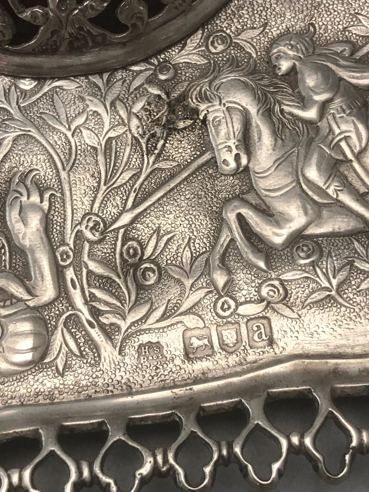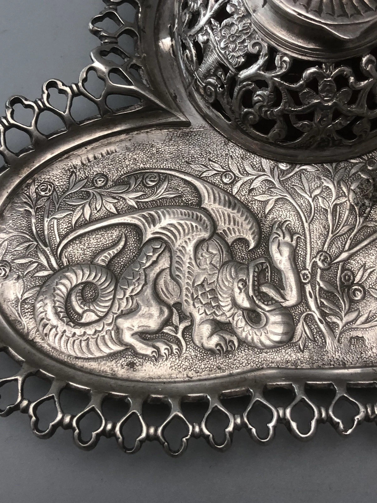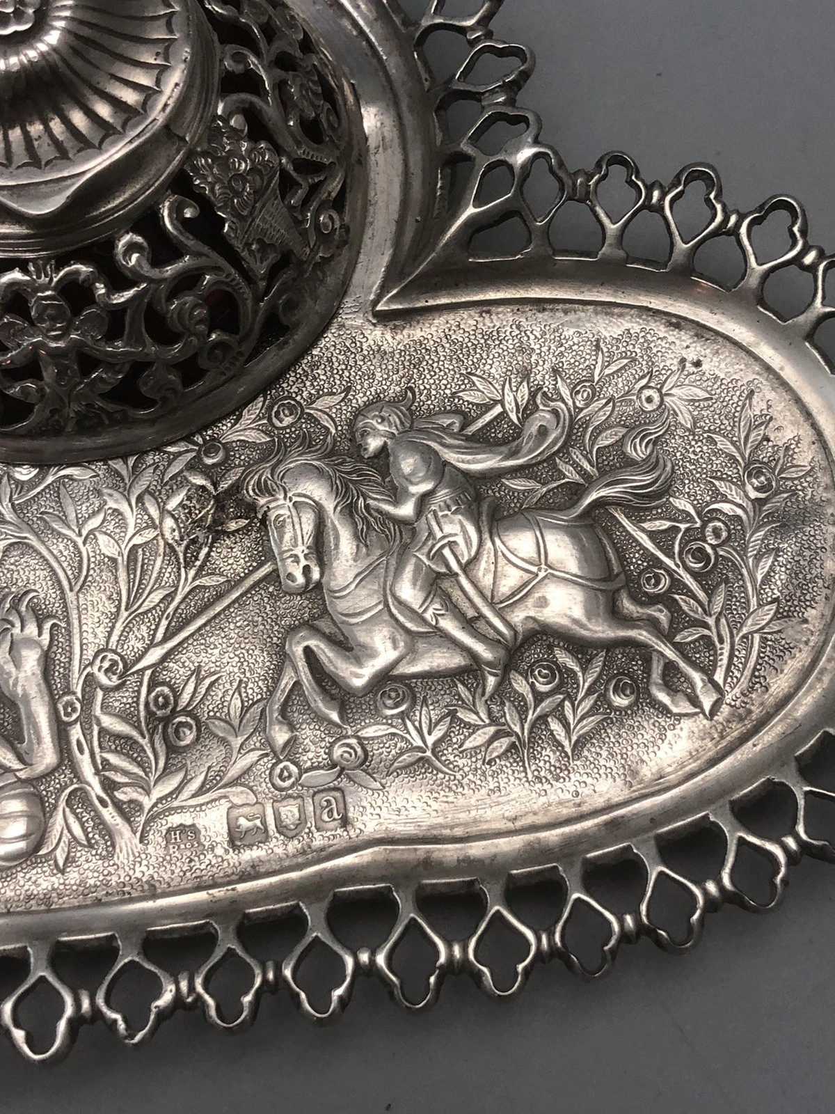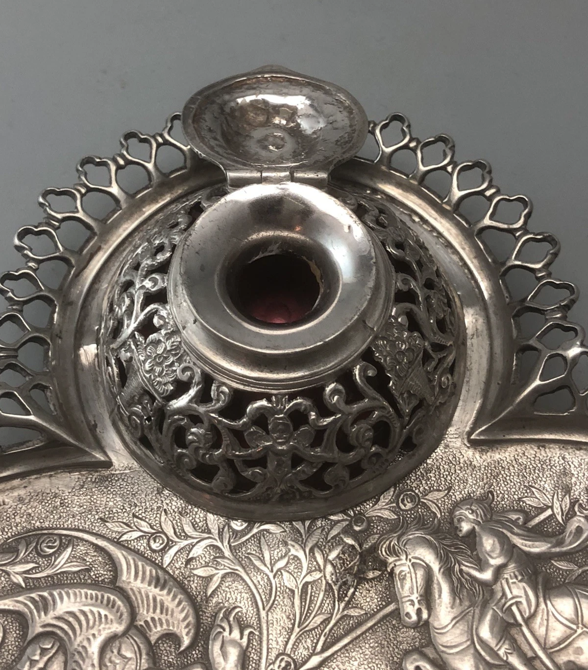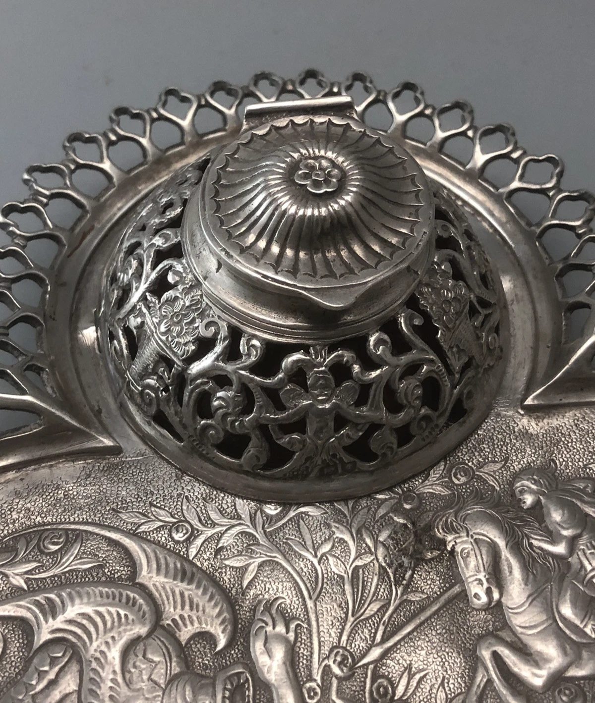 - Central Design: The inkstand features a highly detailed, chased, and embossed scene of a classical rider (knight) armed with a spear, in the heat of a hunt or battle against a mythical dragon-like beast. The scene is set in a lush, pastoral landscape with rose-like floral clusters.