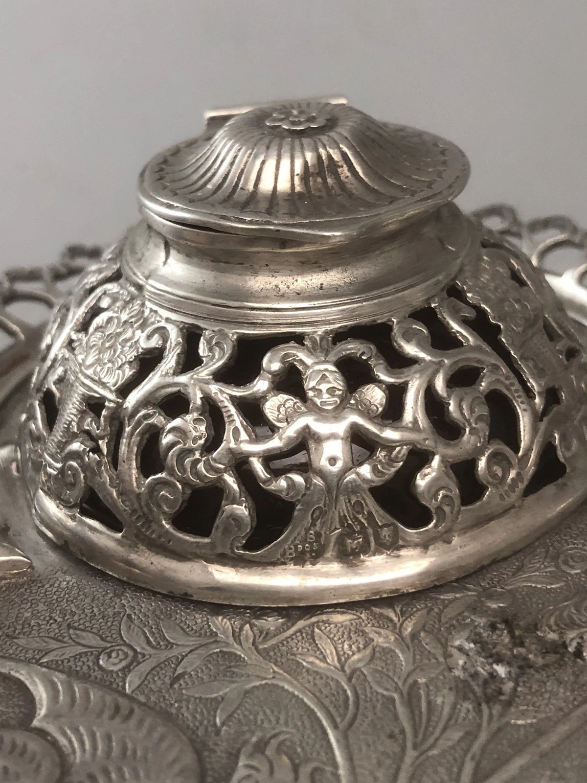 This ornate sterling silver inkstand is an example of Victorian “Late Romantic” silverwork, produced by a short-lived but prestigious London firm.