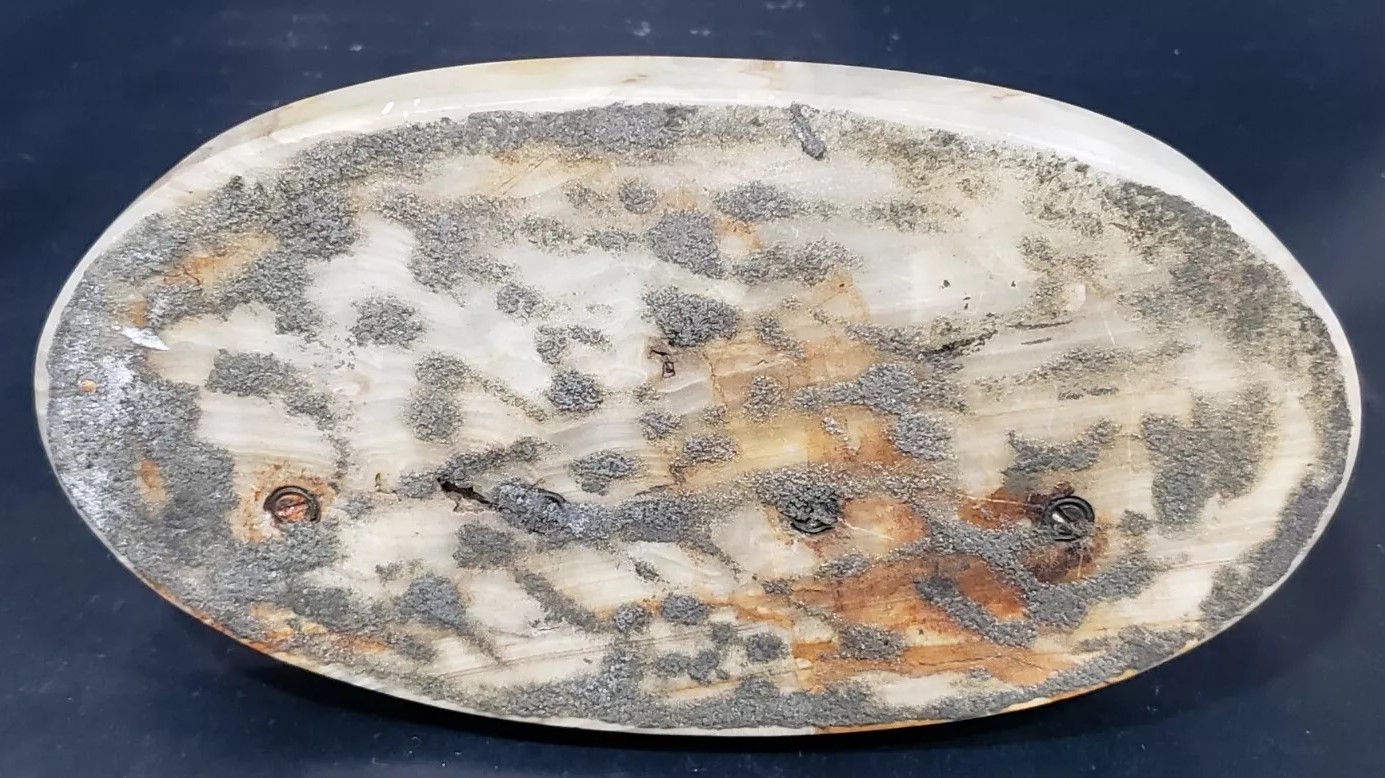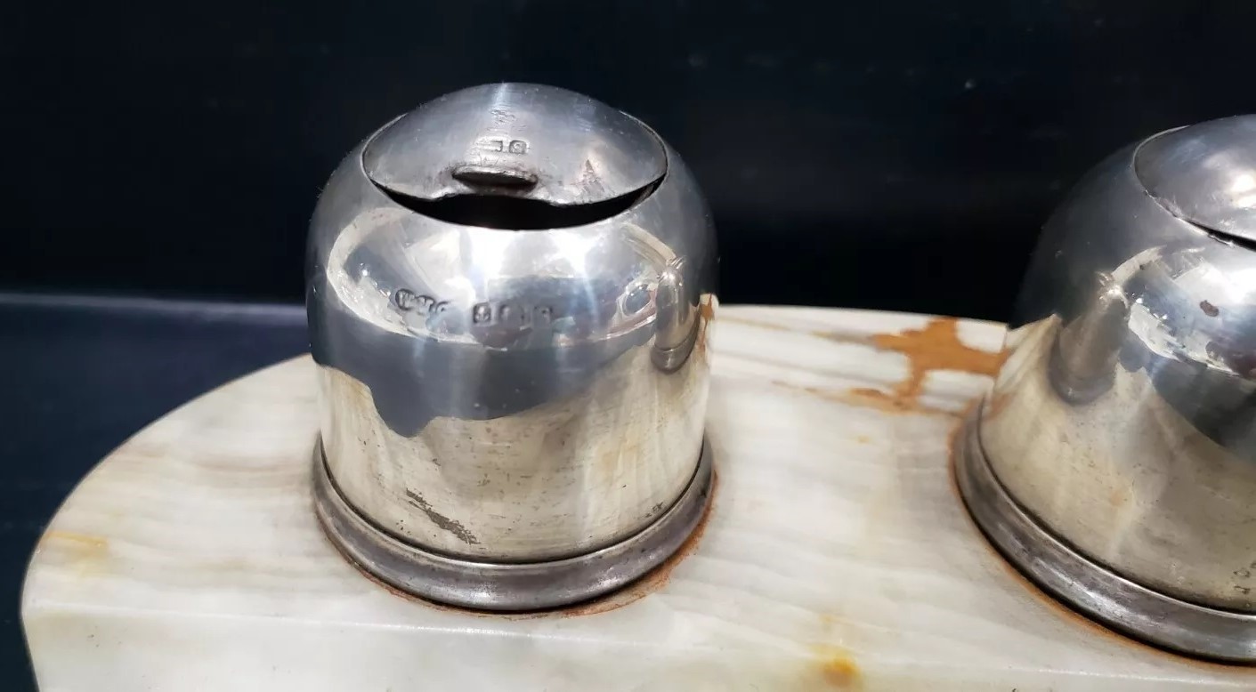 The Wilmott Manufacturing Company made this inkstand. The base, made of marble, has a pen channel. The two cylindrical inkwells feature a unique spring-loaded, roll-back dome cover mechanism. This design allows the covers to recede smoothly into the inkwells when the tab is pushed and glide back into place when pulled. The silver parts are hallmarked with the Birmingham assay office mark, the lion silver mark, and the date letter “S” indicating the year 1917.