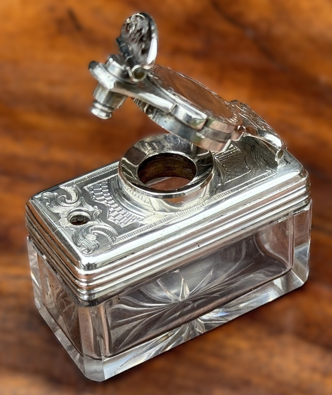 - The Internal Seal: The underside of the silver lid contains its original cork stopper, which is held in place by a small silver plate. The pressure from the screw forces this stopper into the neck of the glass well, creating an airtight, vacuum-tight seal that prevents ink from escaping even if the well is turned upside down.
