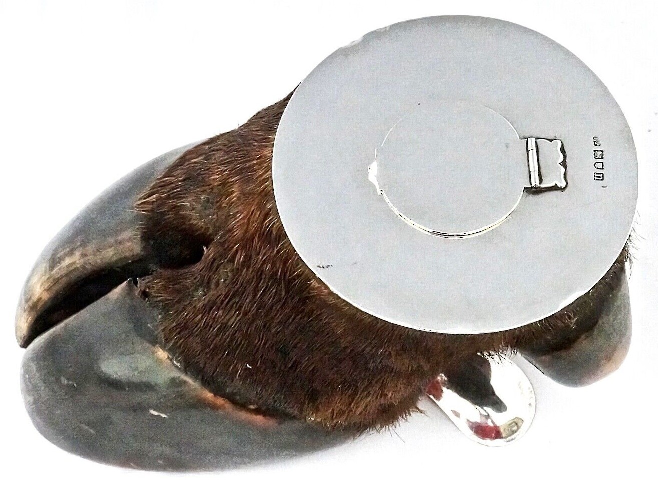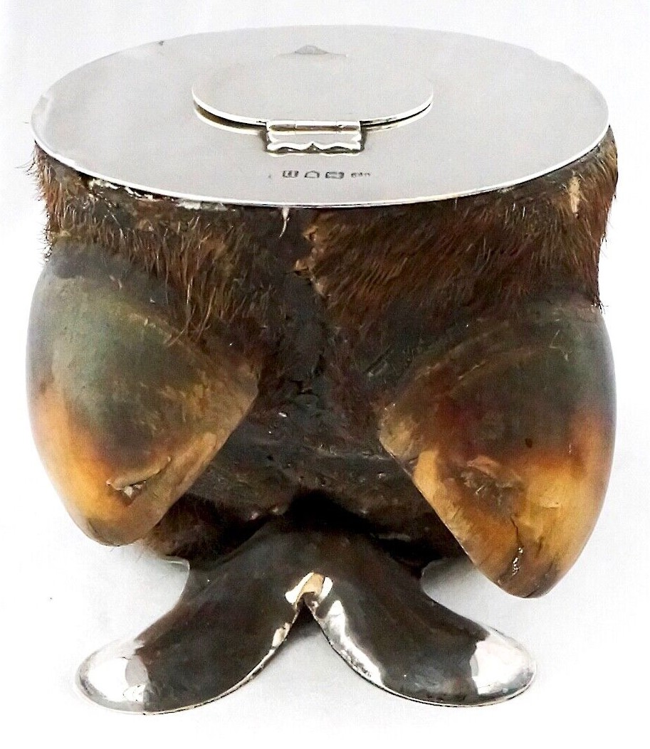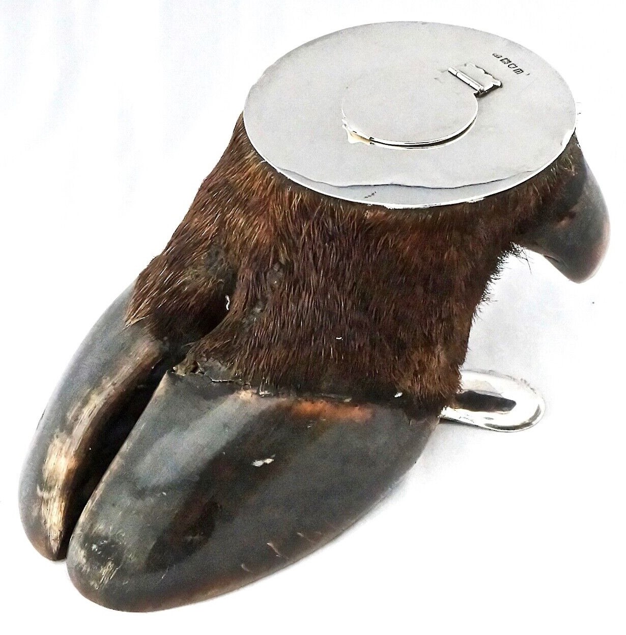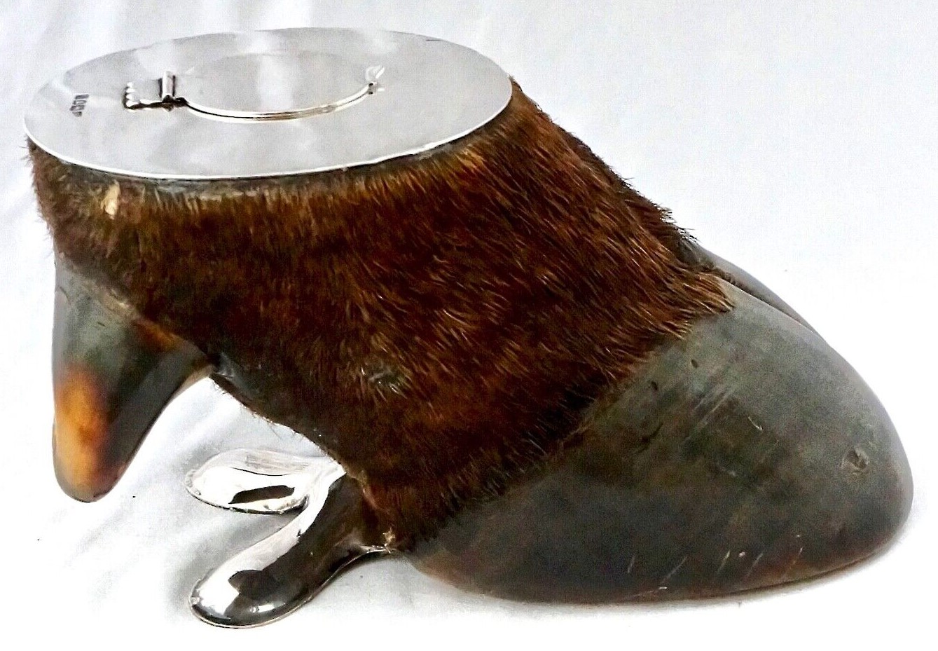 Unusual solid silver mounted bull’s hoof which has been converted to an inkwell with an original blue glass insert. Horse hooves were commonly converted into inkwells in Victorian & Edwardian times, but bulls’ hooves are much rarer. Both upper silver fittings are hallmarked for London 1908 by Robert Pringle & Sons. The silver stand fitted to the base is silverplated.